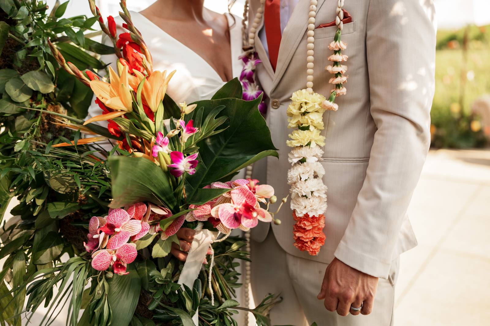 The groom wore a tan suit, with a white undershirt and brown dress shoes. He was accessorized with an orange satin pocket square and tie, as well as an asymmetrical neckpiece composed of florals, wooden beads, and puka shells to keep in line with the tropical theme.