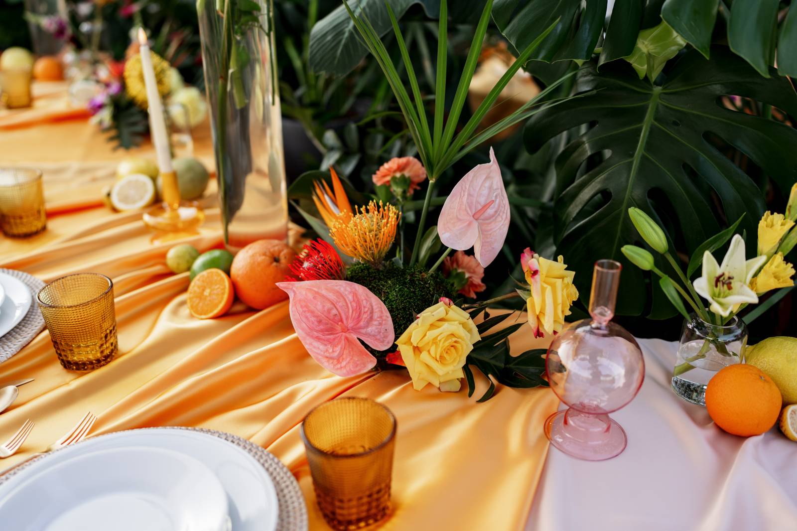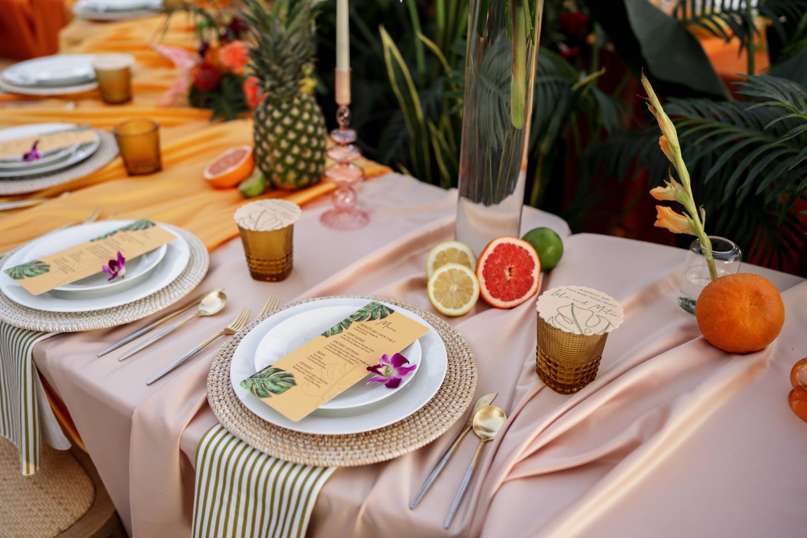 Florals in vases and fruits, such as papayas, lemons, grapefruits, pineapples, limes, and more, served as décor on the tablescape. The design also included tan and green striped linens, woven chargers, white plates, colored crystal glassware, silver and gold silverware, and candles.