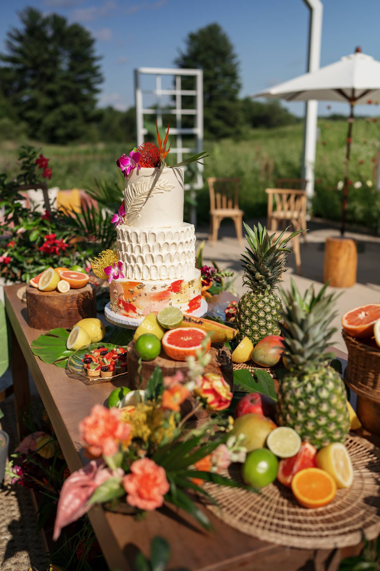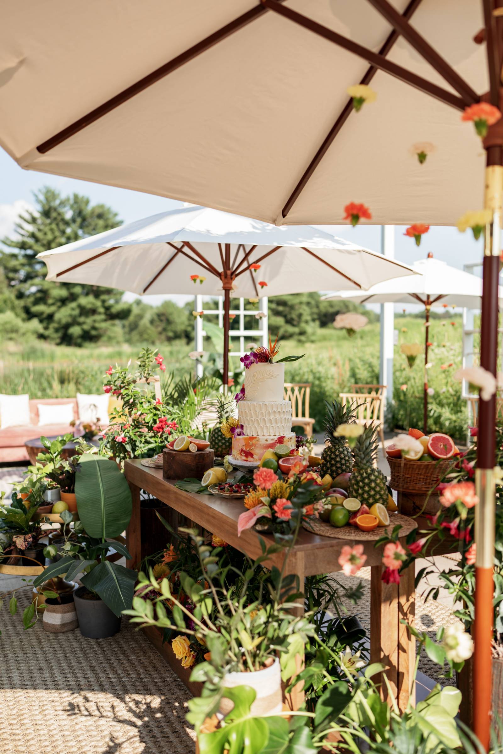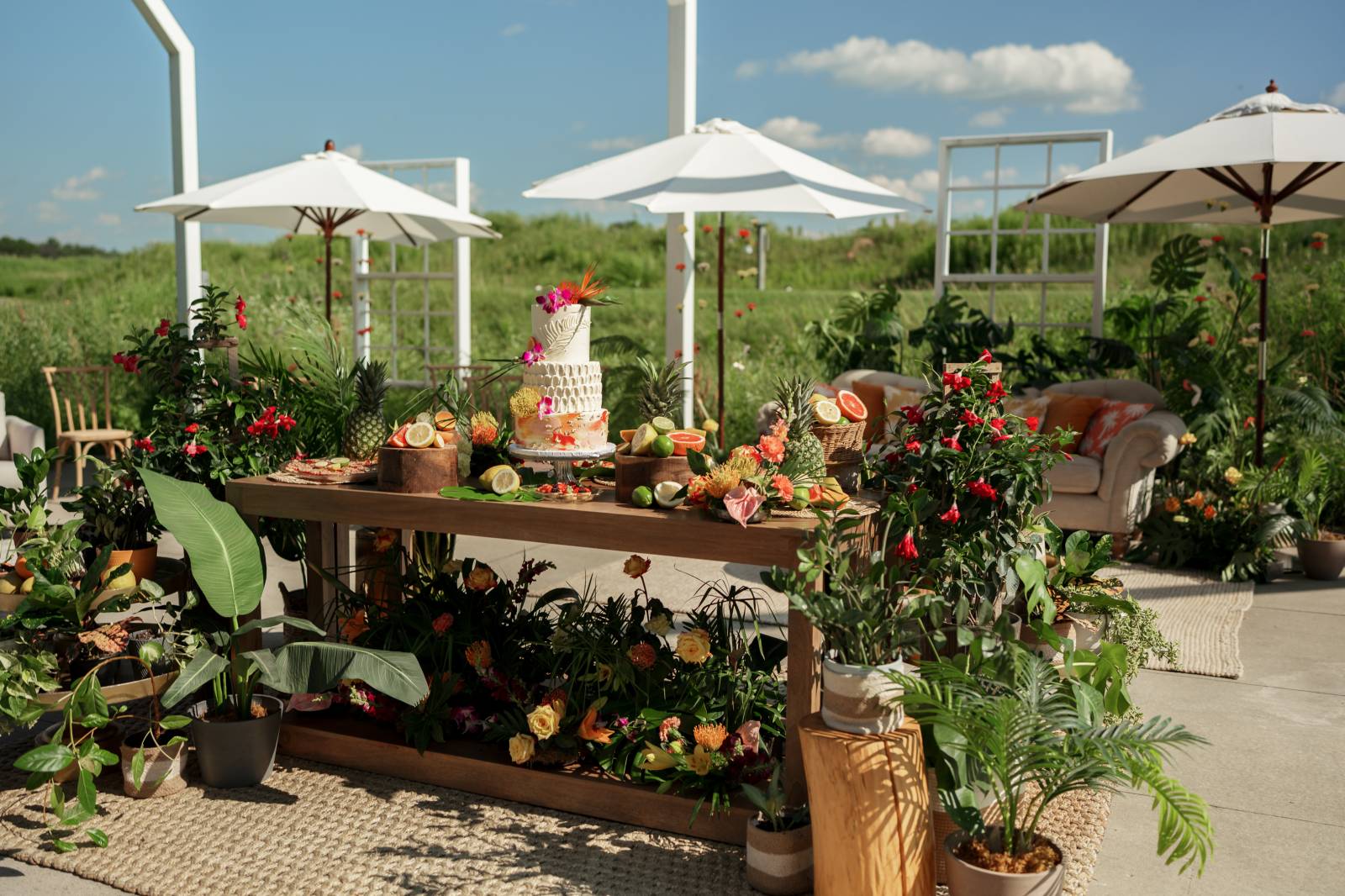 Fruit tarts, desserts, and a three-tiered cake from Sandy Kakes adorned the dessert table, further decorated with additional fruits, florals, wicker baskets, plus wooden and glass trays. More décor surrounded the table, sat atop a woven rug, including potted plants, wooden pedestals, with flowers and greenery underneath.