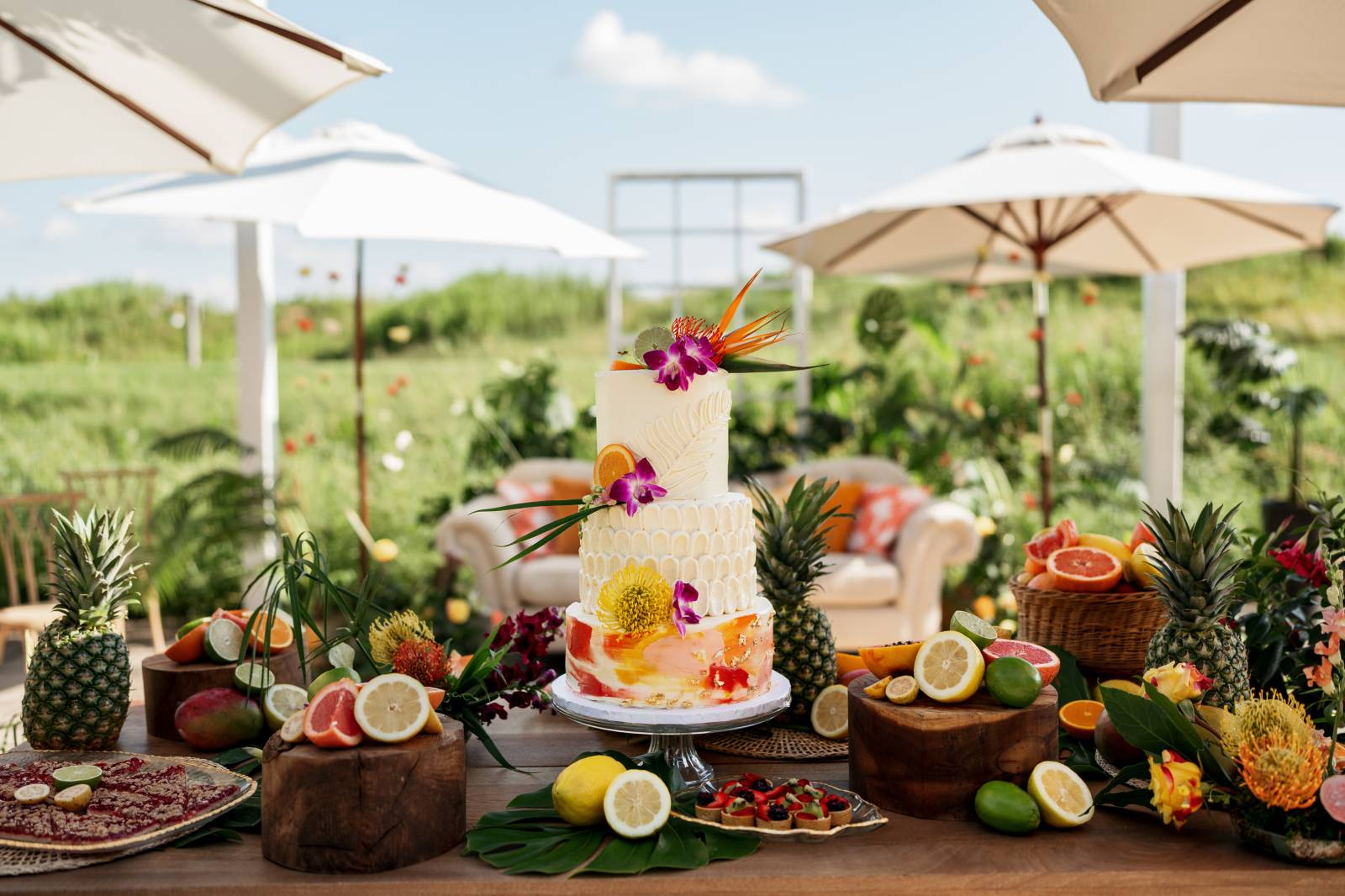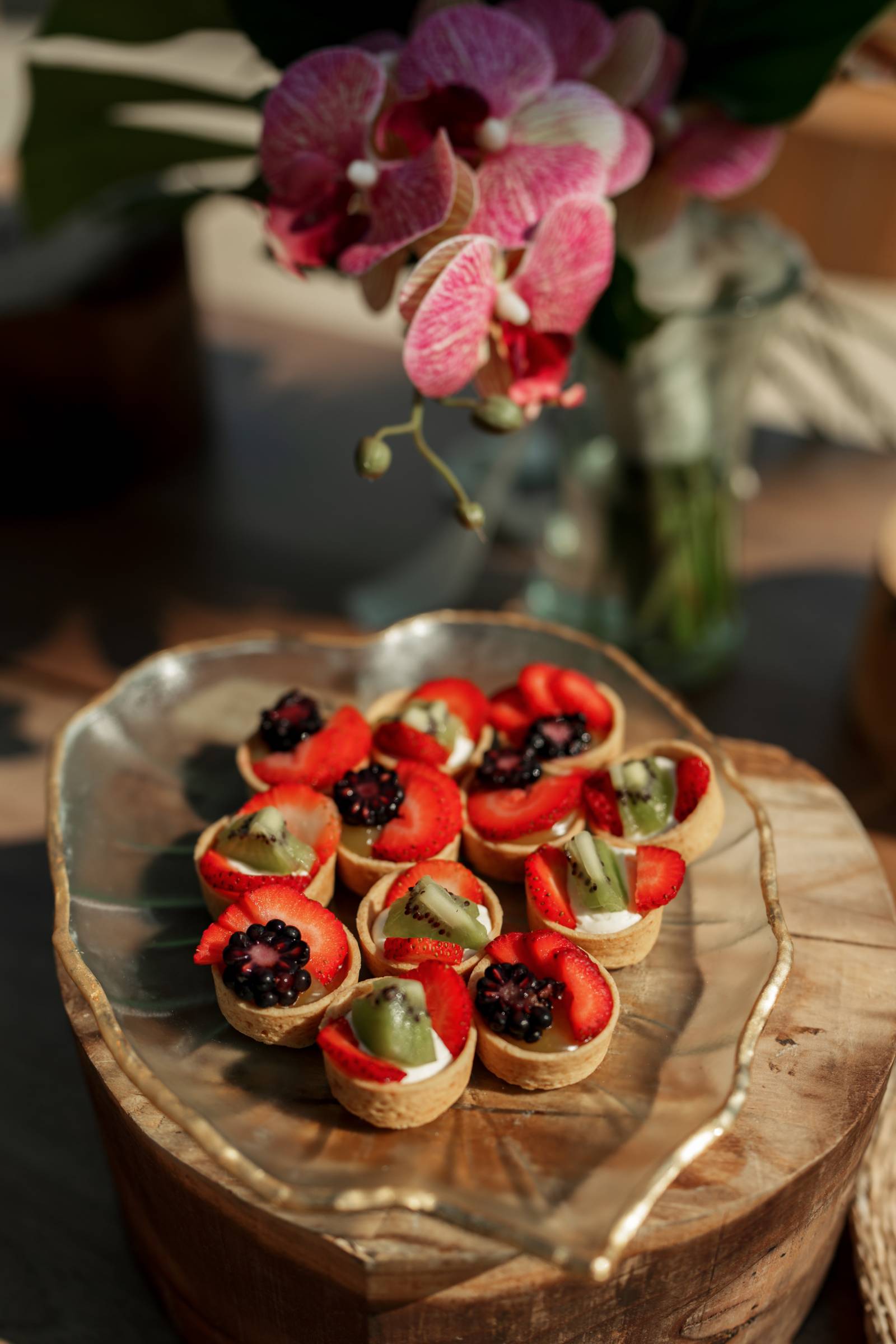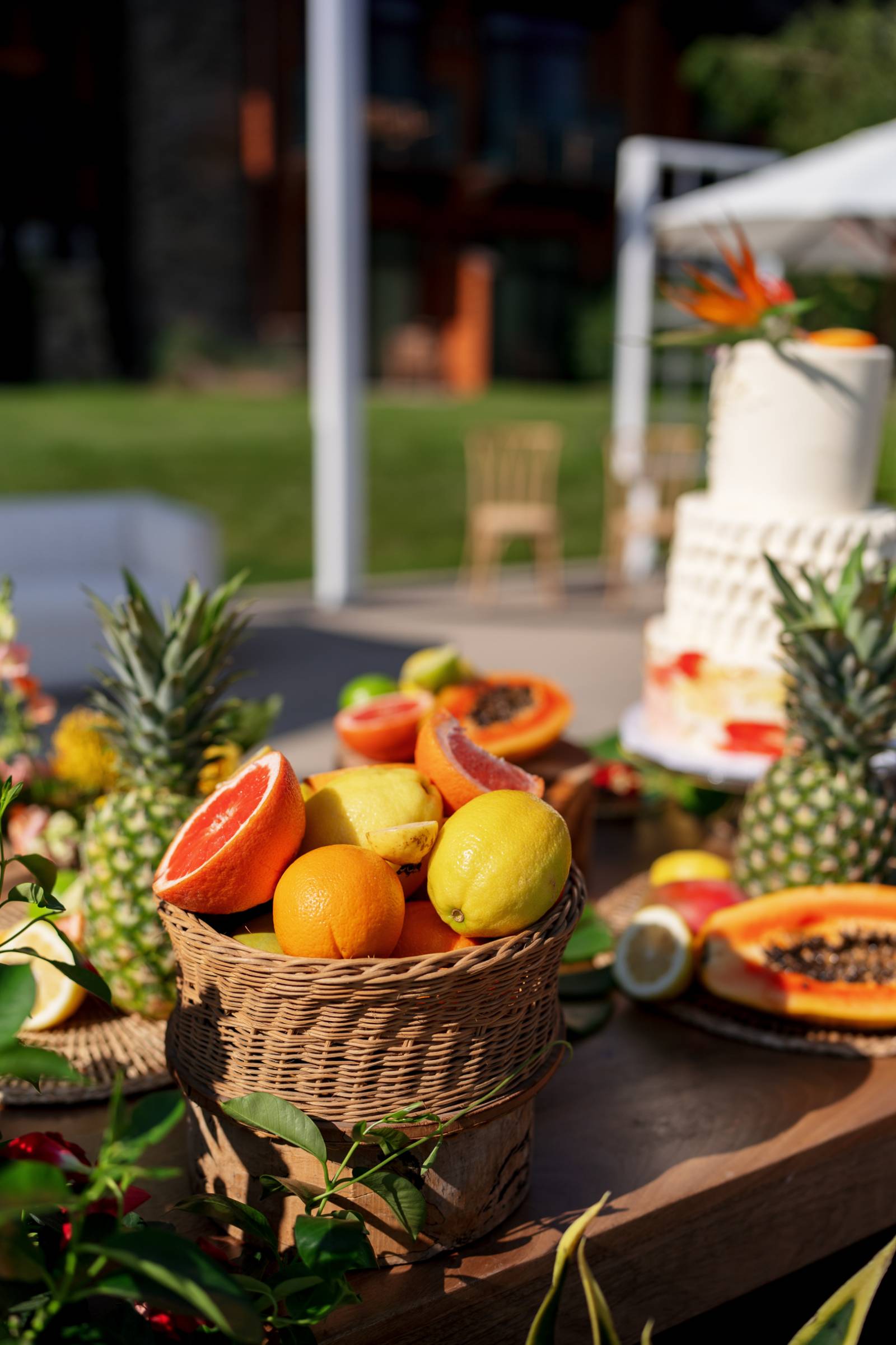 Fruit tarts, desserts, and a three-tiered cake from Sandy Kakes adorned the dessert table, further decorated with additional fruits, florals, wicker baskets, plus wooden and glass trays. More décor surrounded the table, sat atop a woven rug, including potted plants, wooden pedestals, with flowers and greenery underneath.