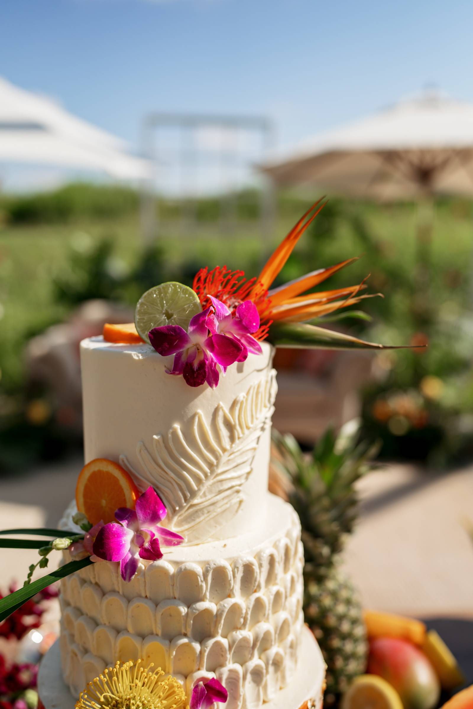 The bottom layer of the cake was artistically painted with sweeping colors of red, orange, and pink, and completed with edible gold foil pieces. The middle and top layers were decorated with structured textures and a monochromatic palm leaf, respectively.