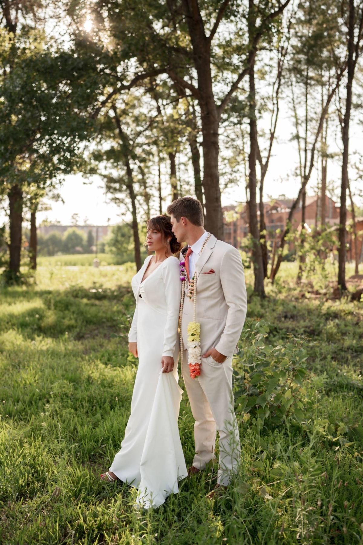The bride’s long-sleeve gown was a blend of classic and modern, featuring simple, luxurious fabric, minimal details, and a keyhole tie front. The open-back design was perfect for floral and beaded draping reminiscent of a lei. Beta Blue Beauty provided hair and makeup artistry, styling the bride’s hair into a voluminous, braided bun and side-swept bangs. Her makeup accentuated her healthy tan, with soft, arched brows, striking cheekbones, and glowy highlighter.