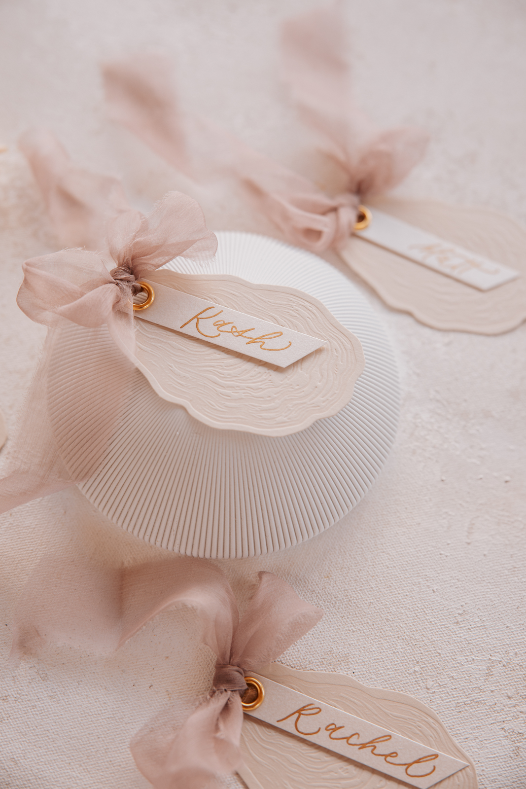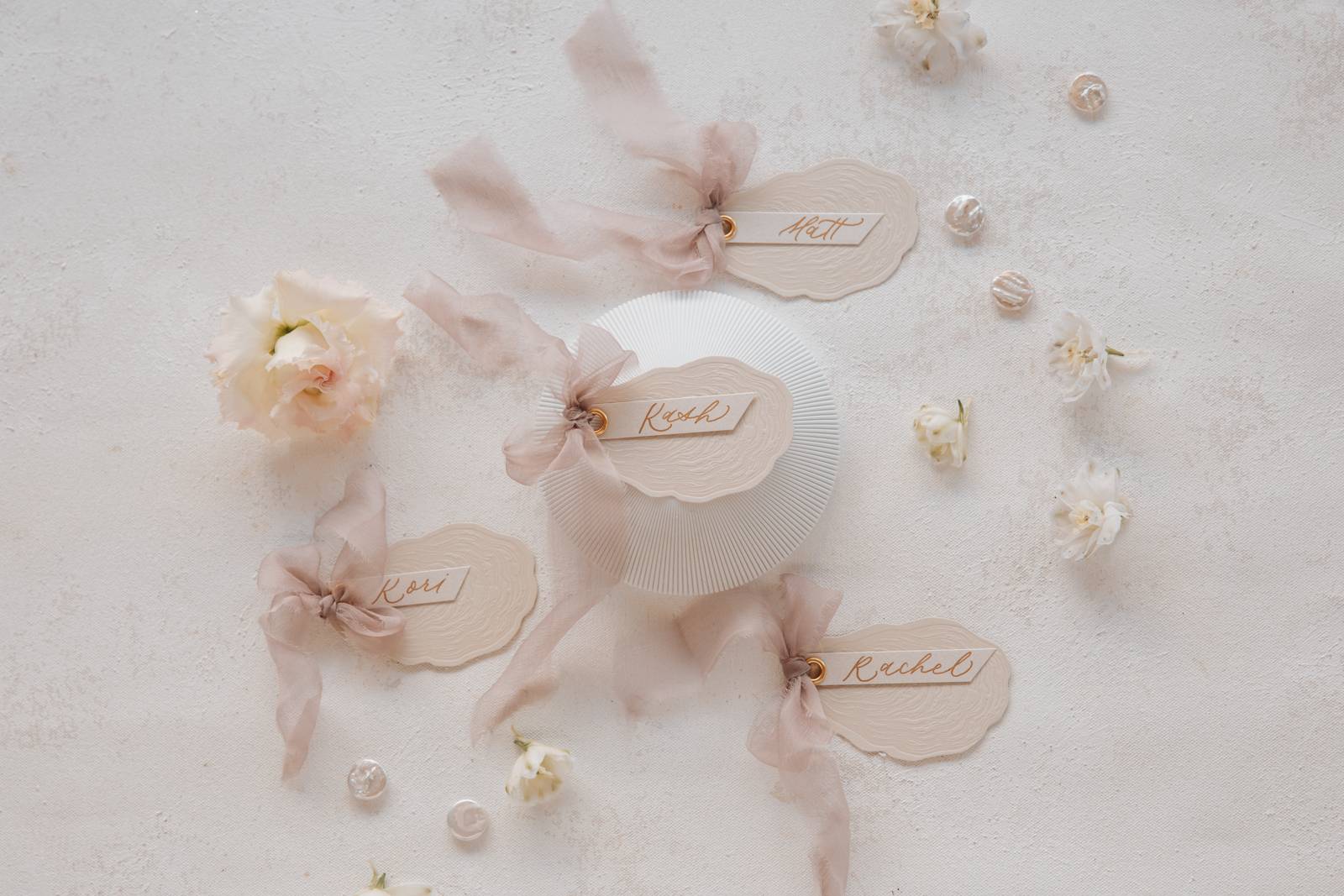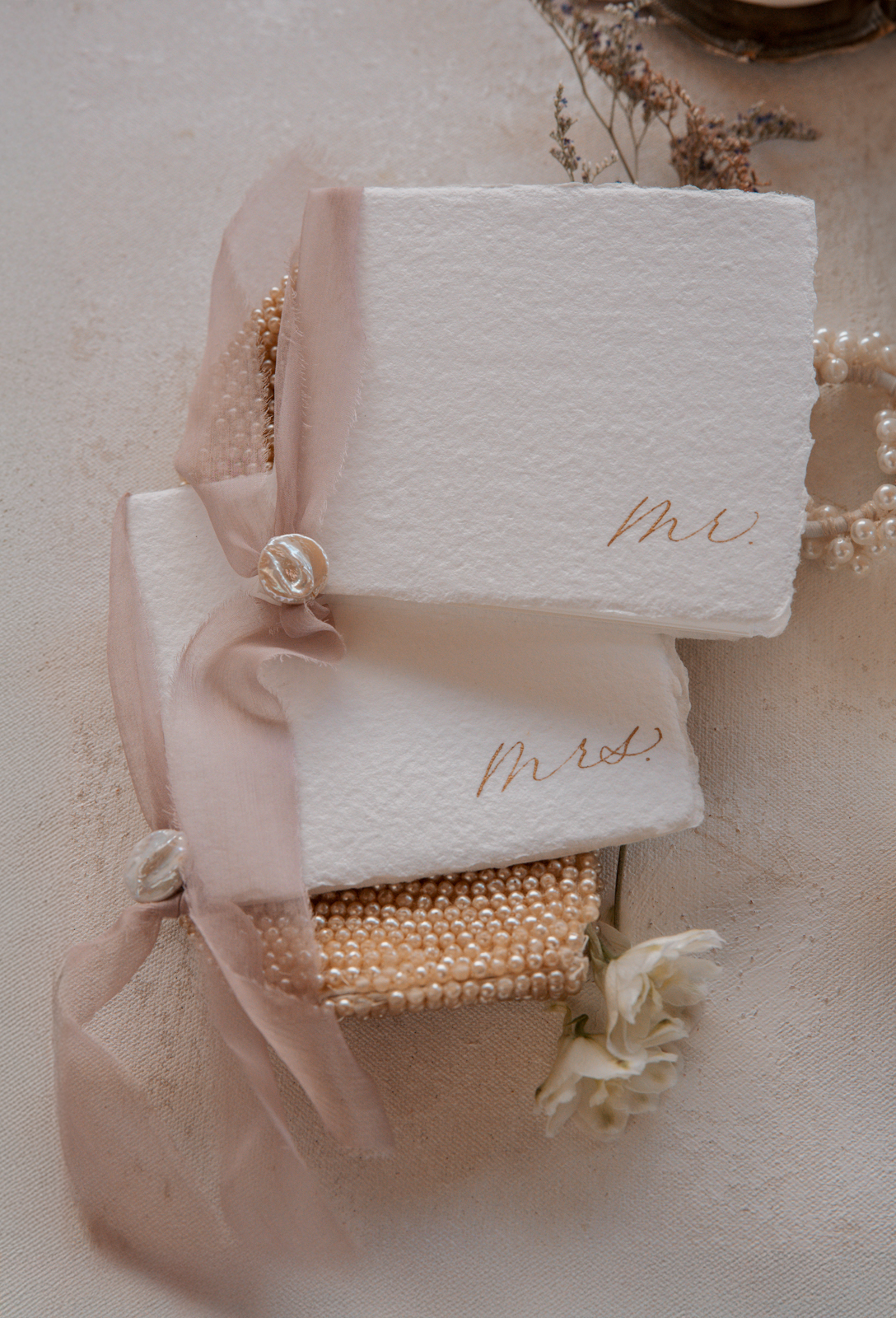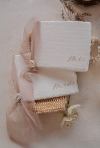 Lettered by Shi brought the organic beauty and lavish charm of pearls to life through her thoughtfully designed stationery and signage details. She incorporated raw, deckled edges on handmade paper to reflect the natural elegance of pearls, while letterpress-printed oyster shell place cards and pearl accents on the belly bands and vow books tied the theme together seamlessly. Luxurious details like delicate ribbon, handwritten calligraphy, and curvaceous fonts added an elevated touch, balanced by thoughtful spacing and clean serif typefaces that allowed the exquisite materials to shine. Her work perfectly mirrored the essence of pearls—beautifully natural and effortlessly sophisticated.
