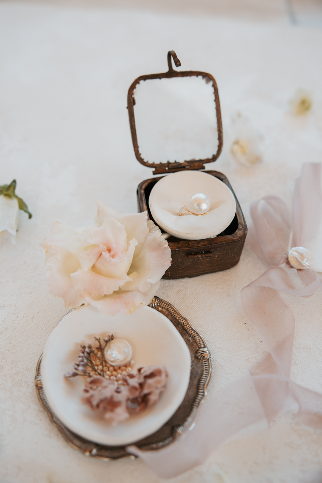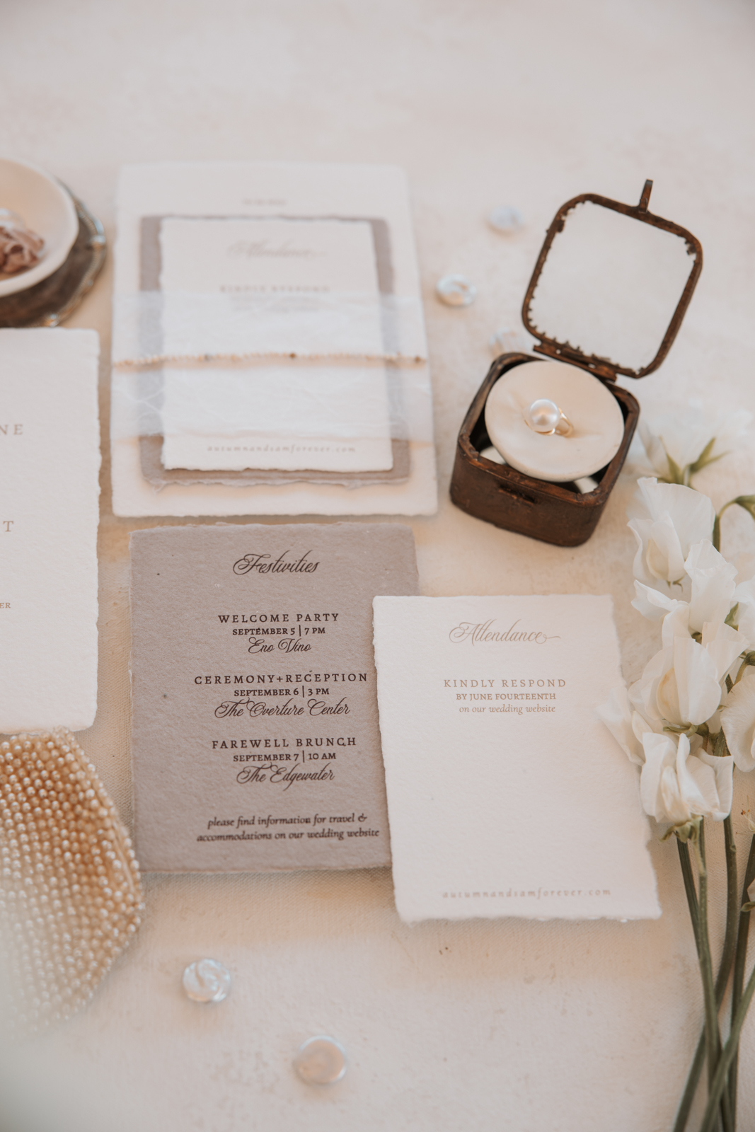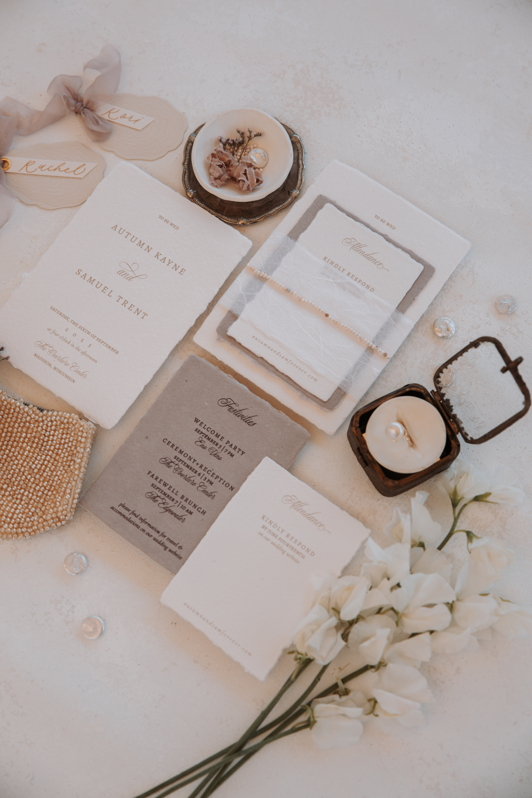 Lettered by Shi brought the organic beauty and lavish charm of pearls to life through her thoughtfully designed stationery and signage details. She incorporated raw, deckled edges on handmade paper to reflect the natural elegance of pearls, while letterpress-printed oyster shell place cards and pearl accents on the belly bands and vow books tied the theme together seamlessly. Luxurious details like delicate ribbon, handwritten calligraphy, and curvaceous fonts added an elevated touch, balanced by thoughtful spacing and clean serif typefaces that allowed the exquisite materials to shine. Her work perfectly mirrored the essence of pearls—beautifully natural and effortlessly sophisticated.