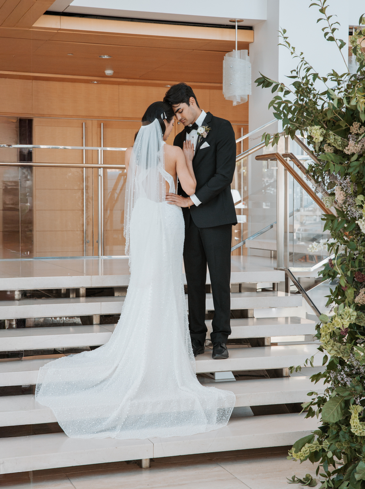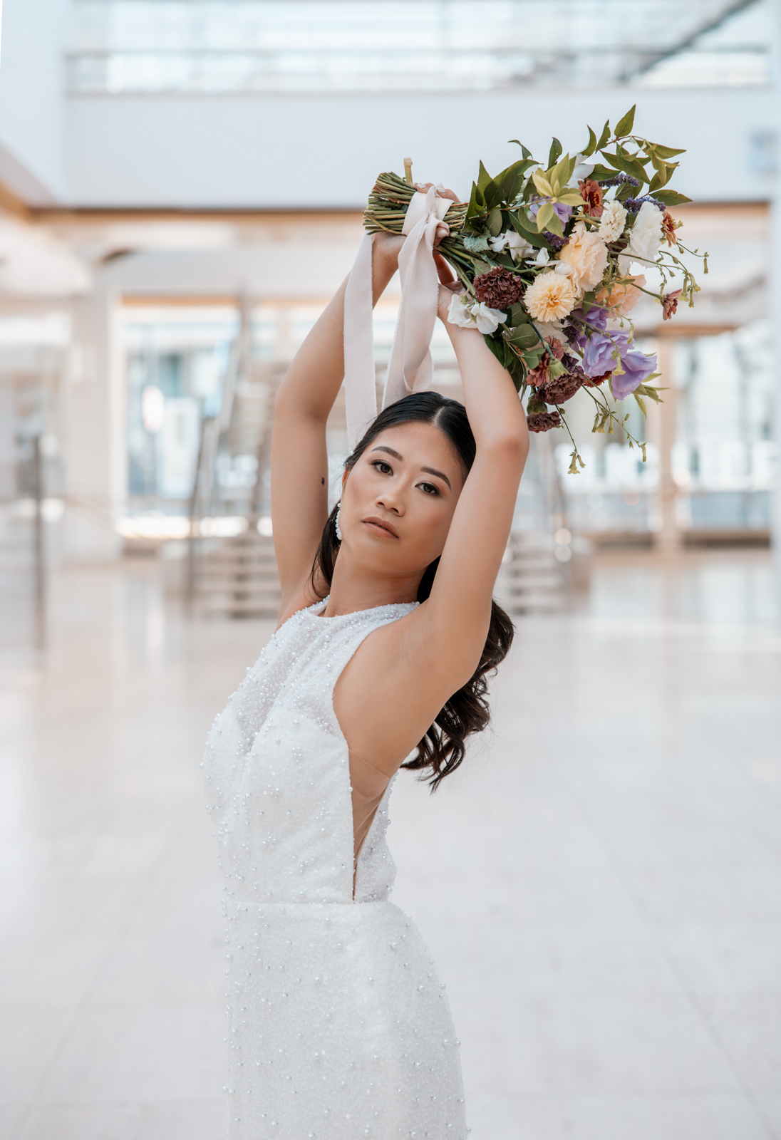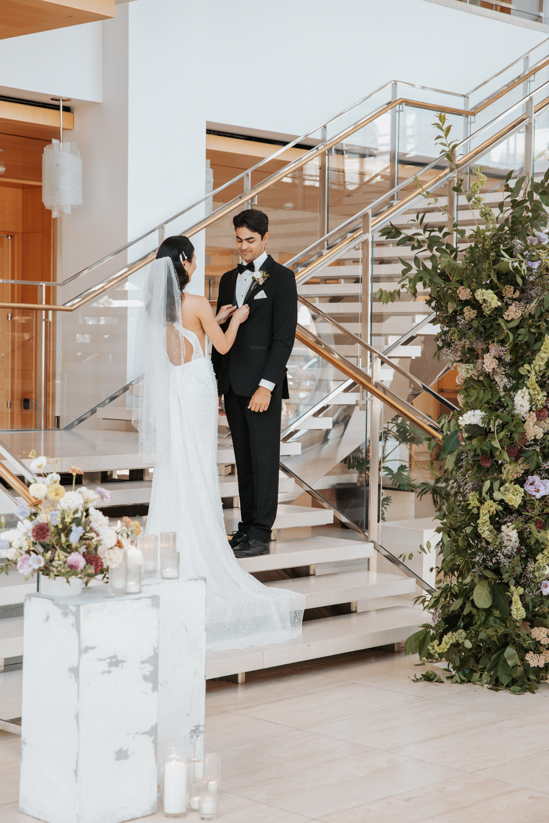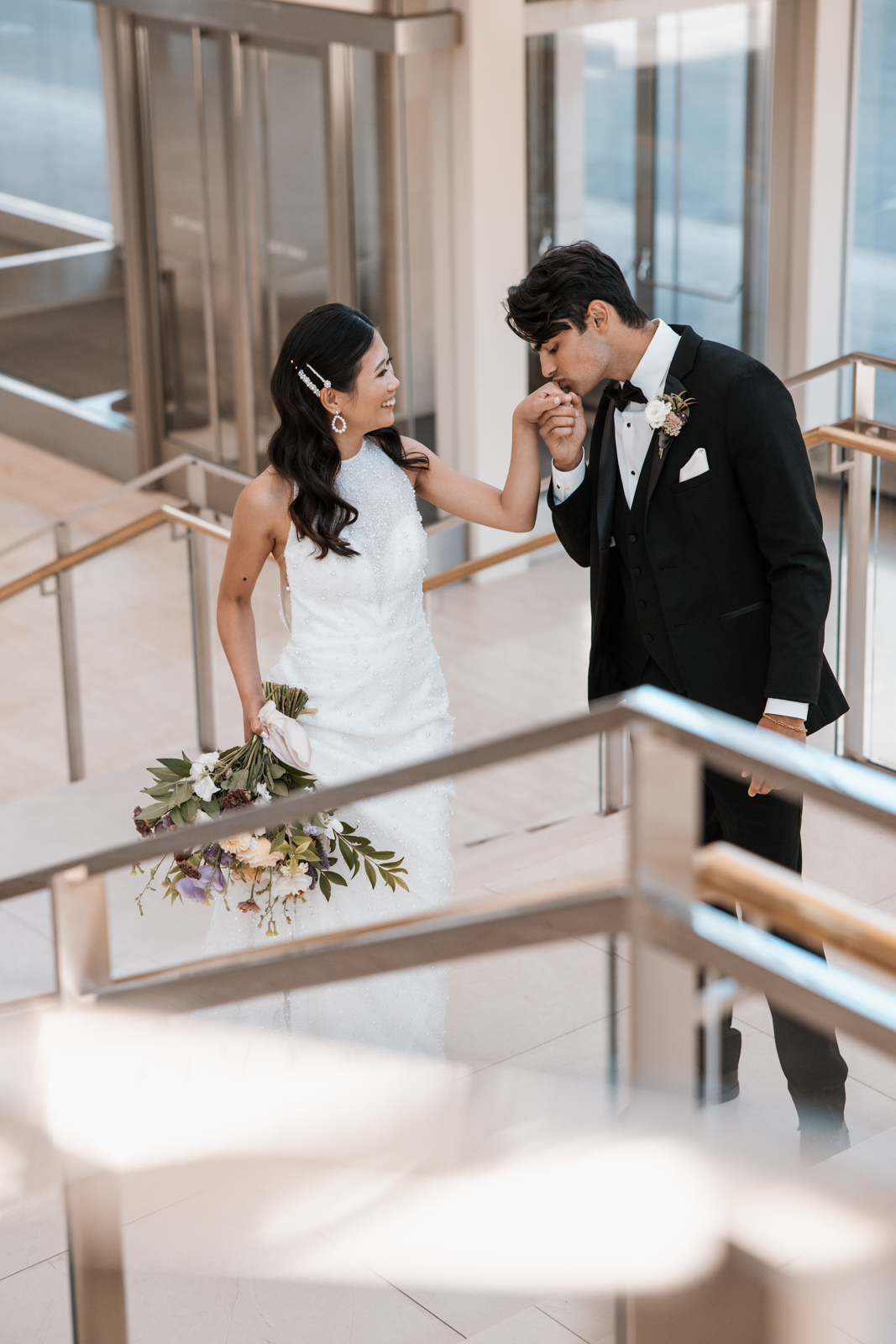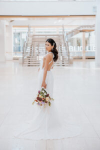 With its modern elegance and architectural beauty, The Overture Center provided the perfect backdrop for this luxurious wedding design in downtown Madison. Set in the Overture Hall Lobby, the space’s grand transparent staircases, expansive seventy-five-foot glass windows, and stunning views of the State Capitol created a dramatic and elegant atmosphere. The venue’s light color palette and contemporary design allowed the luxe pearlescent details and florals to truly shine. The Promenade Lobby, with its suspended catwalks and balcony spaces overlooking the main lobby, offered an equally striking view and photo opportunity, further elevating the upscale ambiance.