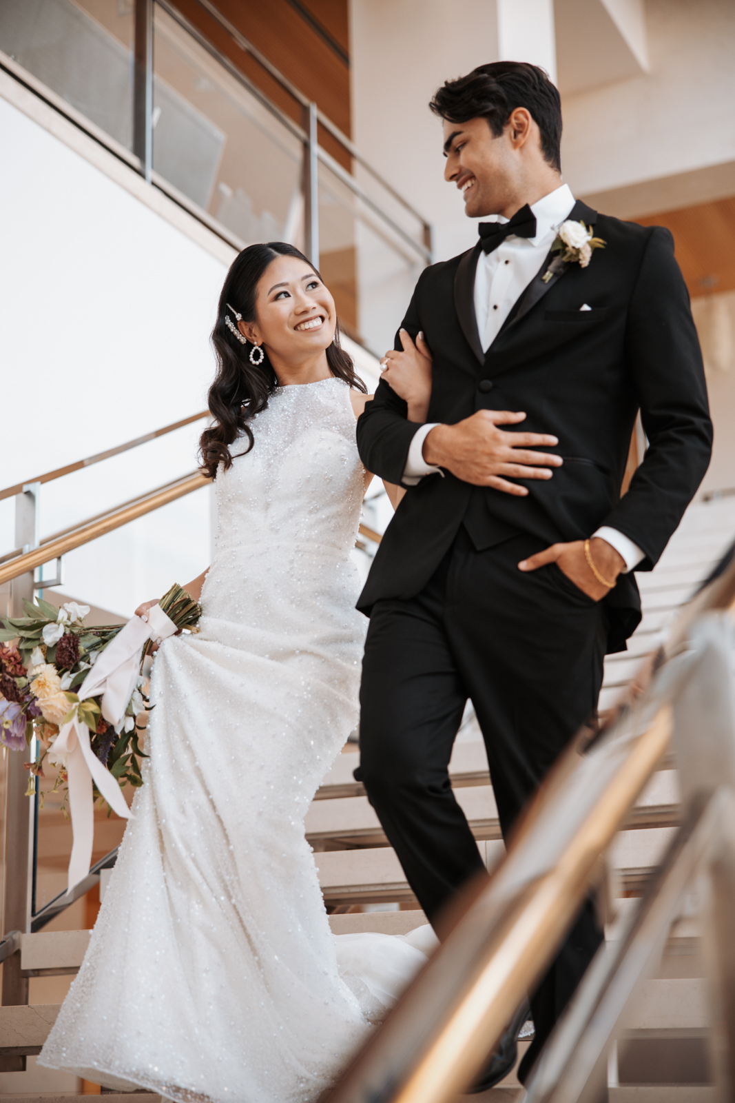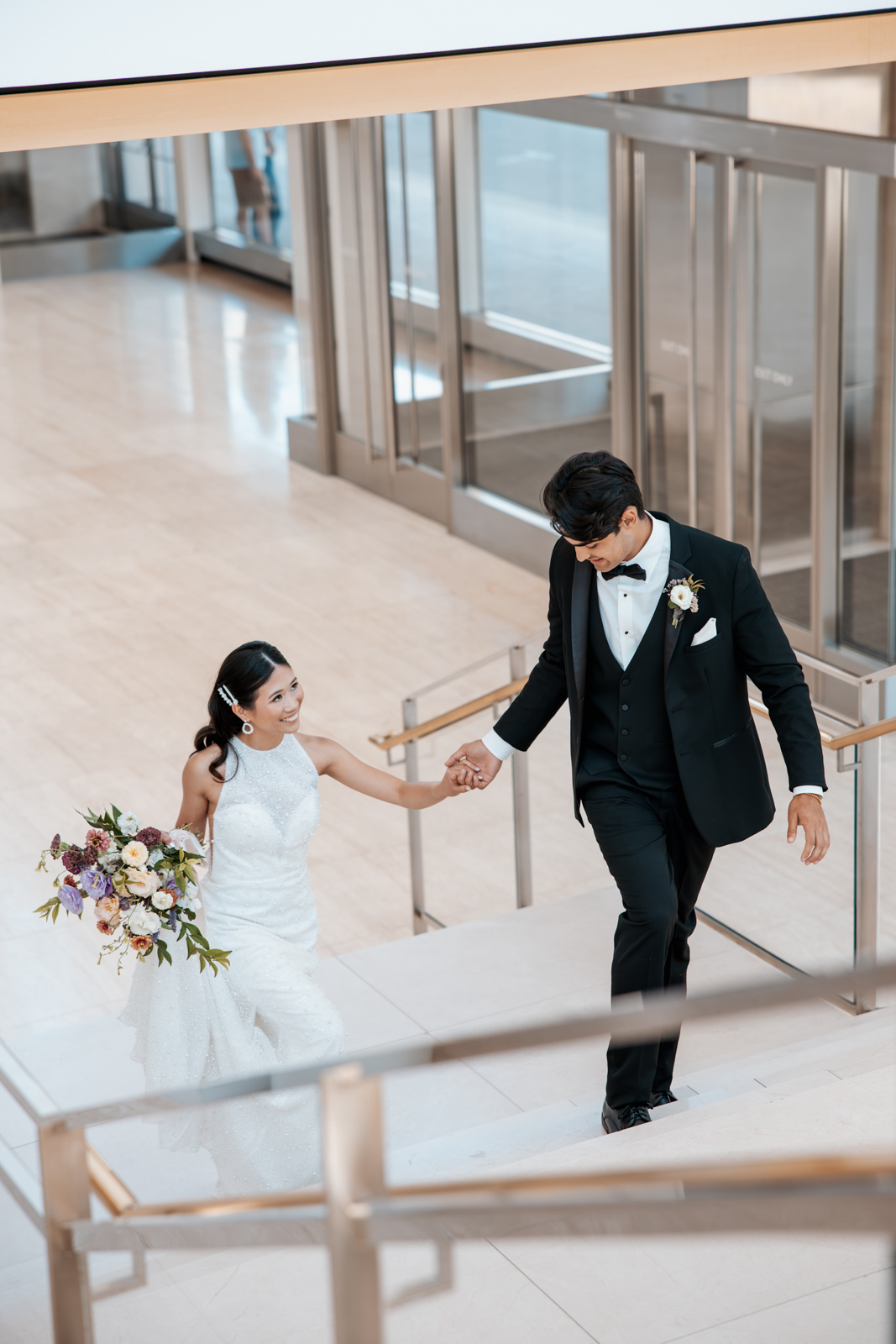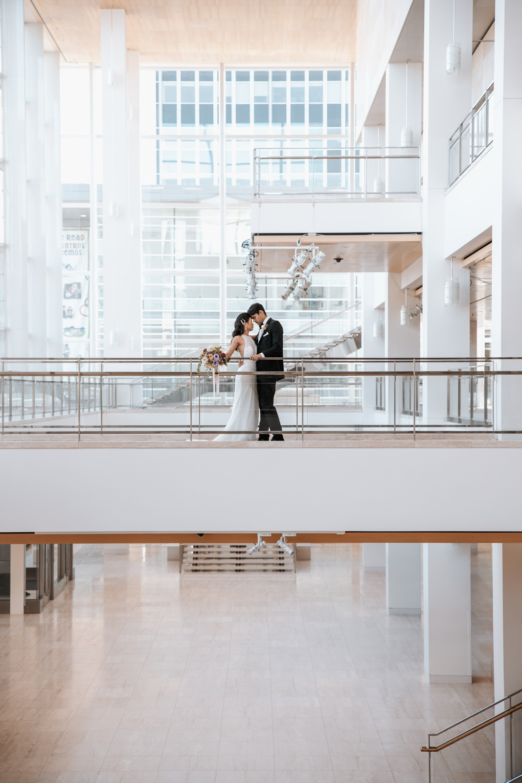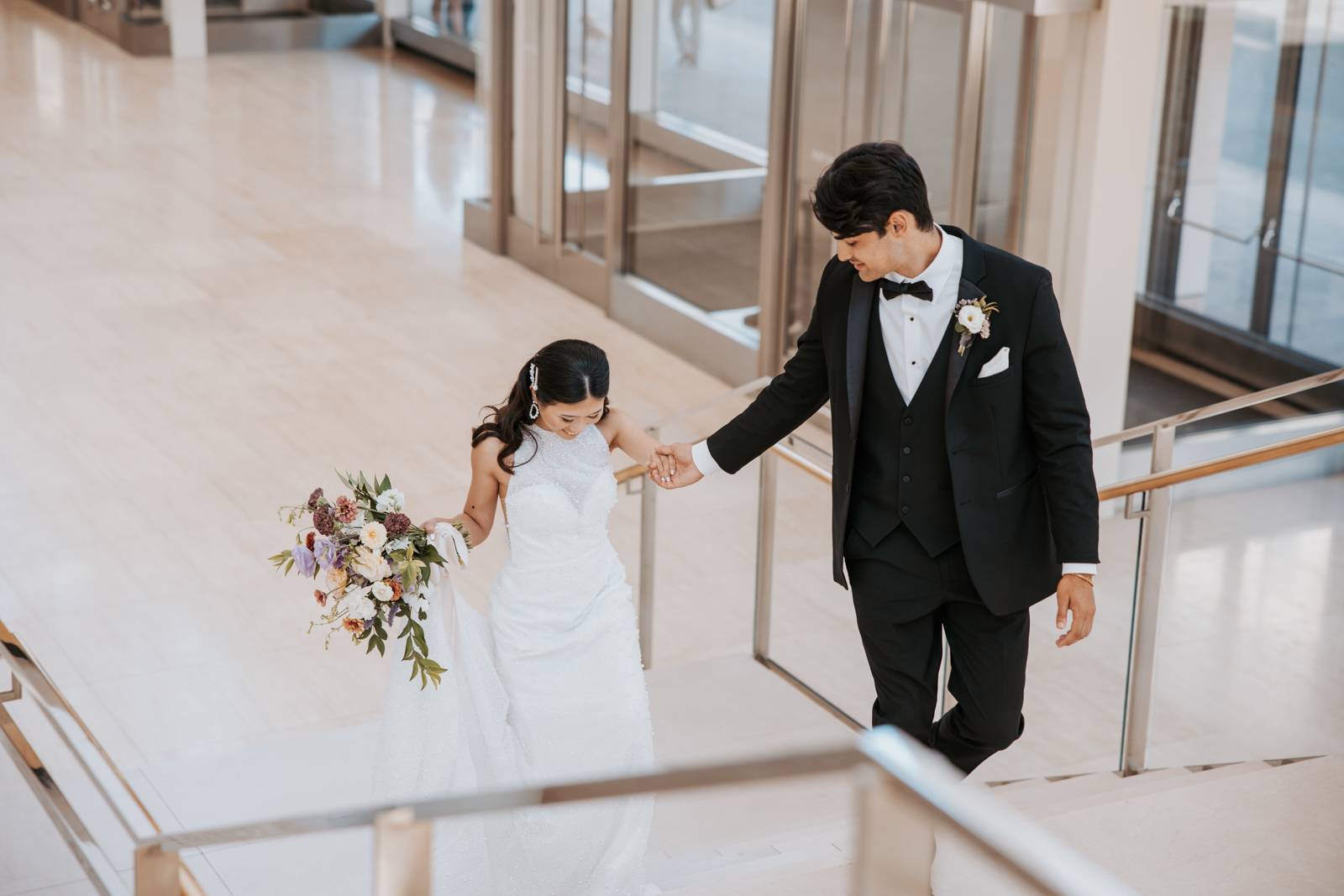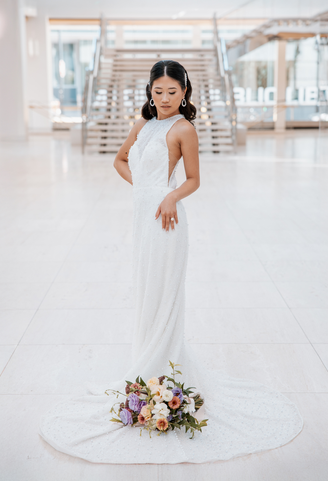With its modern elegance and architectural beauty, The Overture Center provided the perfect backdrop for this luxurious wedding design in downtown Madison. Set in the Overture Hall Lobby, the space’s grand transparent staircases, expansive seventy-five-foot glass windows, and stunning views of the State Capitol created a dramatic and elegant atmosphere. The venue’s light color palette and contemporary design allowed the luxe pearlescent details and florals to truly shine. The Promenade Lobby, with its suspended catwalks and balcony spaces overlooking the main lobby, offered an equally striking view and photo opportunity, further elevating the upscale ambiance.