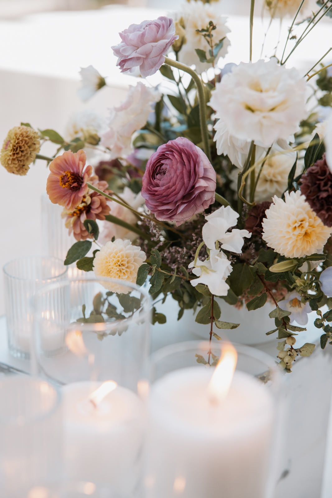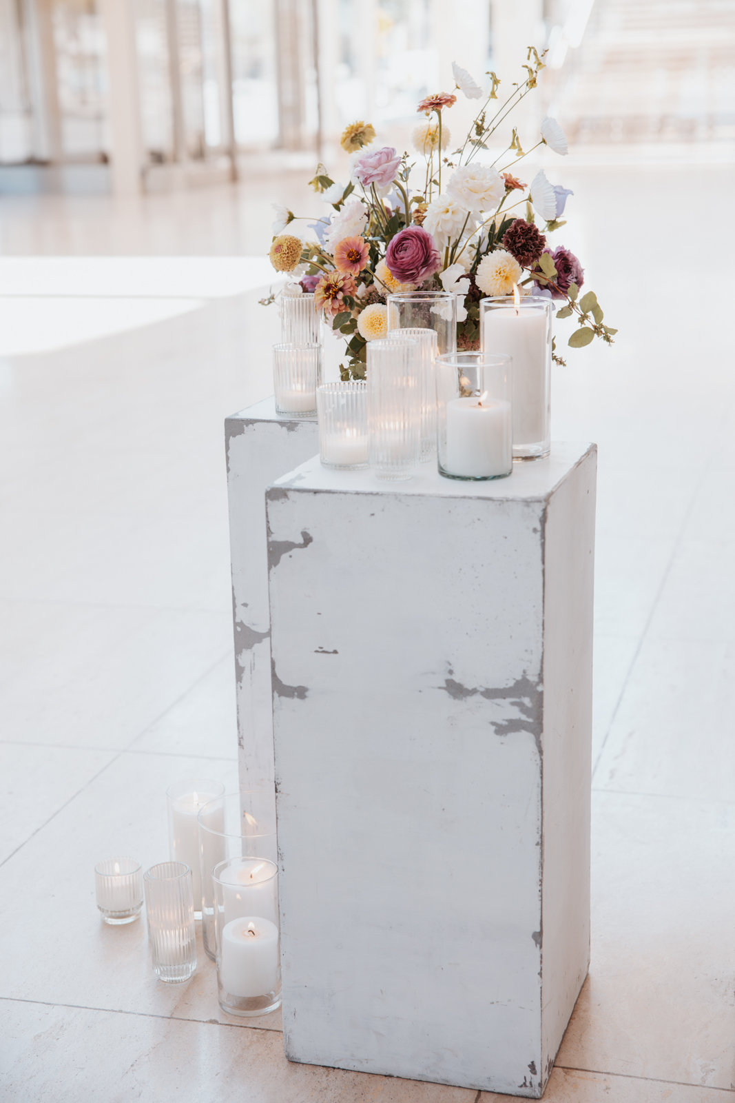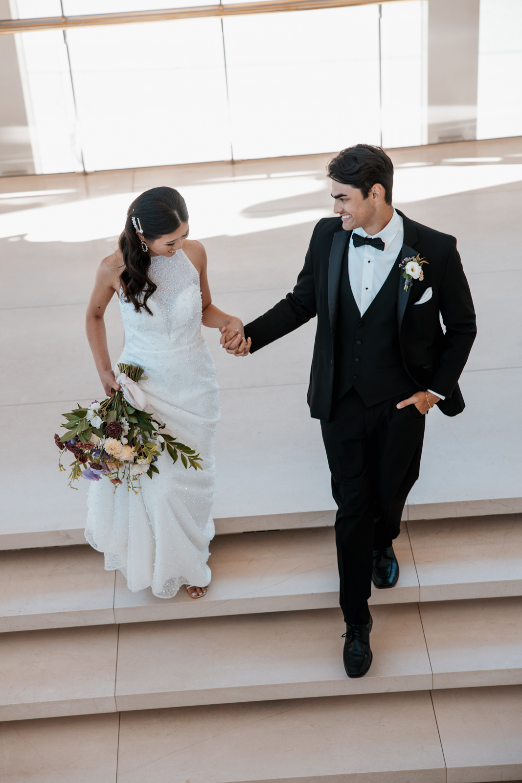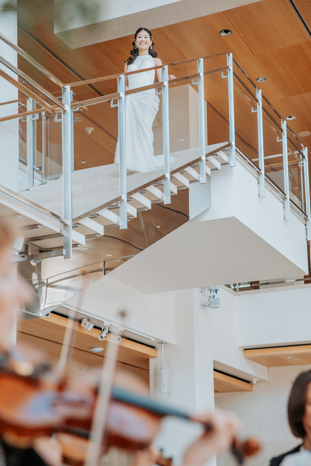With its modern elegance and architectural beauty, The Overture Center provided the perfect backdrop for this luxurious wedding design in downtown Madison. Set in the Overture Hall Lobby, the space’s grand transparent staircases, expansive seventy-five-foot glass windows, and stunning views of the State Capitol created a dramatic and elegant atmosphere. The venue’s light color palette and contemporary design allowed the luxe pearlescent details and florals to truly shine. The Promenade Lobby, with its suspended catwalks and balcony spaces overlooking the main lobby, offered an equally striking view and photo opportunity, further elevating the upscale ambiance.