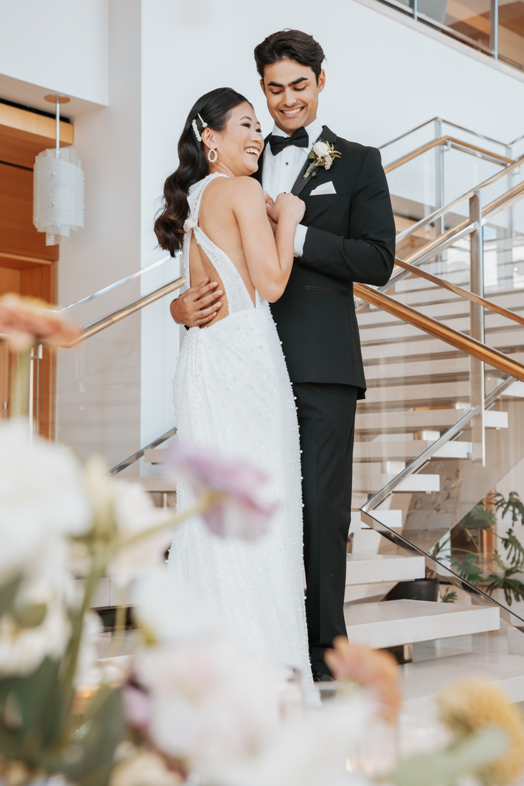 The bride’s hair and makeup perfectly exuded effortless glamour, balancing timeless elegance with a modern edge. JV Makeup Artist created a warm, flawless natural glam look with soft brown eyes and a neutral matte lip, enhancing her natural beauty with understated sophistication.
