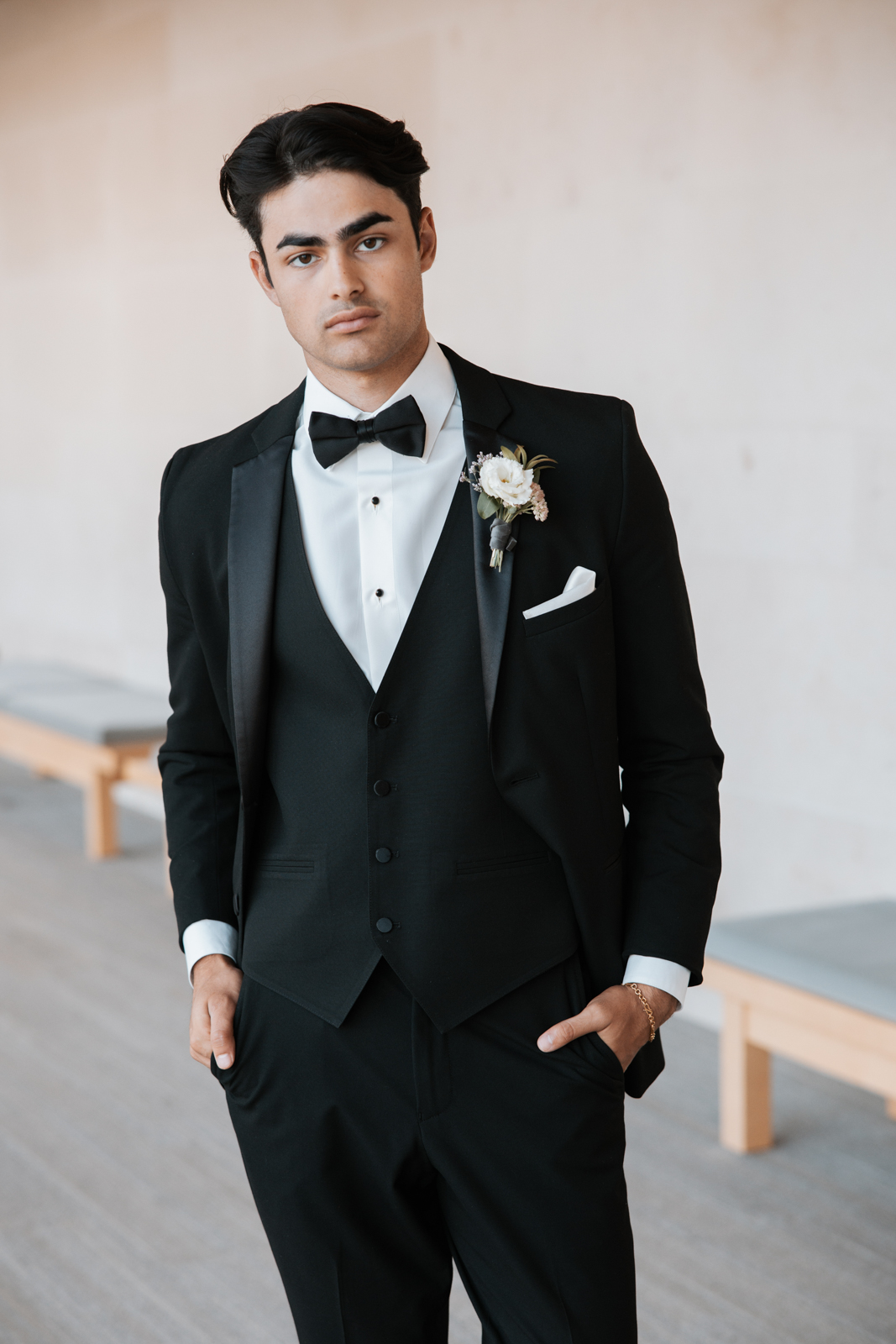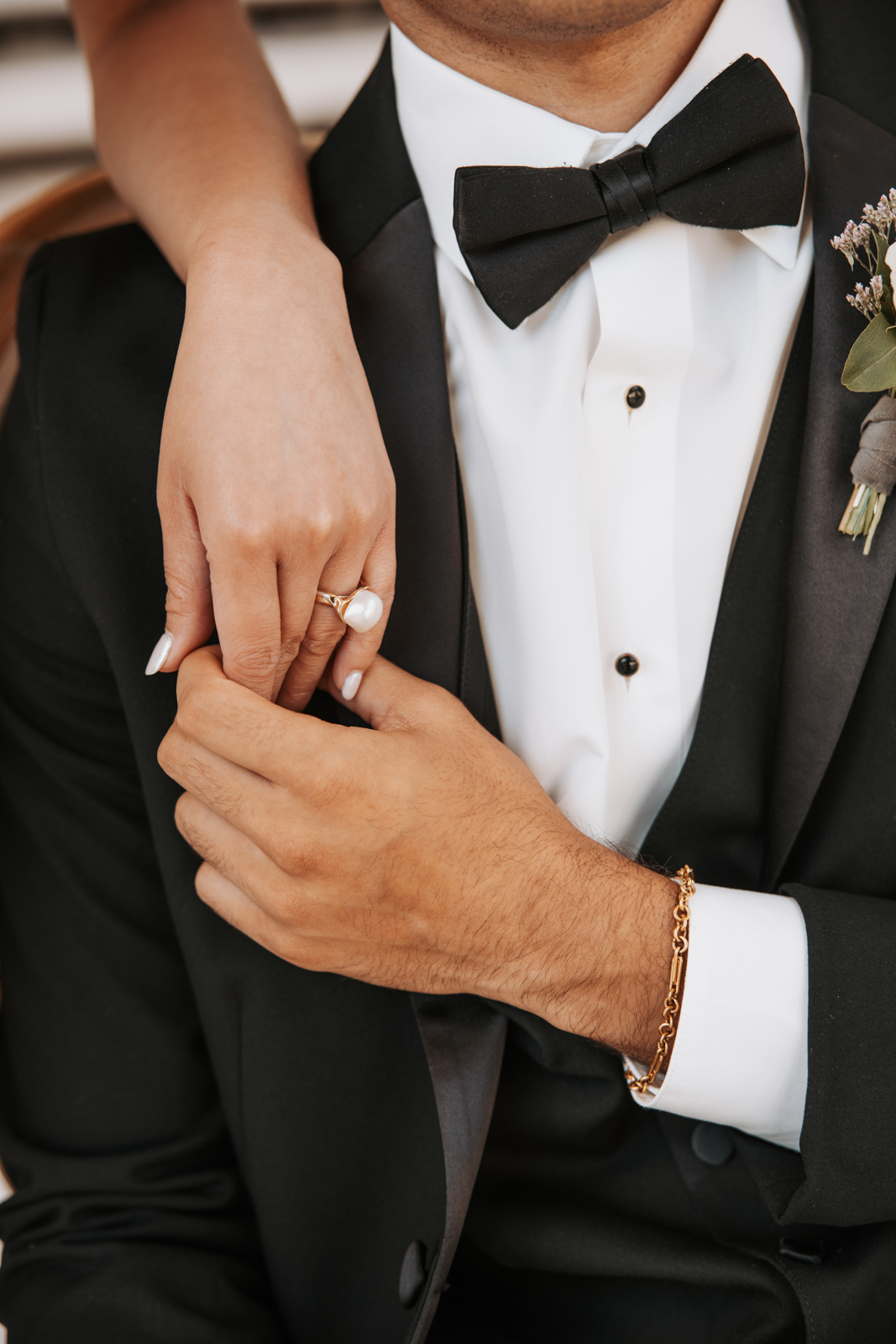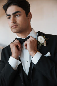 Beautifully reflecting the Pearls & Prosecco theme, the bride and groom’s attire showcased a blend of fashion-forward style, upscale sophistication, and luxe details. The bride’s gown from Brandi’s Bridal Galleria, Etc. featured a chic high neckline, a dramatic low keyhole back, and shimmering pearl embellishments, perfectly capturing the elegance and glamour of the day. The groom, styled by DuBois Formalwear, wore a classic black-and-white suit paired with a black bowtie and shoes–a timeless and refined choice that radiated enduring style.