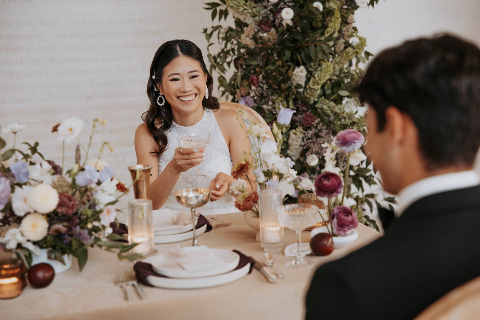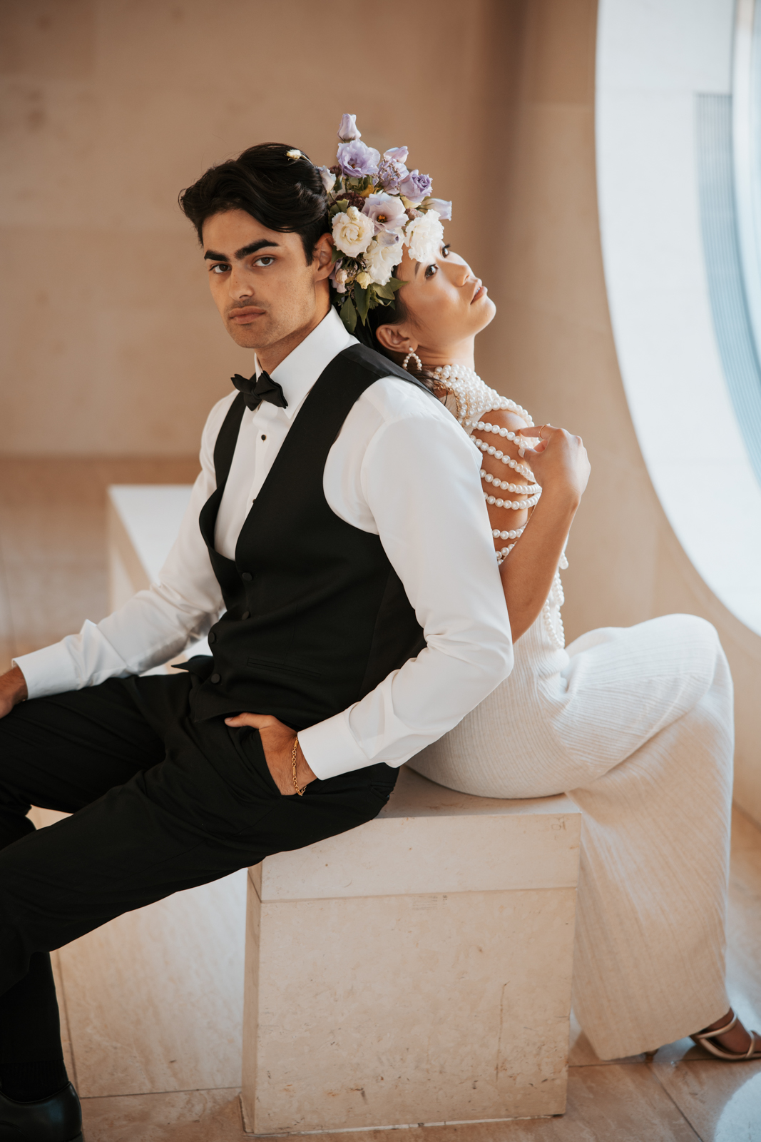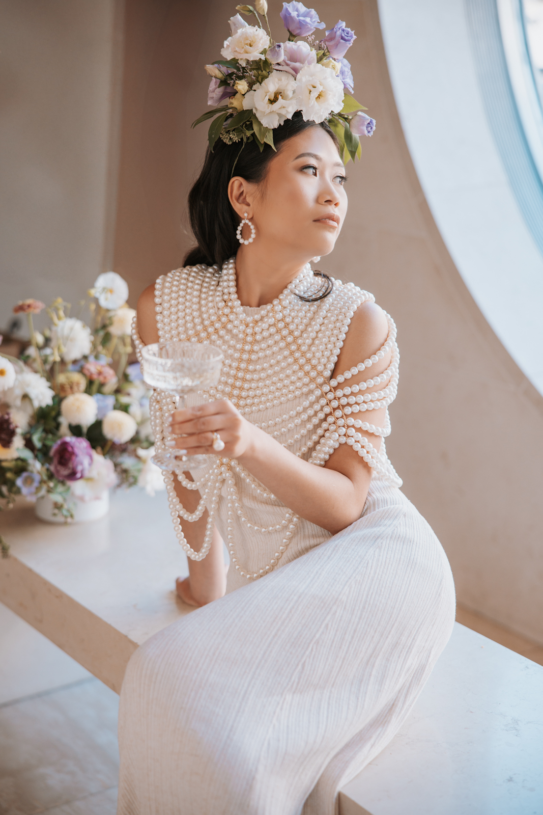 As the bubbly was poured, the bride revealed a jaw-dropping second look–a white pleated dress paired with an incredible, statement-making pearl shawl. Her ensemble change was taken to the next level with a stunning floral headpiece from Sunborn Gardens, featuring a unique, artistic design with purple and white blooms that added a bold, creative touch to the end of the high-end celebration.