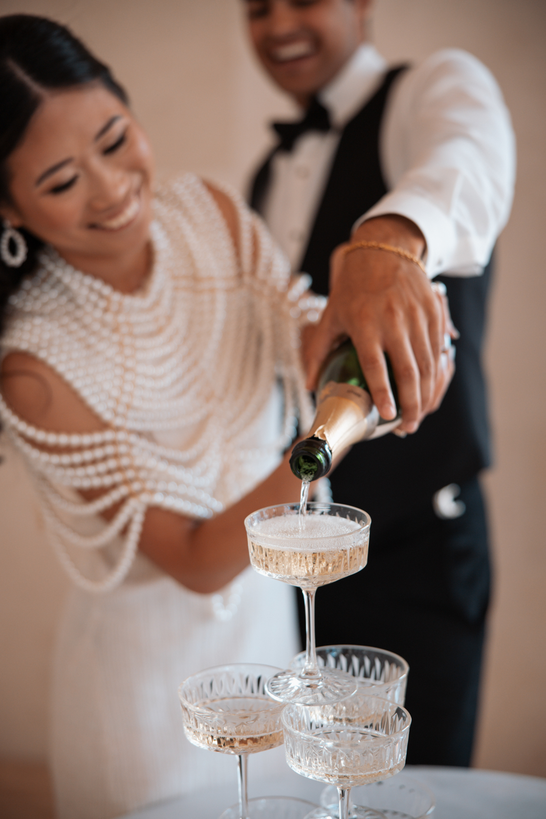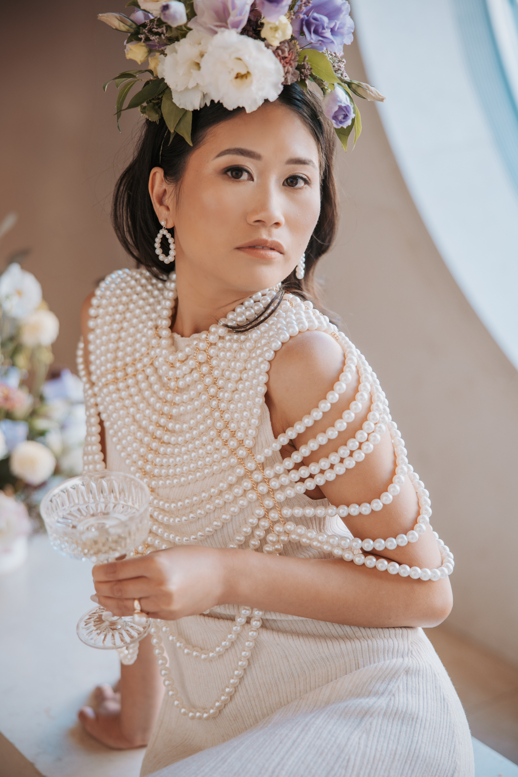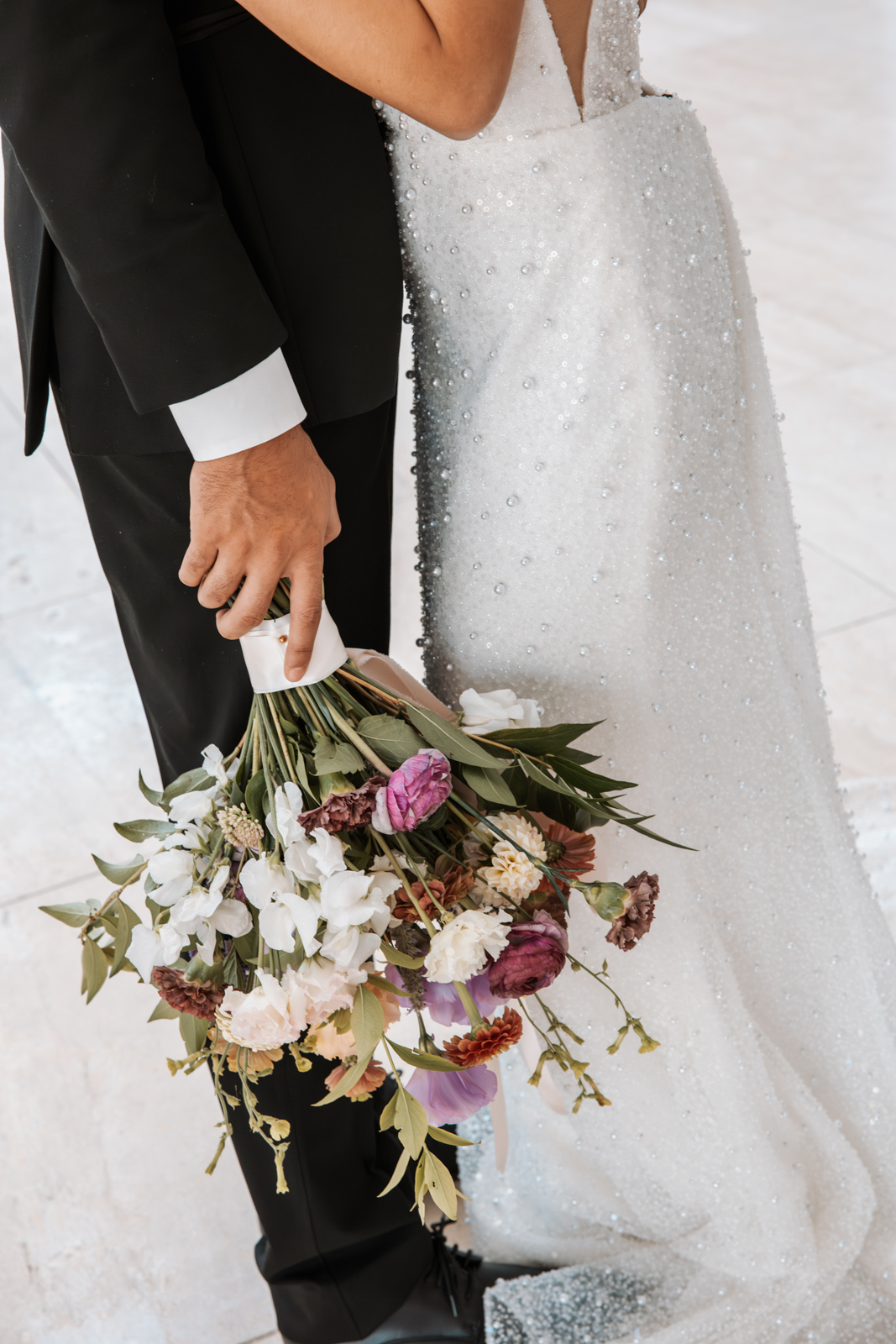 As the bubbly was poured, the bride revealed a jaw-dropping second look–a white pleated dress paired with an incredible, statement-making pearl shawl. Her ensemble change was taken to the next level with a stunning floral headpiece from Sunborn Gardens, featuring a unique, artistic design with purple and white blooms that added a bold, creative touch to the end of the high-end celebration.