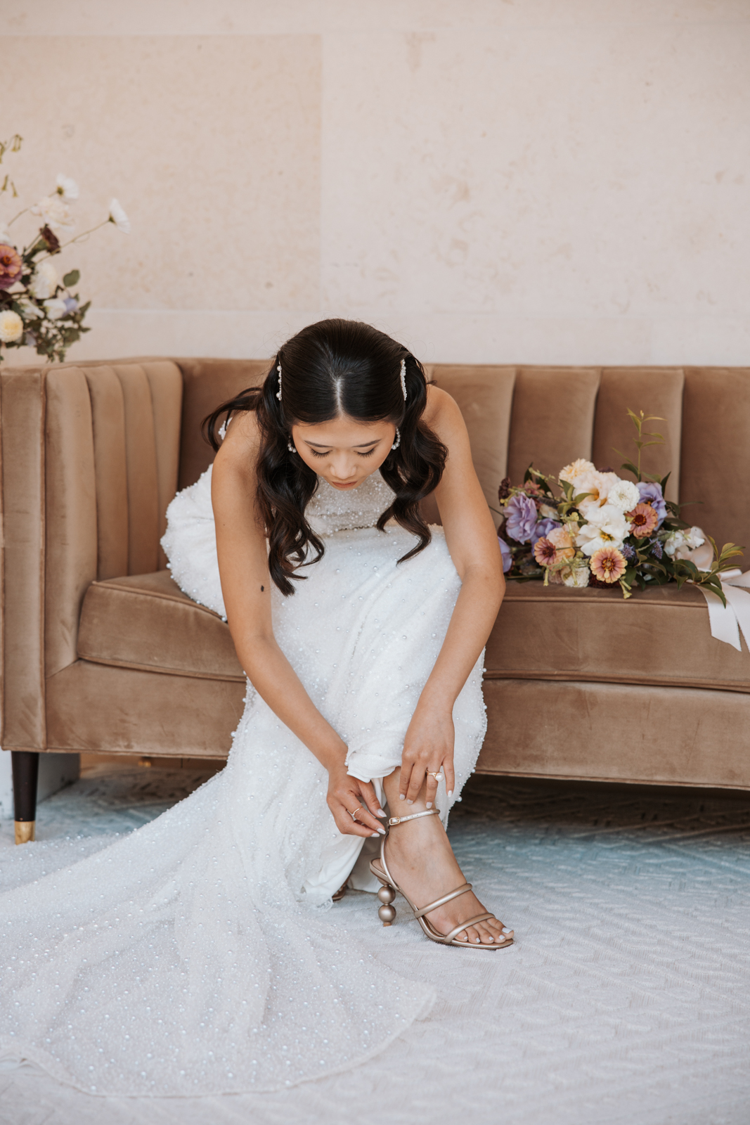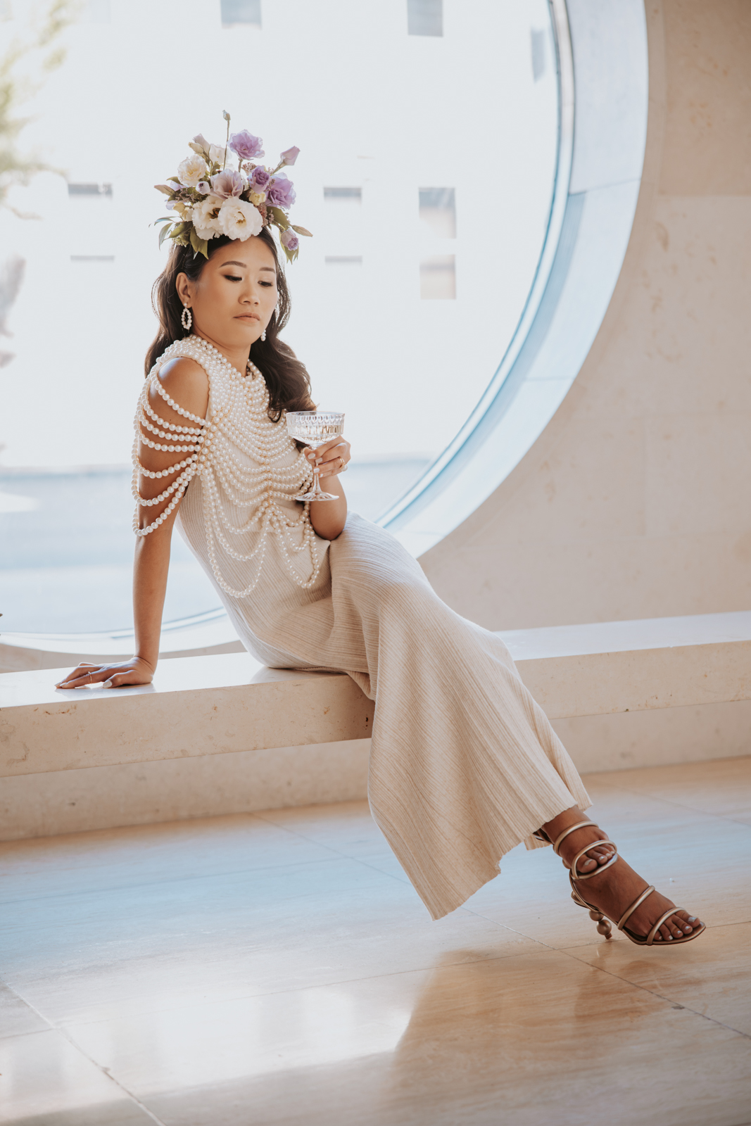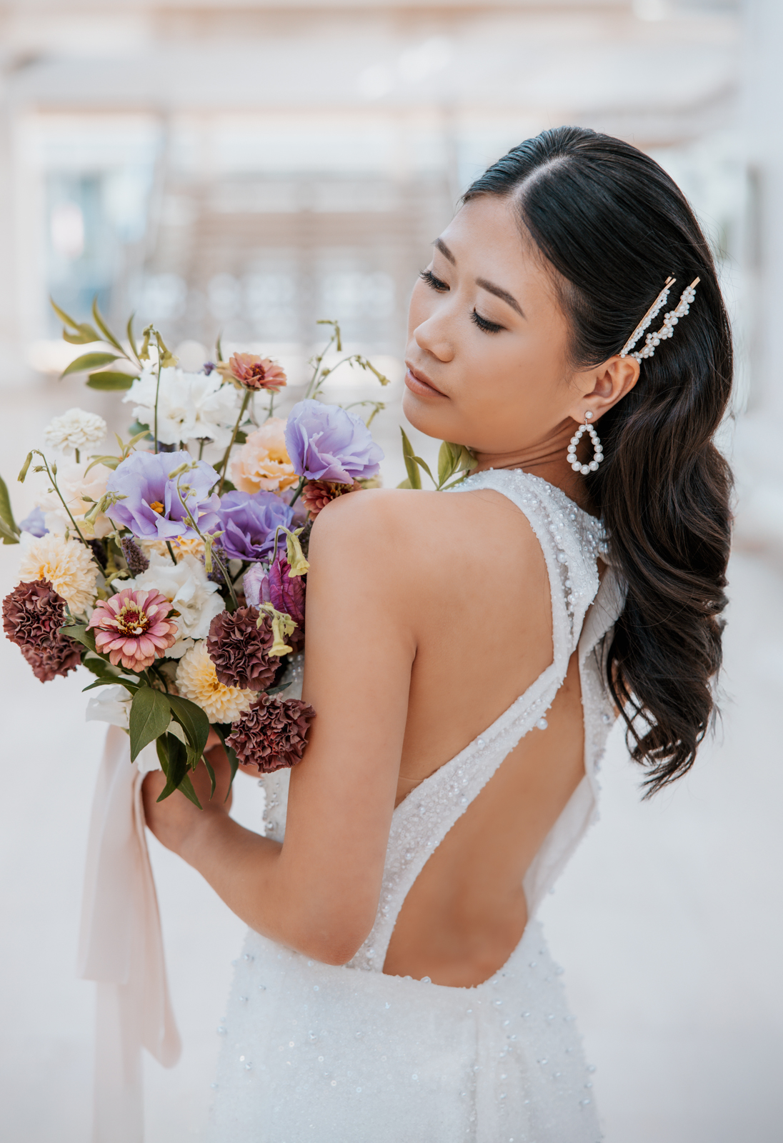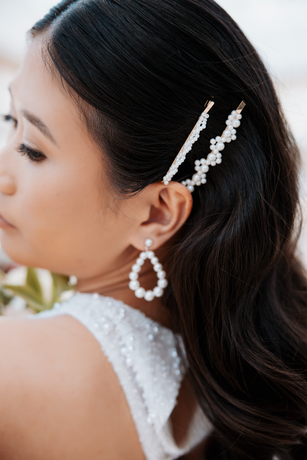 BK Salon styled her hair in trendy Hollywood glam waves with a sleek middle part accented with stacked pearl barrettes, adding a contemporary touch that tied into the overall pearl-inspired theme.