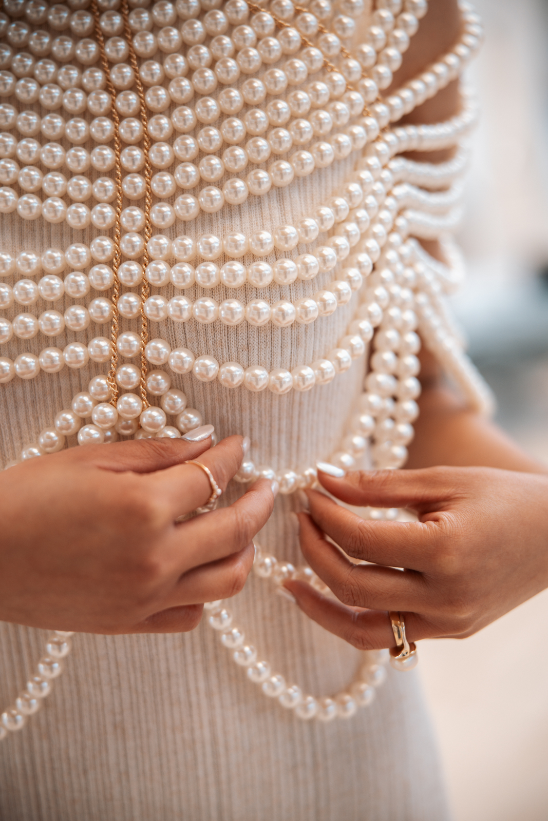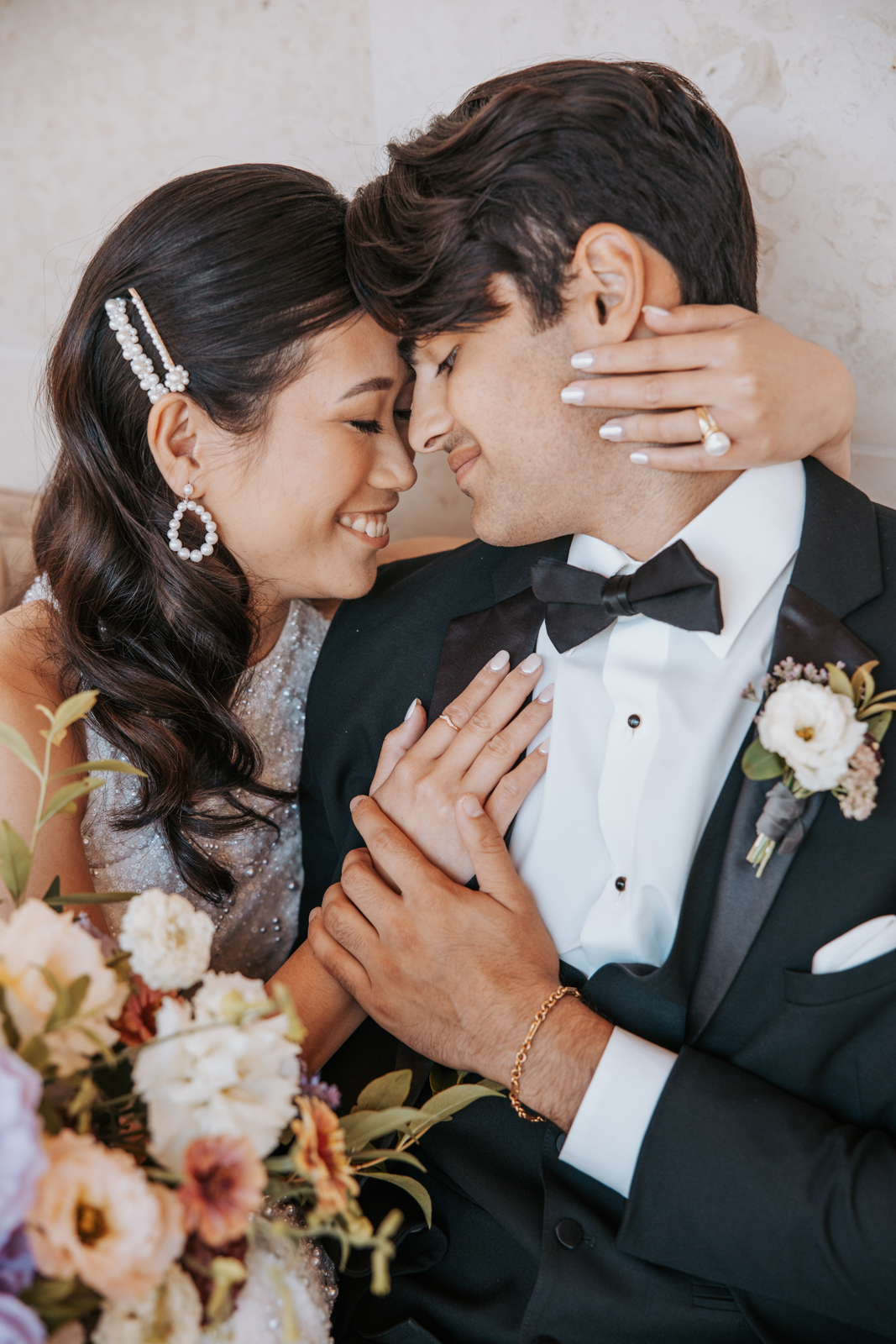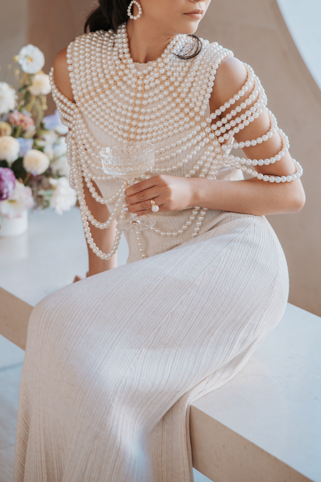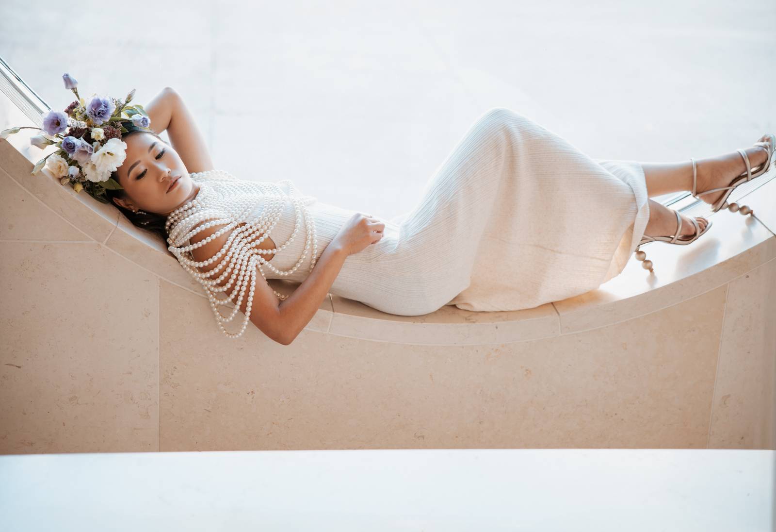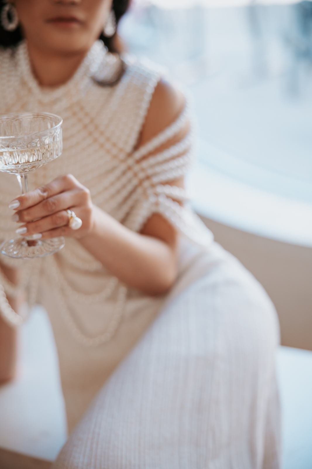 BK Salon styled her hair in trendy Hollywood glam waves with a sleek middle part accented with stacked pearl barrettes, adding a contemporary touch that tied into the overall pearl-inspired theme.