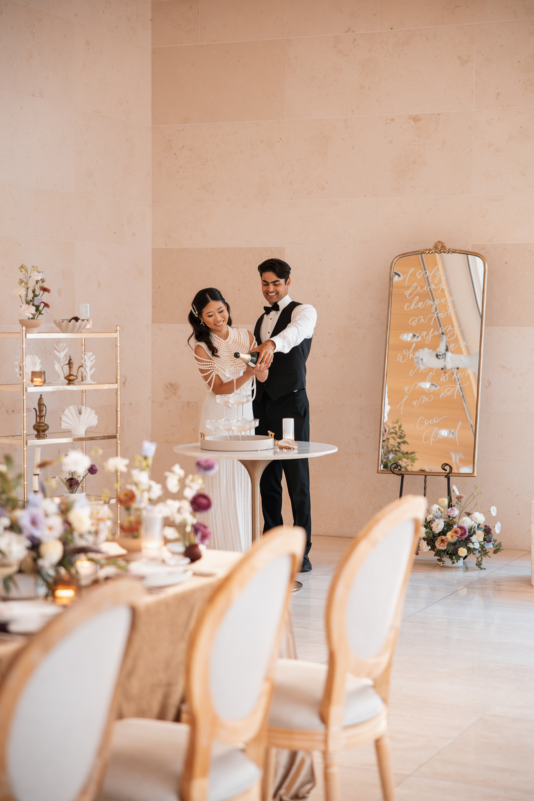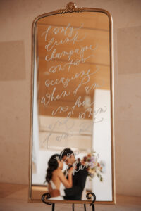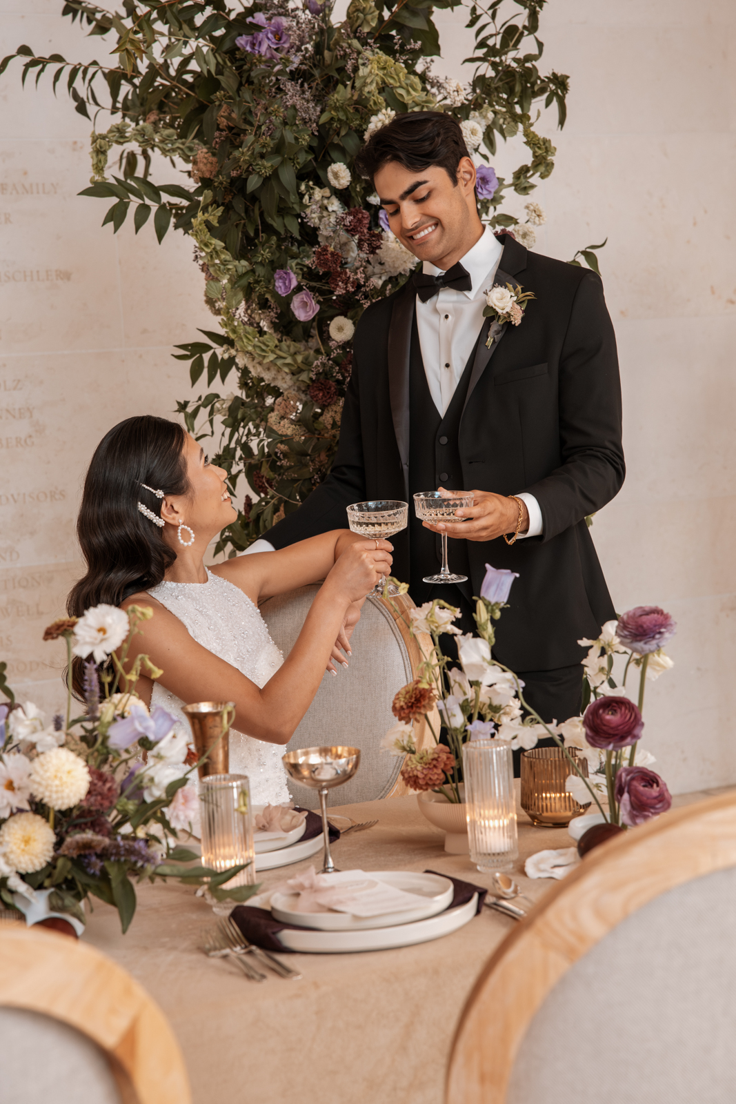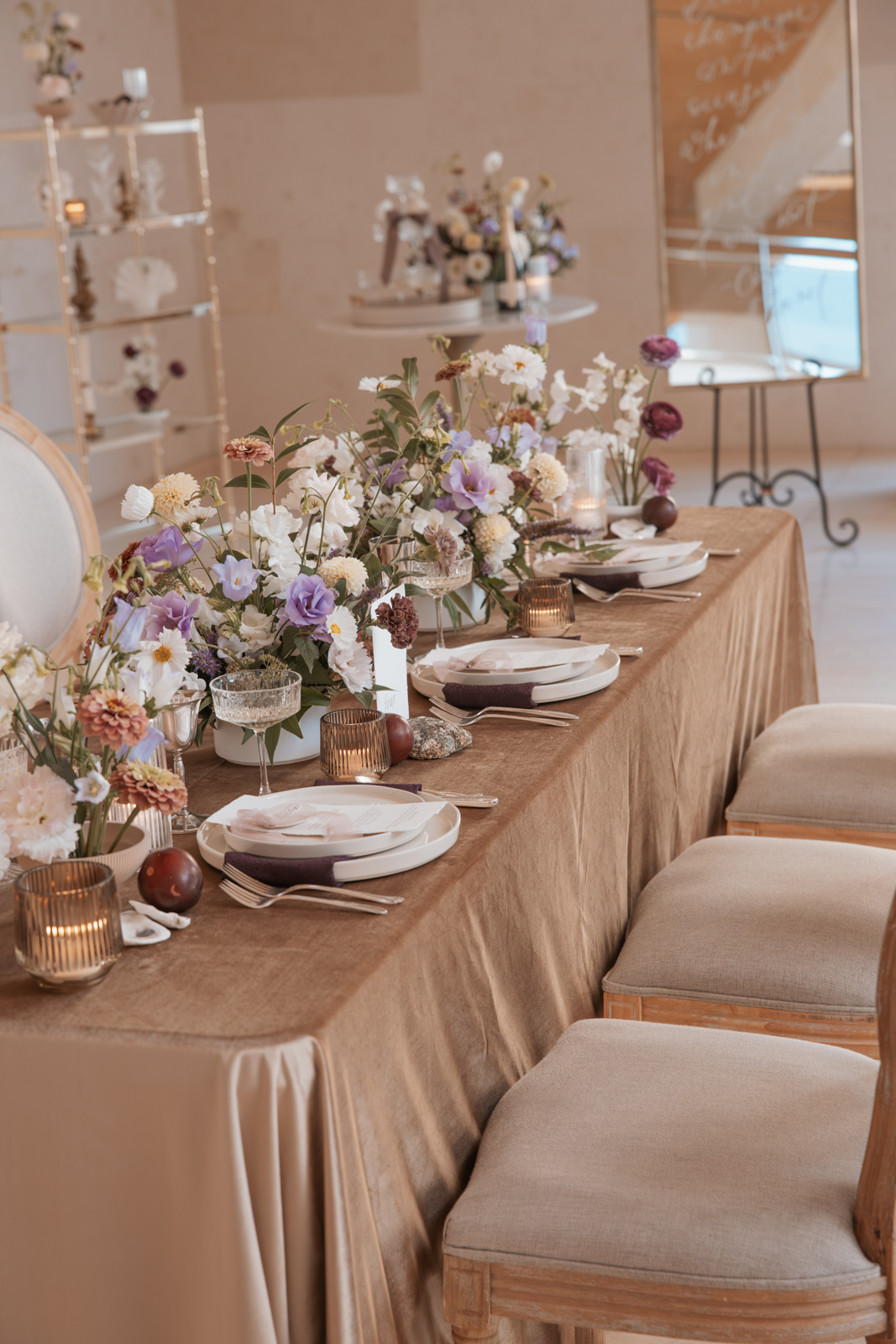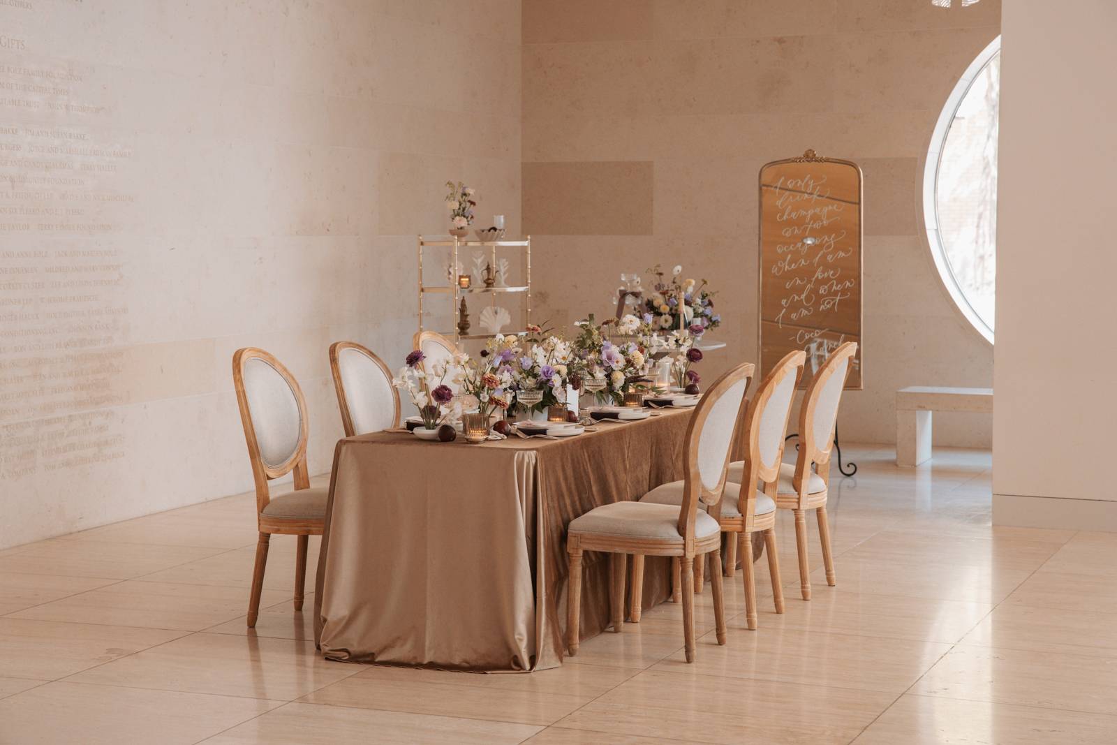 Velvet Rentals provided a stunning array of carefully curated pieces that elevated the overall design of the shoot and created a refined, cohesive atmosphere. Their Concrete Pedestal Set was used throughout the space to display lush florals and candles, adding a modern, sculptural element. For seating, their elegant French Dining Chairs brought a warm sophistication to both the ceremony and reception. In the lounge area, their tan velvet Hotel Sofa, with its clean lines and gold-tipped legs, provided a versatile and elegant seating option, while the modern Aubergine Chairs added a pop of rich purple. Their Antique Brass Shelf and Venice Mirror complemented the space with their graceful brass finishes, the latter also serving as a striking signage element and unique photo opportunity featuring a hand-calligraphed quote by Lettered by Shi.