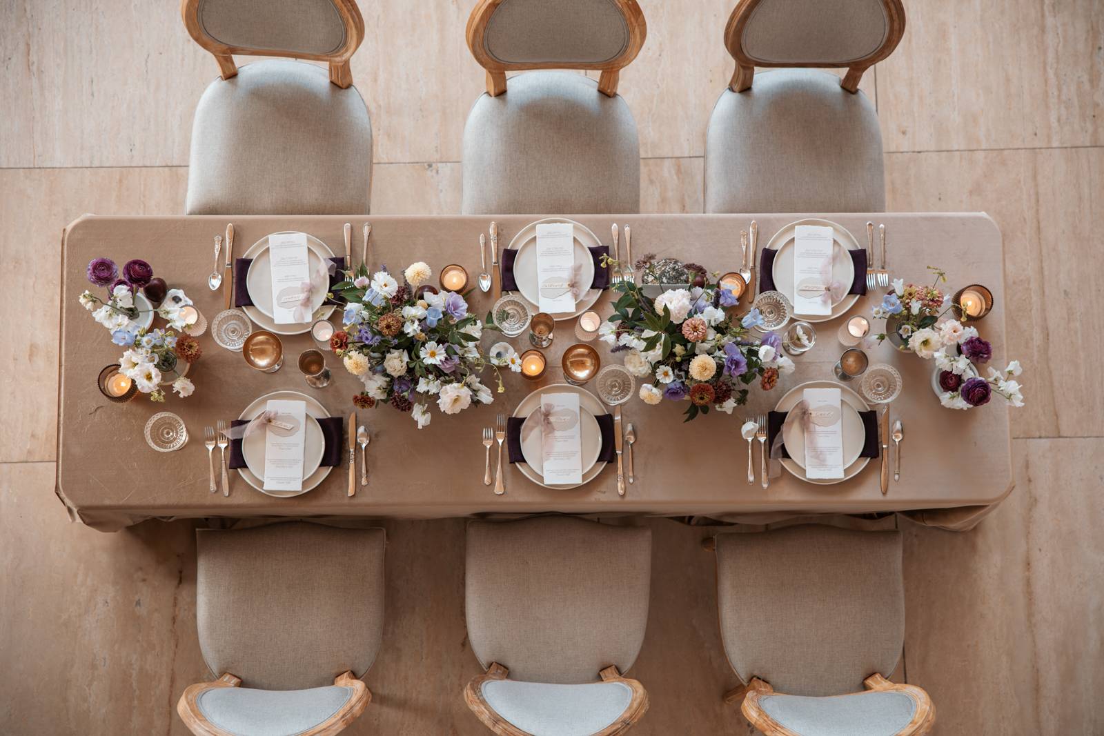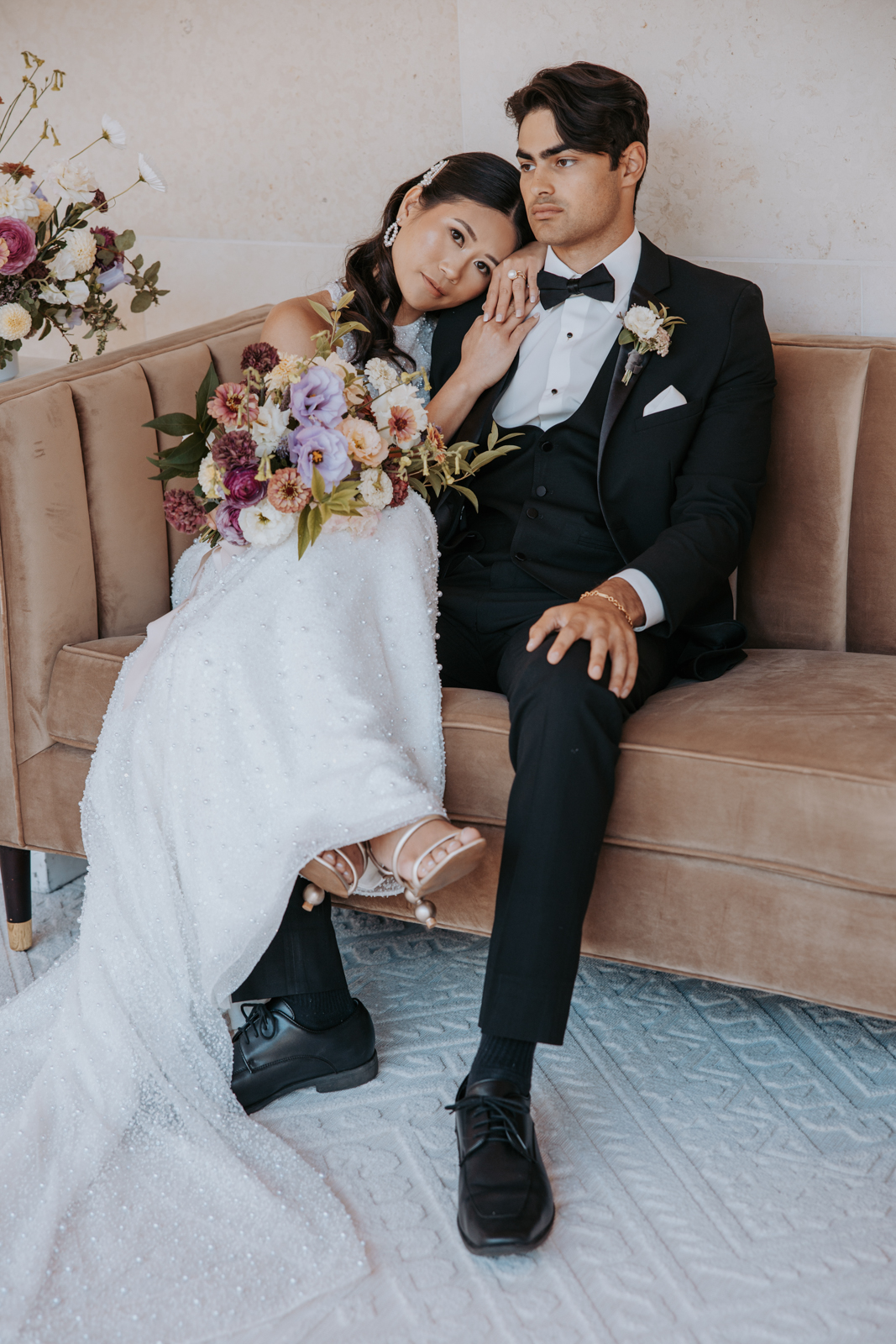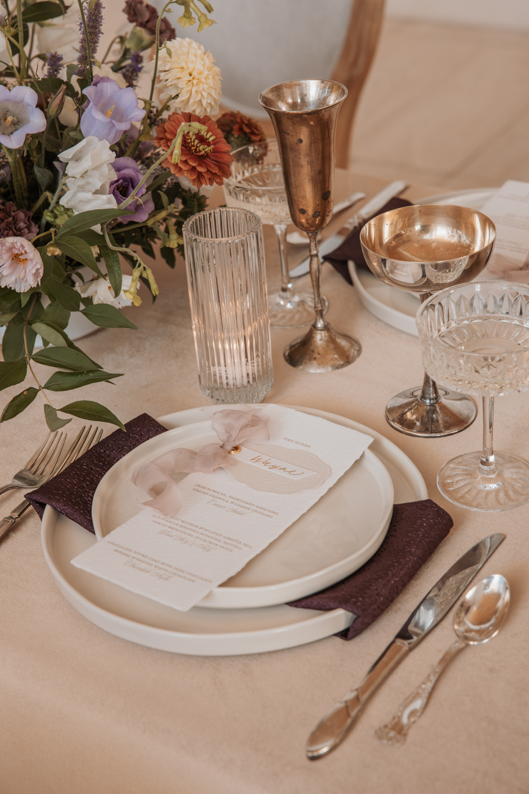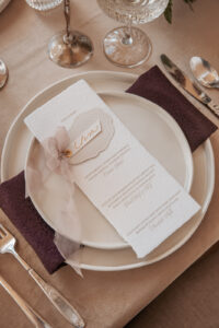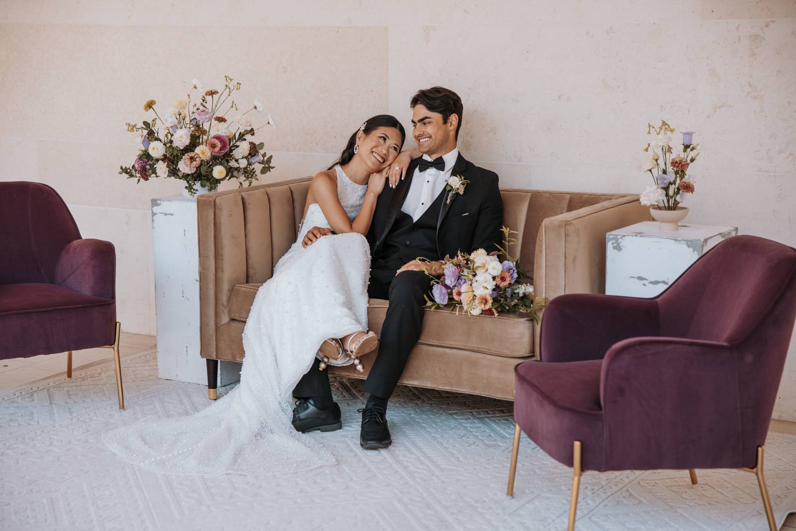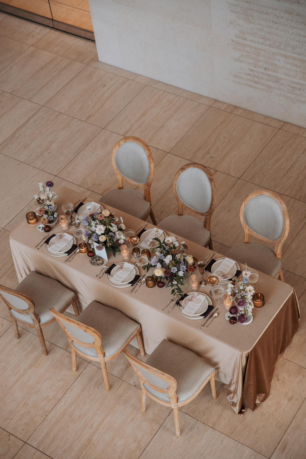 Velvet Rentals provided a stunning array of carefully curated pieces that elevated the overall design of the shoot and created a refined, cohesive atmosphere. Their Concrete Pedestal Set was used throughout the space to display lush florals and candles, adding a modern, sculptural element. For seating, their elegant French Dining Chairs brought a warm sophistication to both the ceremony and reception. In the lounge area, their tan velvet Hotel Sofa, with its clean lines and gold-tipped legs, provided a versatile and elegant seating option, while the modern Aubergine Chairs added a pop of rich purple. Their Antique Brass Shelf and Venice Mirror complemented the space with their graceful brass finishes, the latter also serving as a striking signage element and unique photo opportunity featuring a hand-calligraphed quote by Lettered by Shi.
