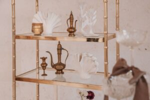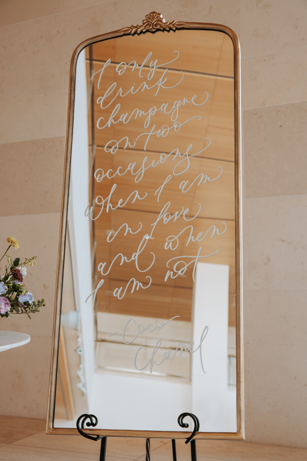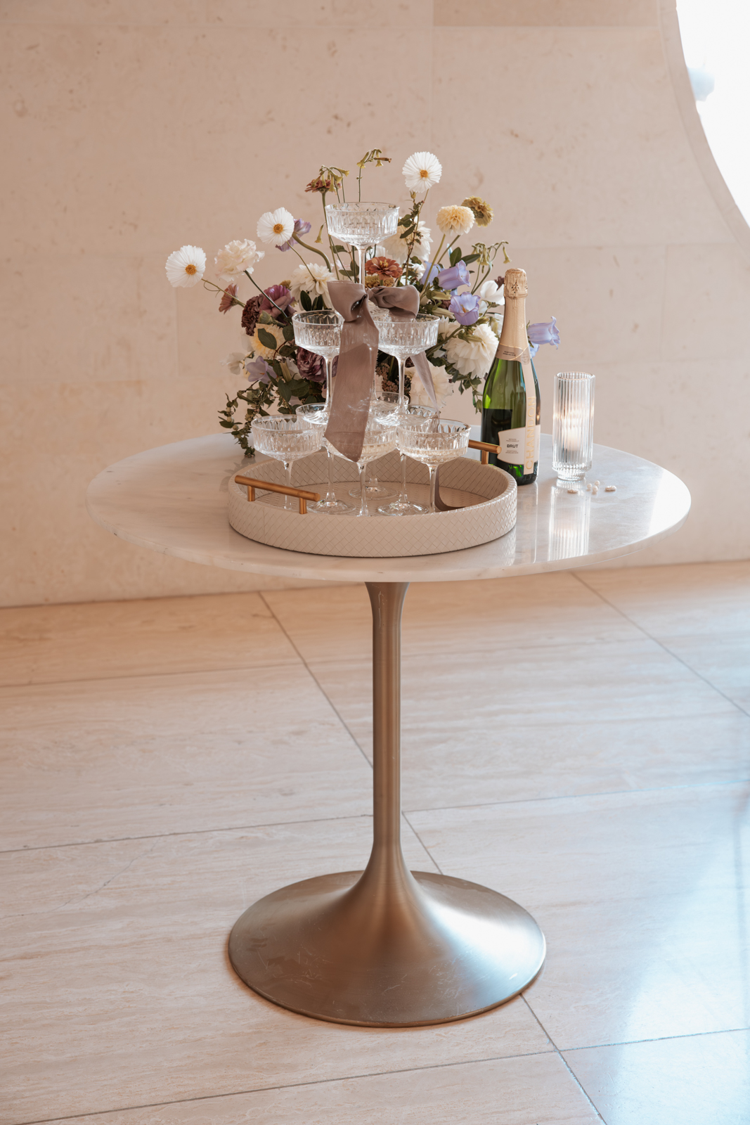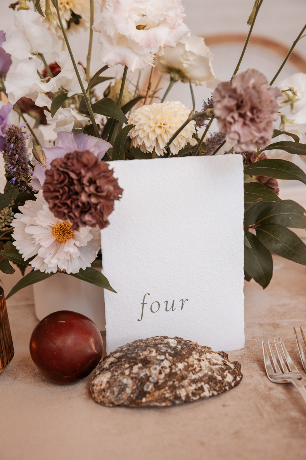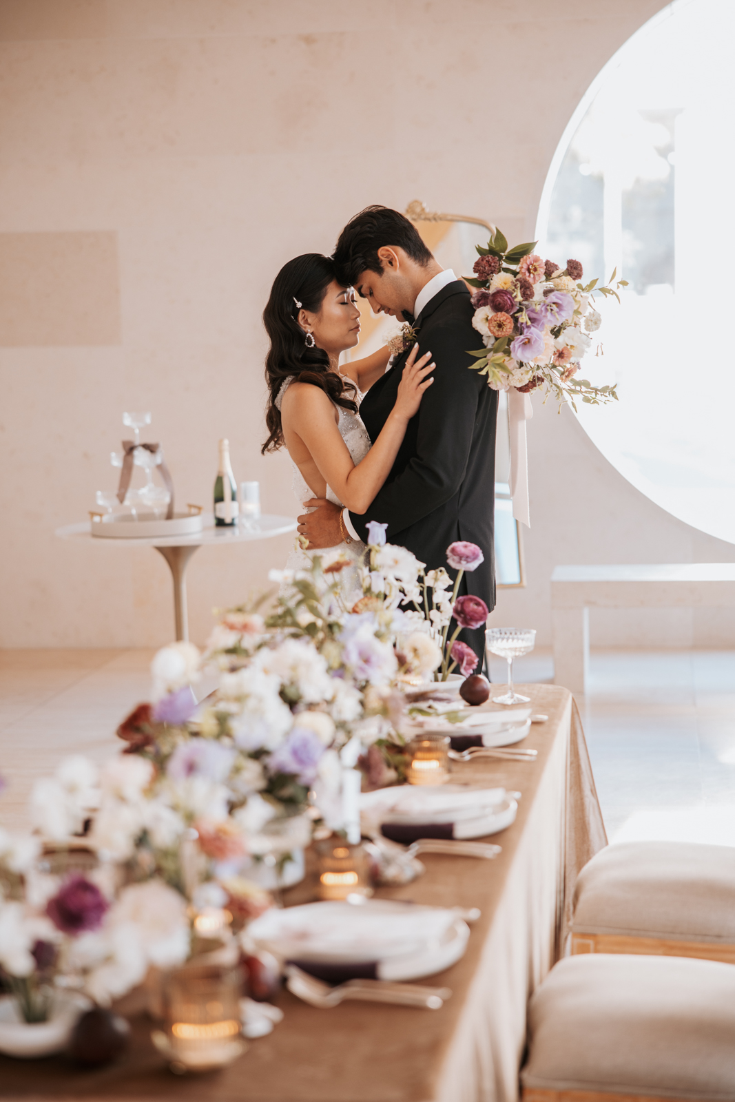 Velvet Rentals provided a stunning array of carefully curated pieces that elevated the overall design of the shoot and created a refined, cohesive atmosphere. Their Concrete Pedestal Set was used throughout the space to display lush florals and candles, adding a modern, sculptural element. For seating, their elegant French Dining Chairs brought a warm sophistication to both the ceremony and reception. In the lounge area, their tan velvet Hotel Sofa, with its clean lines and gold-tipped legs, provided a versatile and elegant seating option, while the modern Aubergine Chairs added a pop of rich purple. Their Antique Brass Shelf and Venice Mirror complemented the space with their graceful brass finishes, the latter also serving as a striking signage element and unique photo opportunity featuring a hand-calligraphed quote by Lettered by Shi.