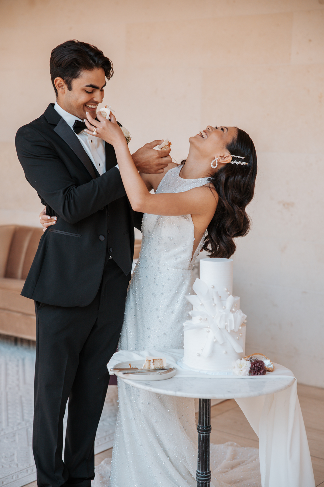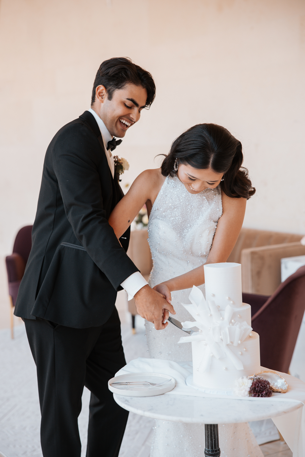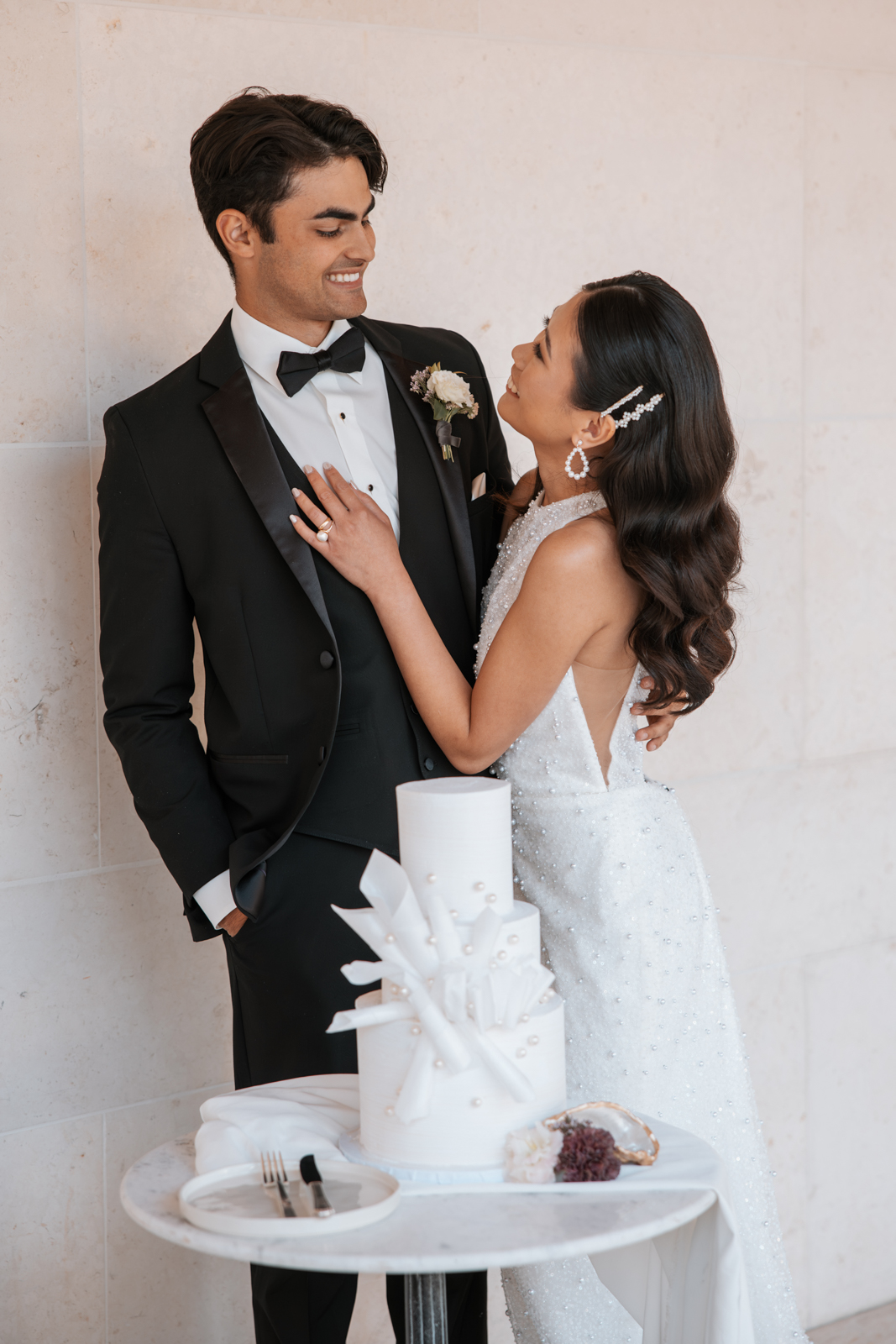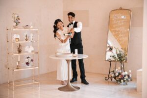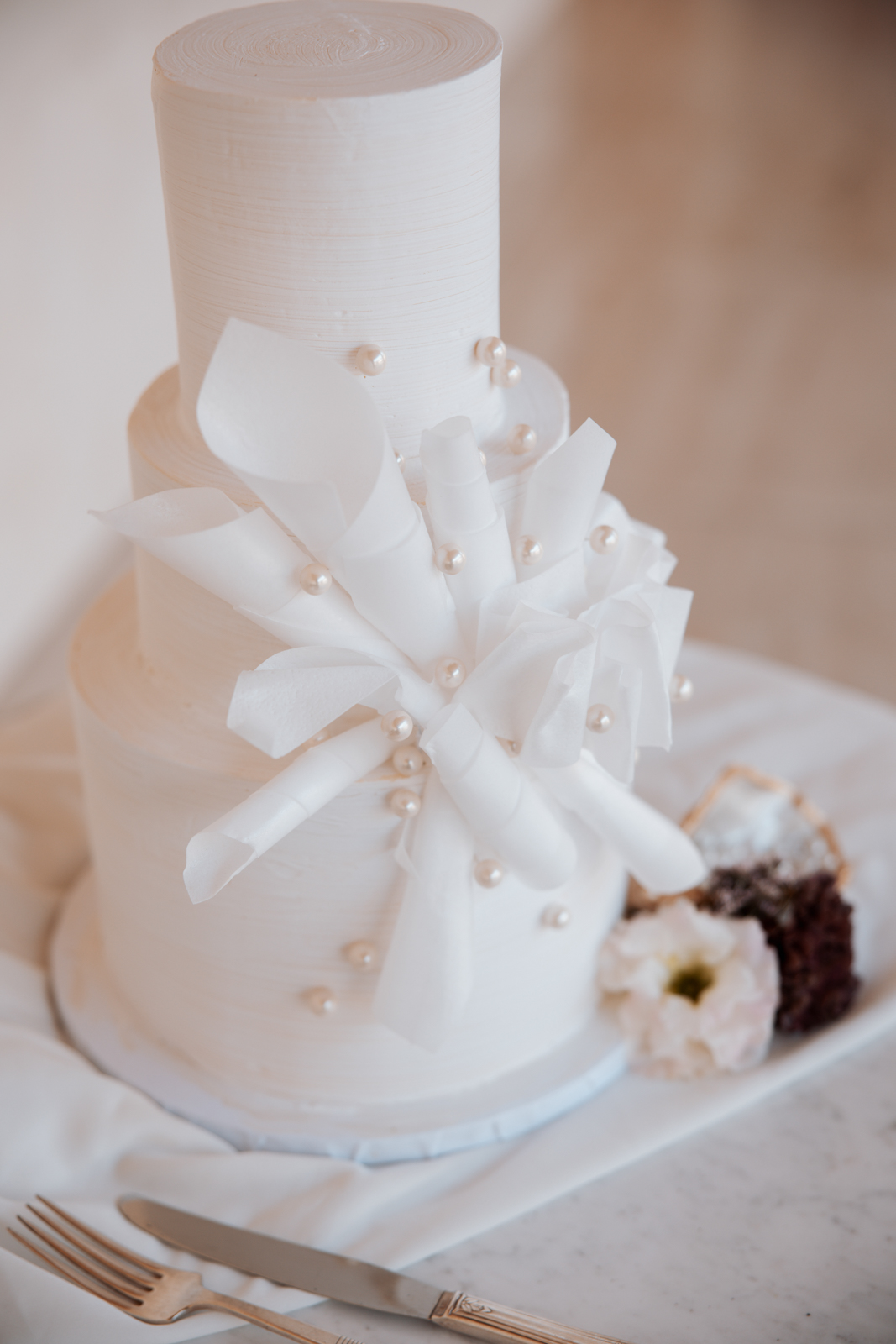 The Baked Lab crafted a modern, three-tier cake that perfectly complemented the shoot’s chic and luxe aesthetic. Featuring a heathered white design, the cake was adorned with artistic wafer paper detailing and delicate pearl accents, adding an elegant and contemporary touch. Its sleek yet textured look made it a standout centerpiece, beautifully tying together the event’s sophisticated and organic elements.