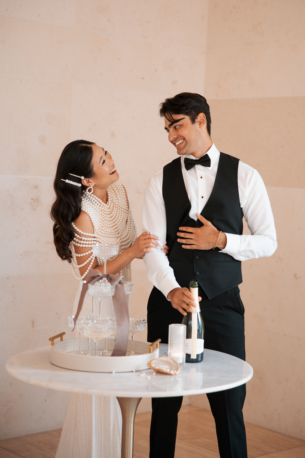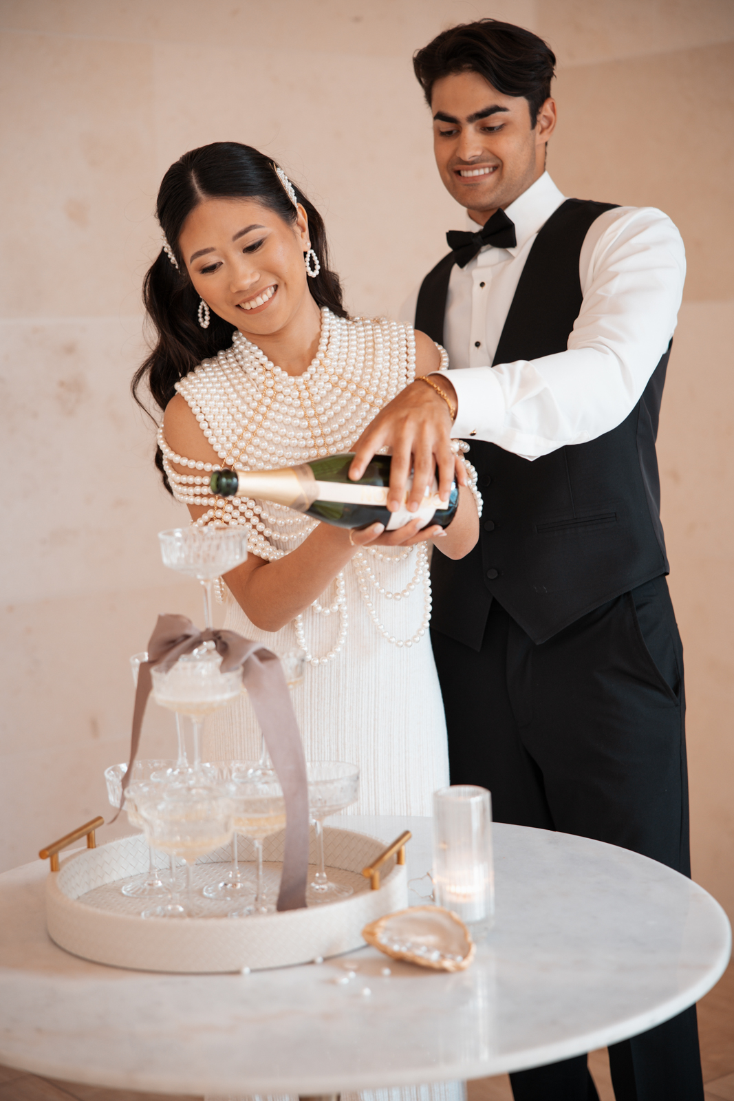 Coordinated and designed by Renee Breanne Design, this contemporary Pearls and Prosecco-themed soiree came to life thanks to a talented team of local vendors, including Emi’s Images, C*Lee Creations, Lettered by Shi, Sunborn Gardens, The Baked Lab, Camerata String Quartet, Brandi’s Bridal Galleria, Etc., DuBois Formalwear, BK Salon, JV Makeup Artist, and Velvet Rentals.