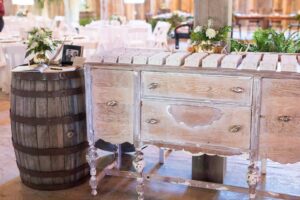 DID YOU USE ANY SPECIALTY LINENS, CHAIRS, DINNERWARE OR GLASSWARE? Head table had mix and match antique wood chairs from A La Crate Vintage Rentals. &n