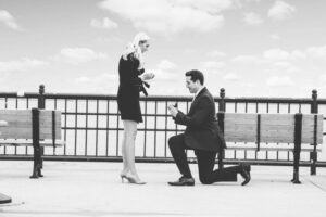 TELL US ABOUT YOUR PROPOSAL: The proposal was in Chicago, IL. We had a weekend planned with some friends for the NFL draft. What could be better than amazing shopping and football, right!? So we check into our hotel the first night of the draft and I was told we are meeting everyone out for at a nice place for dinner. A limo picks us up at the hotel and takes us to Navy Pier, which at this point I was wondering what was going on but Zach assured me this is where we were meeting everyone for dinner. It wasn’t until he practically sprinted down Navy Pier with me and we passed our restaurant that I had any clue what was going on! We get to the end of the pier and Zach gave me a present to open and it was a dog tag that said, “Bogey” and the date. I was so excited because we had talked about getting a dog for a long time. I think I said something like, “Are we getting a puppy here?!?!” He tells me he hopes someday soon and to turn the dog tag around and it says, “Will You Marry Me?” By that time he is down on one knee with a gorgeous oval cut diamond ring (he must have looked at my Pinterest boards) asking me to marry him which I, of course, said “Yes!” It was such an amazing moment in both of our lives we will never forget! Plus, he had a secret photographer capturing the whole thing!