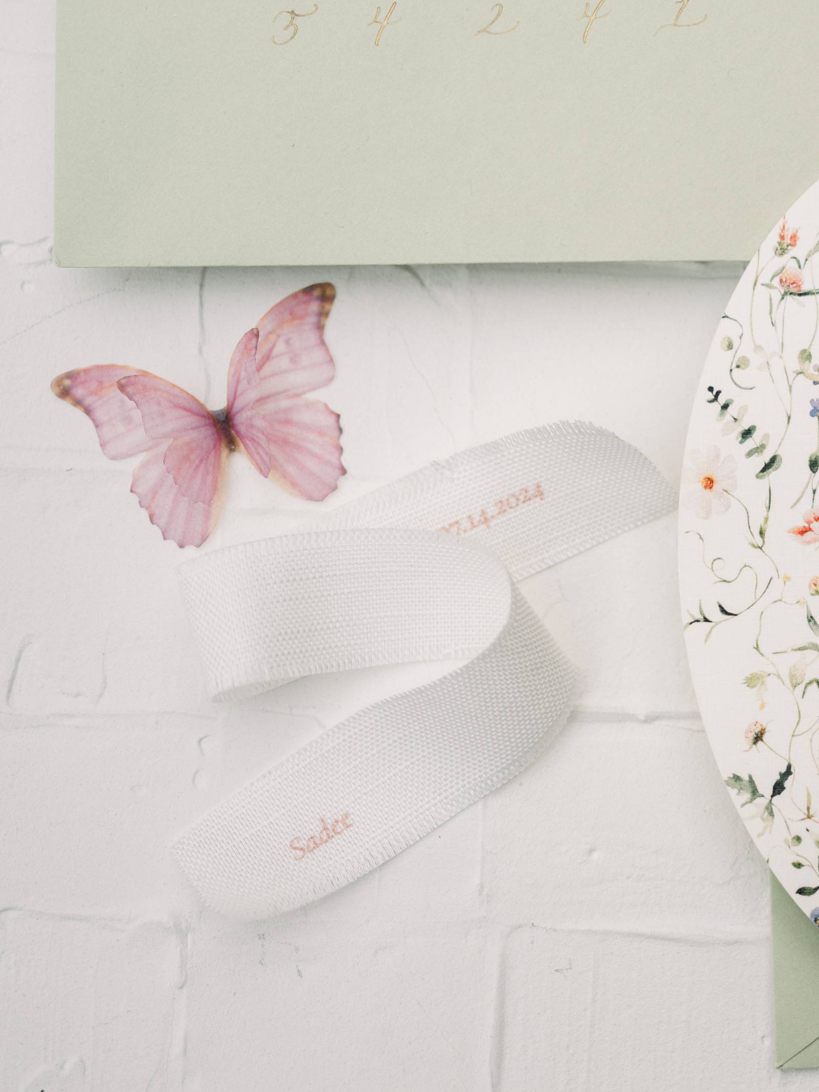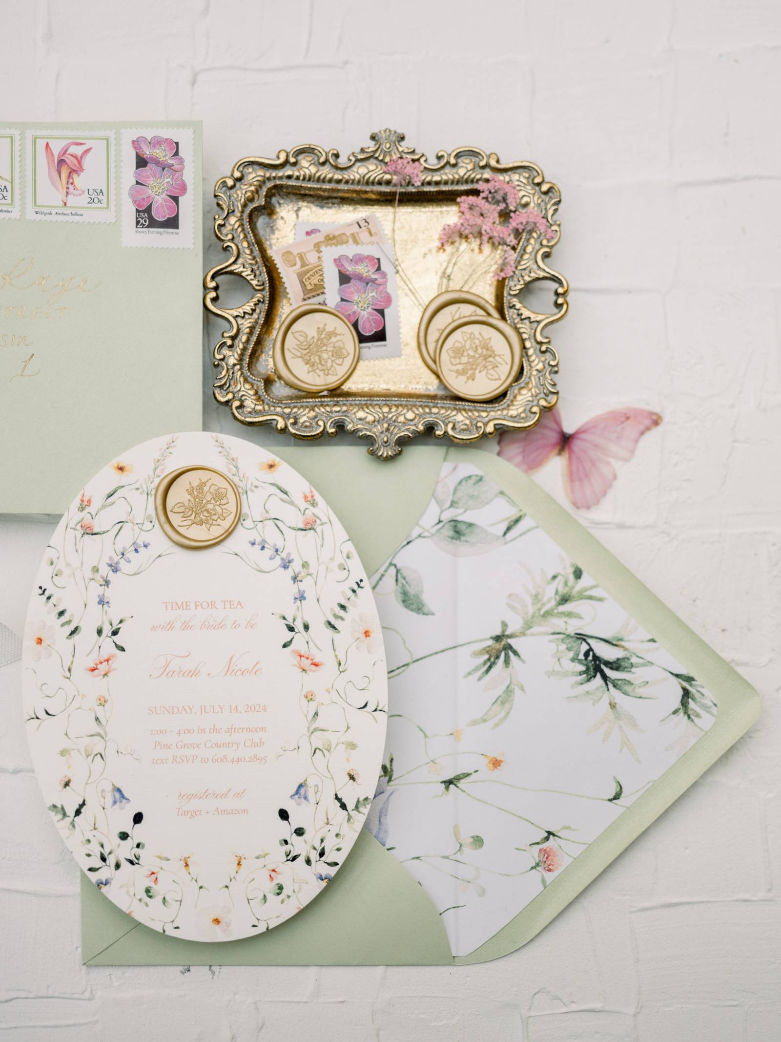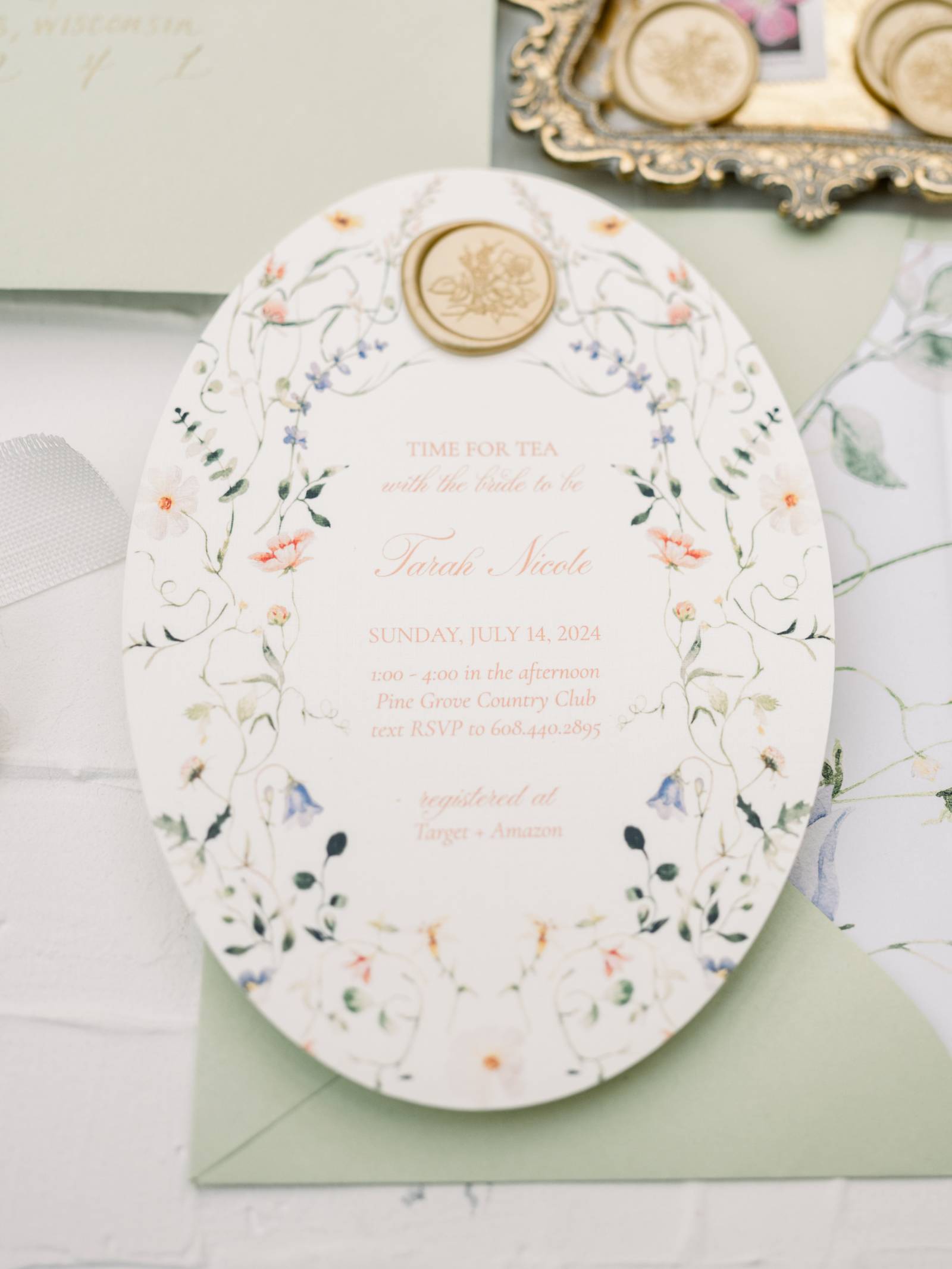 A delicate oval invitation designed by Lettered by Shi set the tone for the celebration with a colorful floral crest frame delivered in a hand-lettered pale green envelope lined with coordinating floral print paper. Linen ties added both texture and personalization to a teacup seating wall later to be enjoyed by guests.