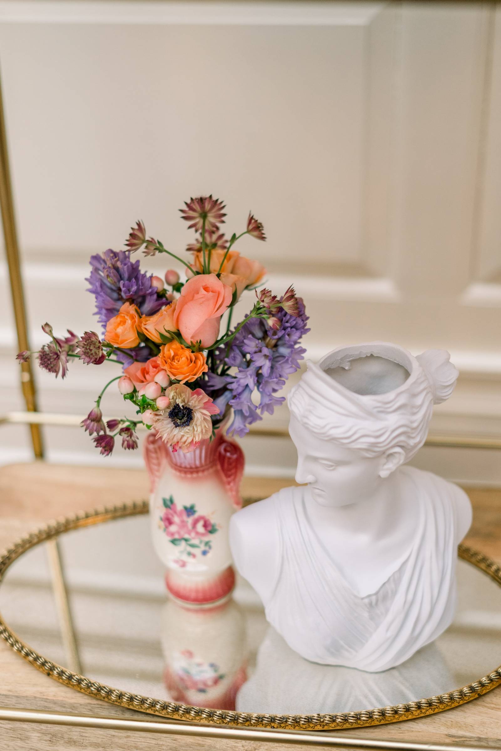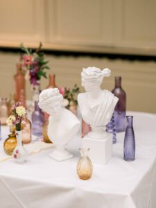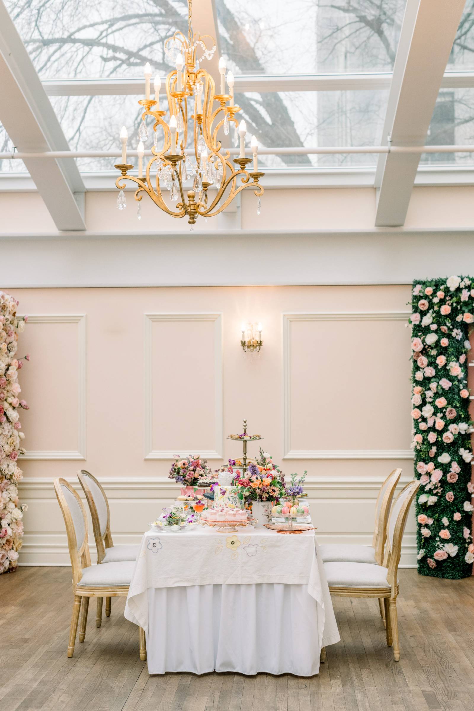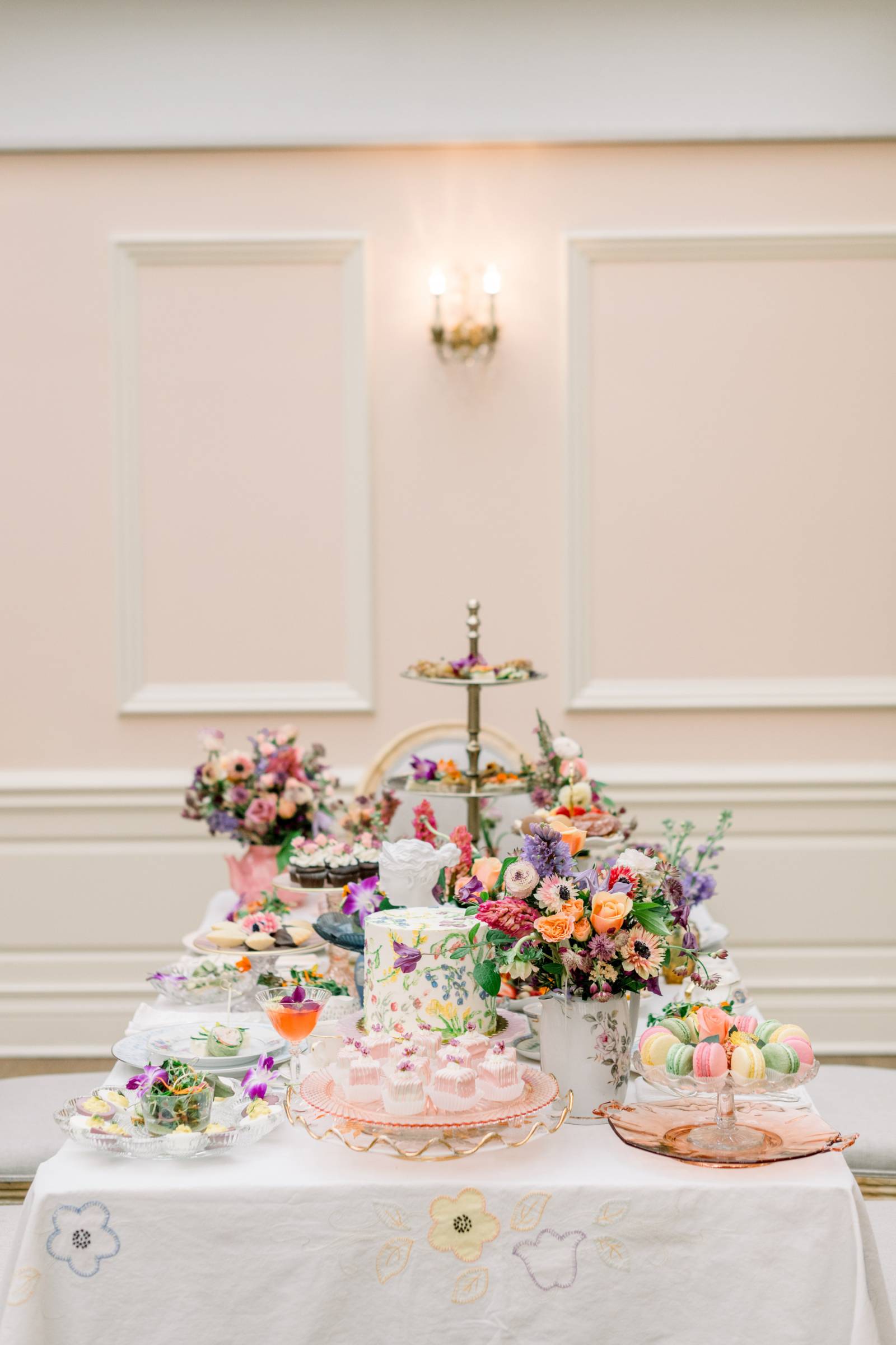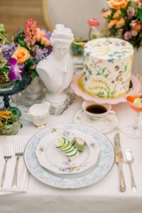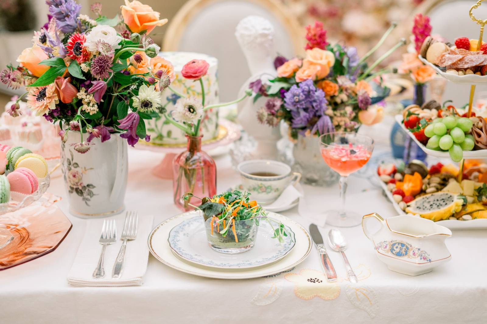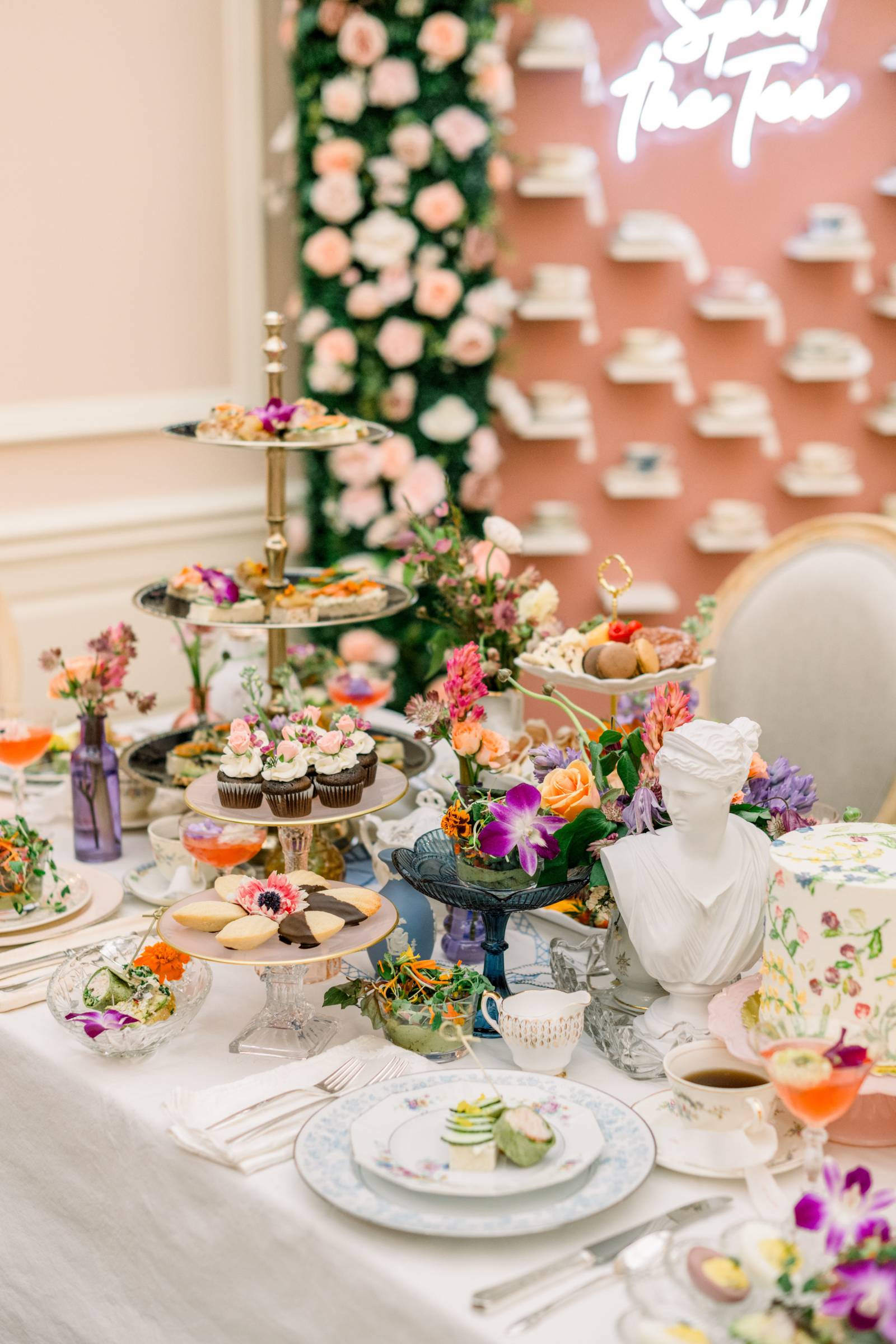 Velvet Rentals provided unique and curated items from their collection of rentals to set the atmosphere for a fashionable affair! Their French dining chairs, Greek Apollo and Diana bust sets, and arrays of vintage dishware, teacups, saucers, teapots, dessert stands, and serving trays elevated the shower’s design.