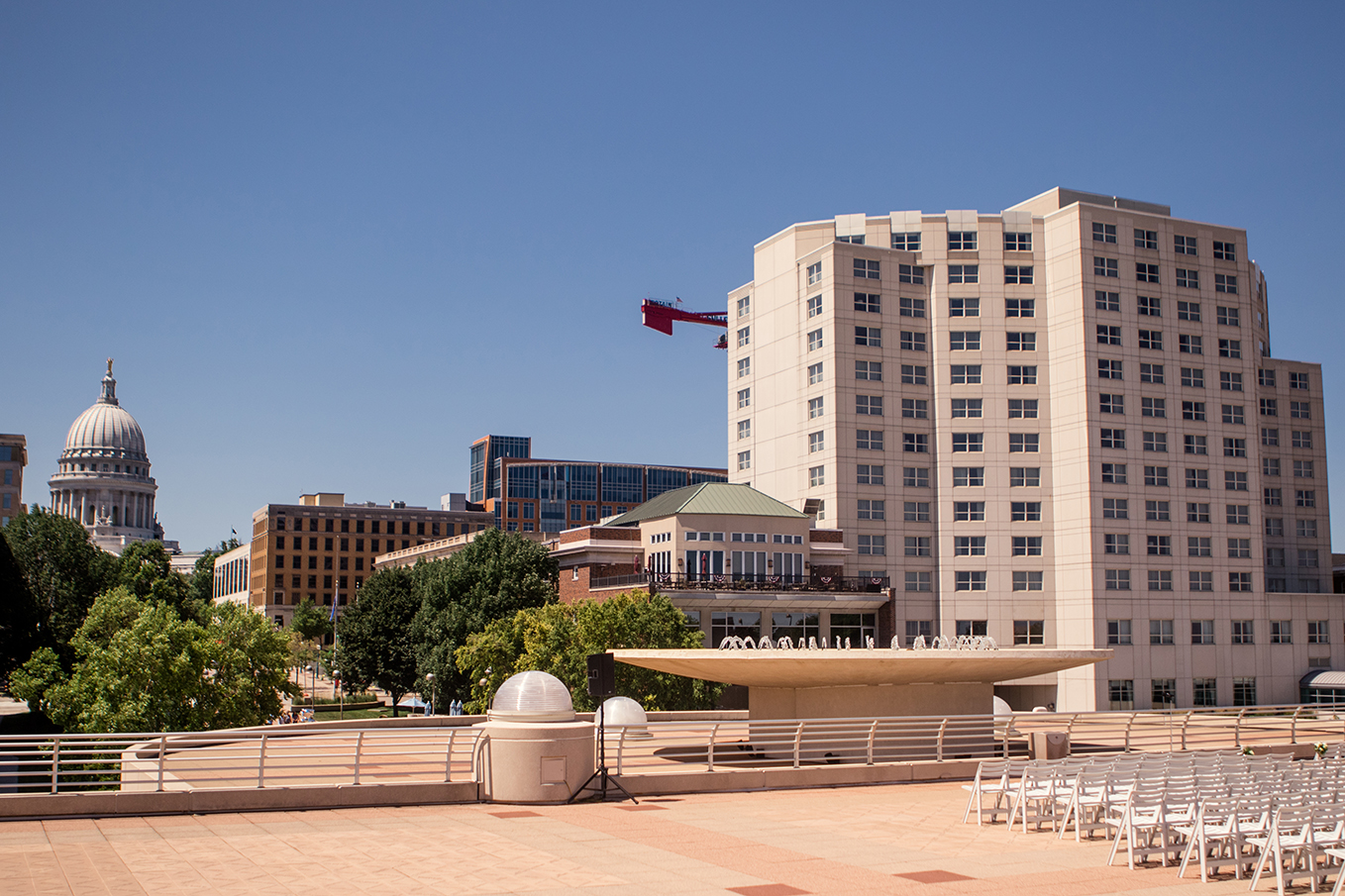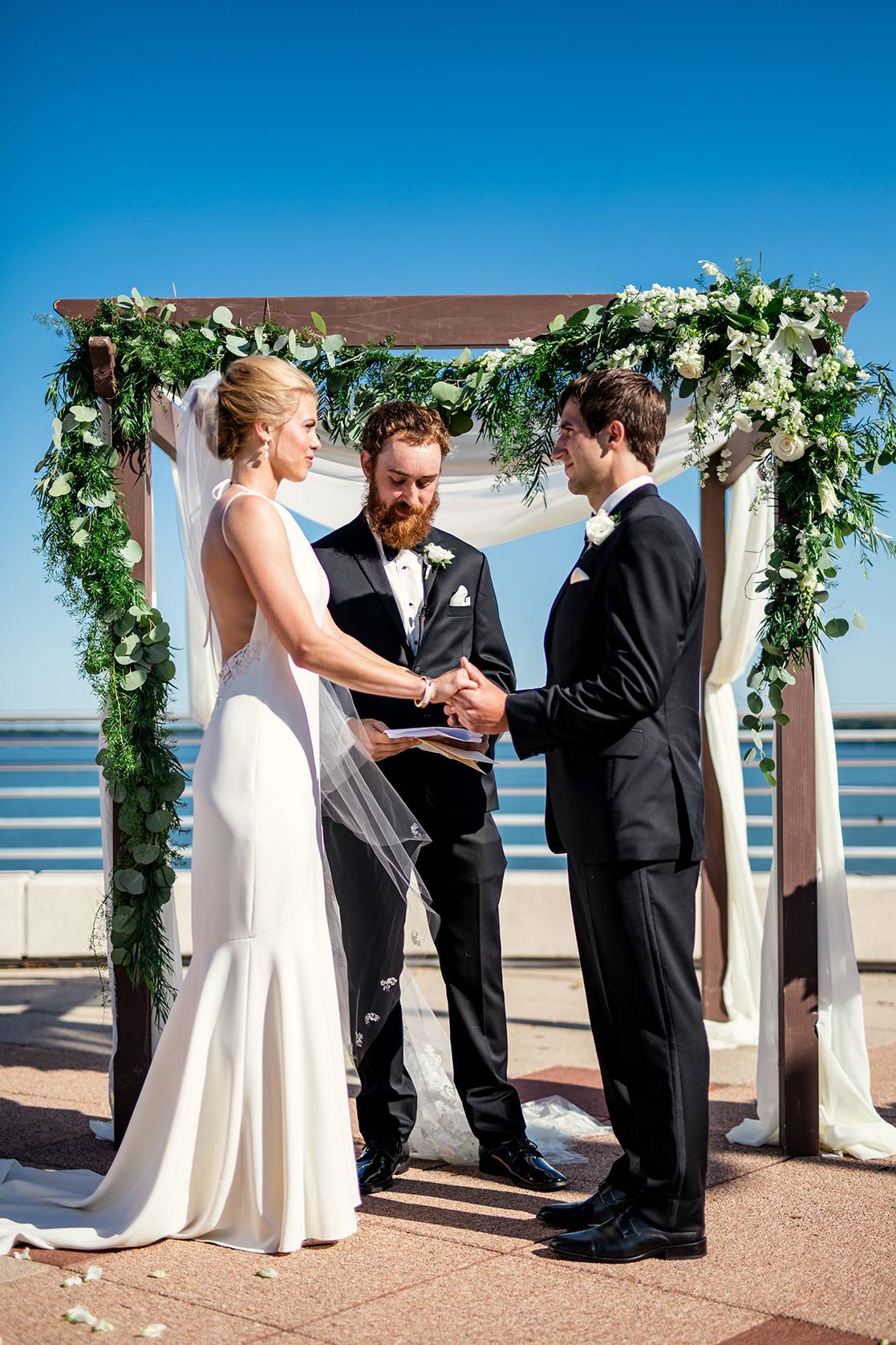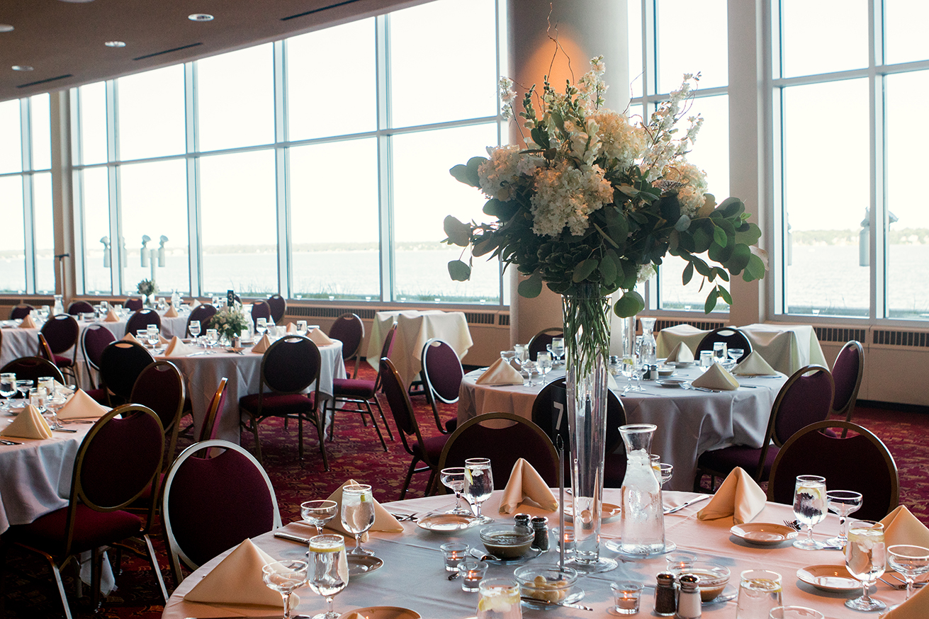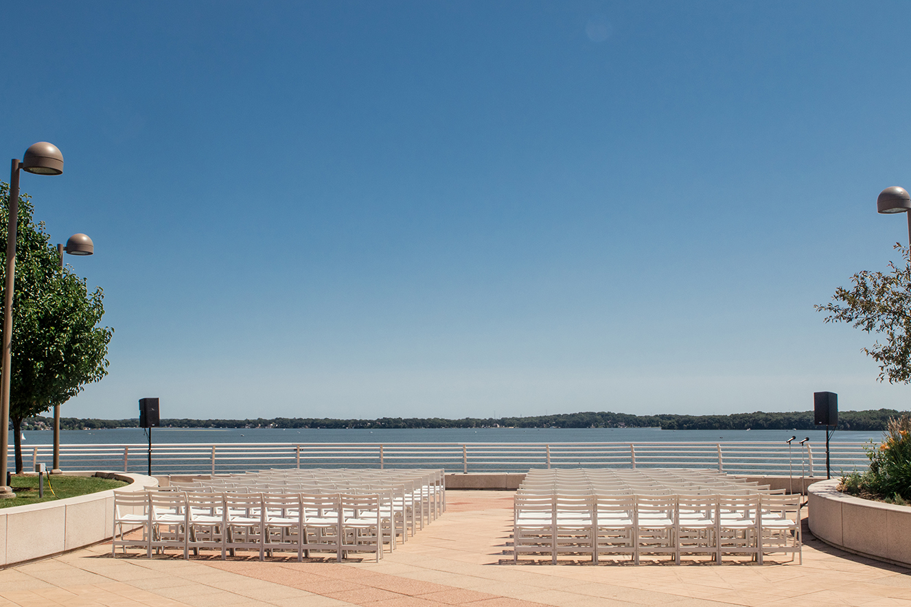 Peaceful and classic, shades of cream, ivory, and champagne repeatedly stand the test of time, especially when paired with soft greenery as showcased in this heavenly Madison wedding. Splendid views of Lake Monona were enjoyed from the rooftop ceremony at the Monona Terrace, with the bride and groom surrounded by family and friends, as well their beloved Labrador, who joined the wedding party as the ring bearer. Elaina and Nate offer great advice to other couples planning weddings. Be sure to read what their favorite moment of their wedding day was!