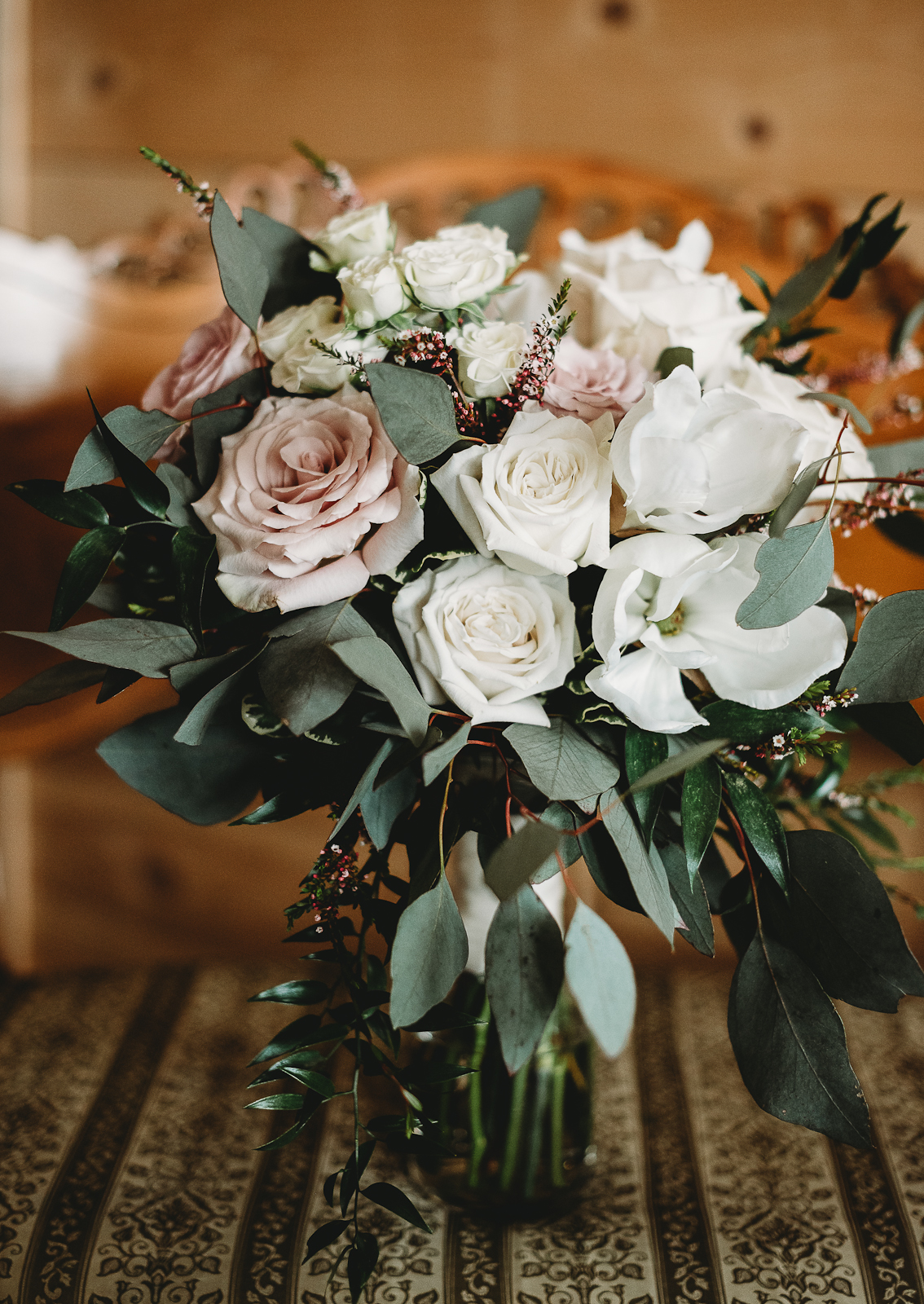 DESCRIBE YOUR WEDDING FLOWERS: There were white and light pink roses, magnolias, and eucalyptus.