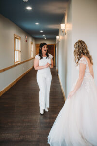 Hallie got her wedding suit at Elle James Bridal in Ridgeland, Mississippi. They got in a few jumpsuits for her to try on, then we mixed and matched our favorite parts of each, and they sent our idea off to the designer “Amsale” to sketch what they thought we wanted, and it was perfect! They had it specially made for her.