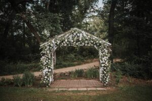 From a winding, floral-lined aisle leading to a stunning ceremony arch bursting with white blooms to a statement bridal bouquet featuring a magical smoky quartz crystal handle, modern and romantic reception arrangements, and so much more, their array of elegant blooms and lush foliage brought elegance and enchantment to every corner of the celebration.
