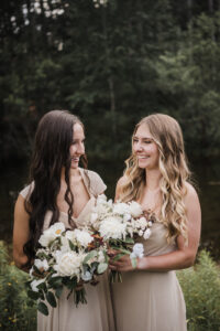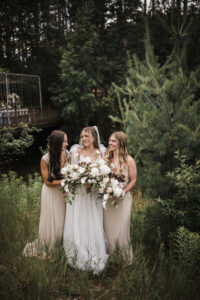 Beautifully styled by Bridal Boutique, the bride embodied her forest fairytale vision in a flowing A-line gown adorned with whimsical bow details on the shoulders. Her bridesmaids wore soft, creamy neutral dresses, perfectly complementing the elegant, earthy tones of the day.