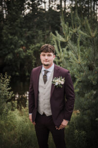 The groom made a statement in a rich purple suit from Men’s Wearhouse, paired with a beige vest and crisp white shirt. Complemented by brown leather shoes, a floral-patterned tie, and a unique pocket boutonniere, his look struck the perfect balance of elegance and bold style, perfectly suited for an evening of woodland romance.