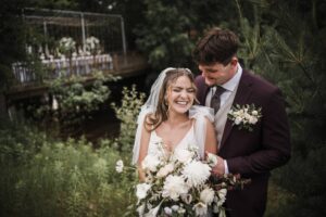 A showstopping cake from Cowboy David’s Bakery was a two-tiered white masterpiece, featuring a textured finish adorned with elegant white flowers. Delicate gold foil detailing shimmered across the design, while small twigs were artfully intertwined, echoing the surrounding woodland setting and adding a perfect natural touch.