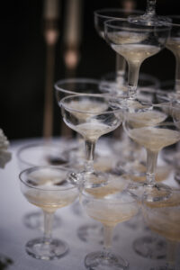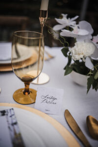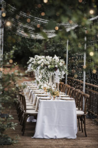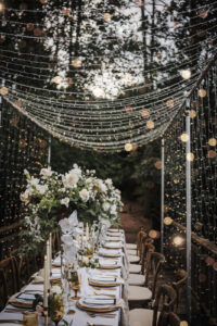 A showstopping reception table was nestled beneath a canopy of sparkling lights, casting a soft, magical glow over the elegantly arranged setting. Carried over from the ceremony, the tablescape featured several stunning rental pieces from Event Essentials, including their exquisite “French Country Natural Chairs,” which added a touch of rustic charm. Gold chargers and flatware gleamed against a neutral linen tablecloth, while white plates were complemented by gold-detailed napkins and elegant amber glassware.