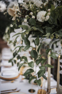 Lush, elevated floral arrangements, low Ikebana-style designs, and dreamy taper candles from B-Style Floral & Gifts completed the look, creating a sophisticated yet inviting atmosphere enveloped in greenery for the fairytale-like celebration.