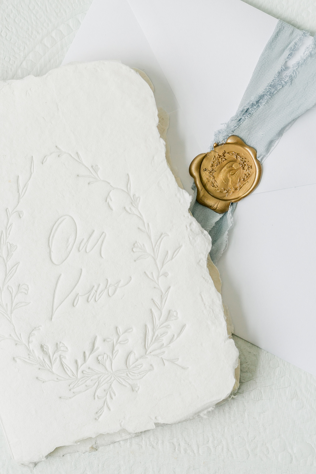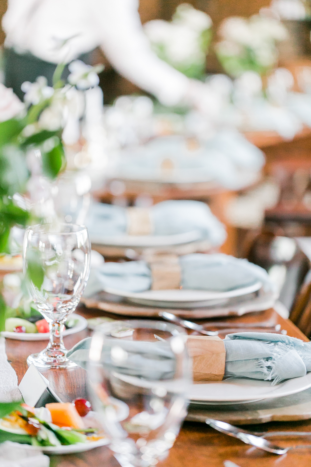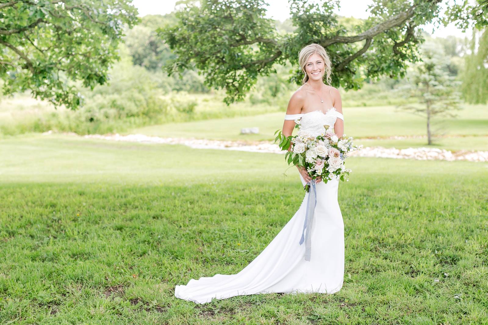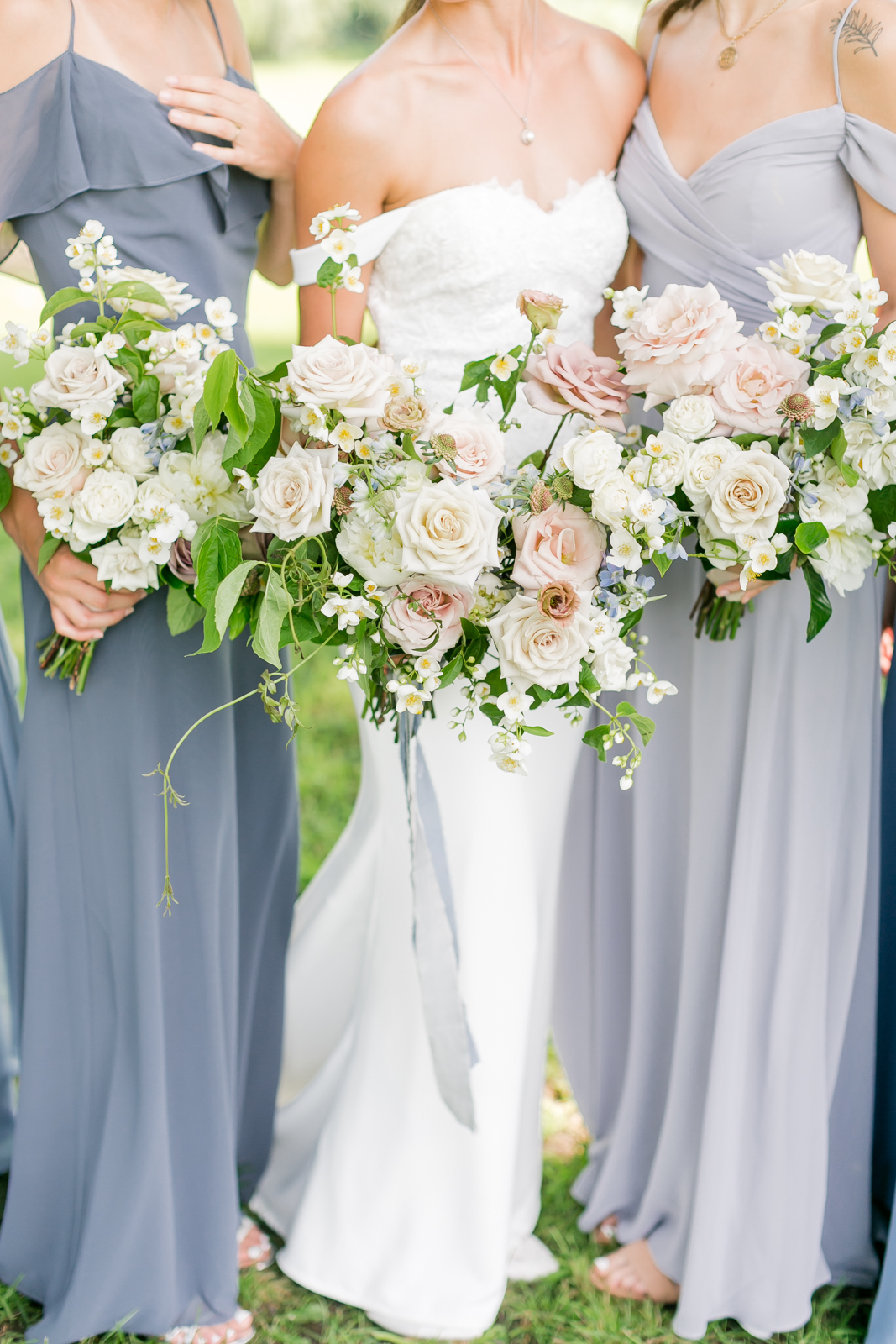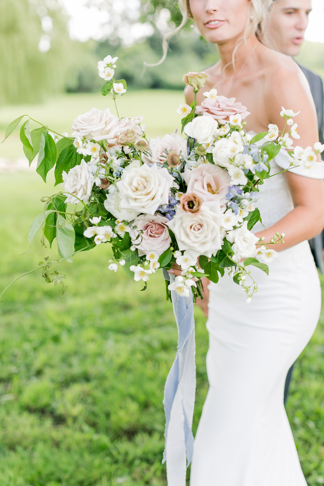 DDING FLOWERS: A beautiful loose floral bouquet, with wispy blooms of mock orange, lisianthus, and delphinium surrounding the most beautiful sweet-smelling ivory/blush garden roses. A delicate long dusty blue ribbon wrapped and finished off the bouquet perfectly. Attached to the bouquet was my “something blue,” a blue pearl paired with a pendant with our wedding date engraved on it; my mother gave me this.