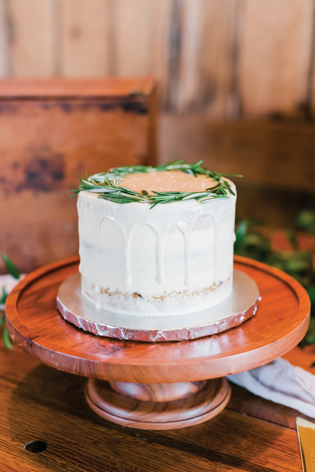 Our cute cutting cake was ordered from Bloom Bake Shop. We went with a more interesting cake flavor – black tea and fig with buttercream frosting. The cake was semi-naked and topped with a halo of rosemary. It looked simple, natural, fit our scheme perfectly, and tasted so good!
