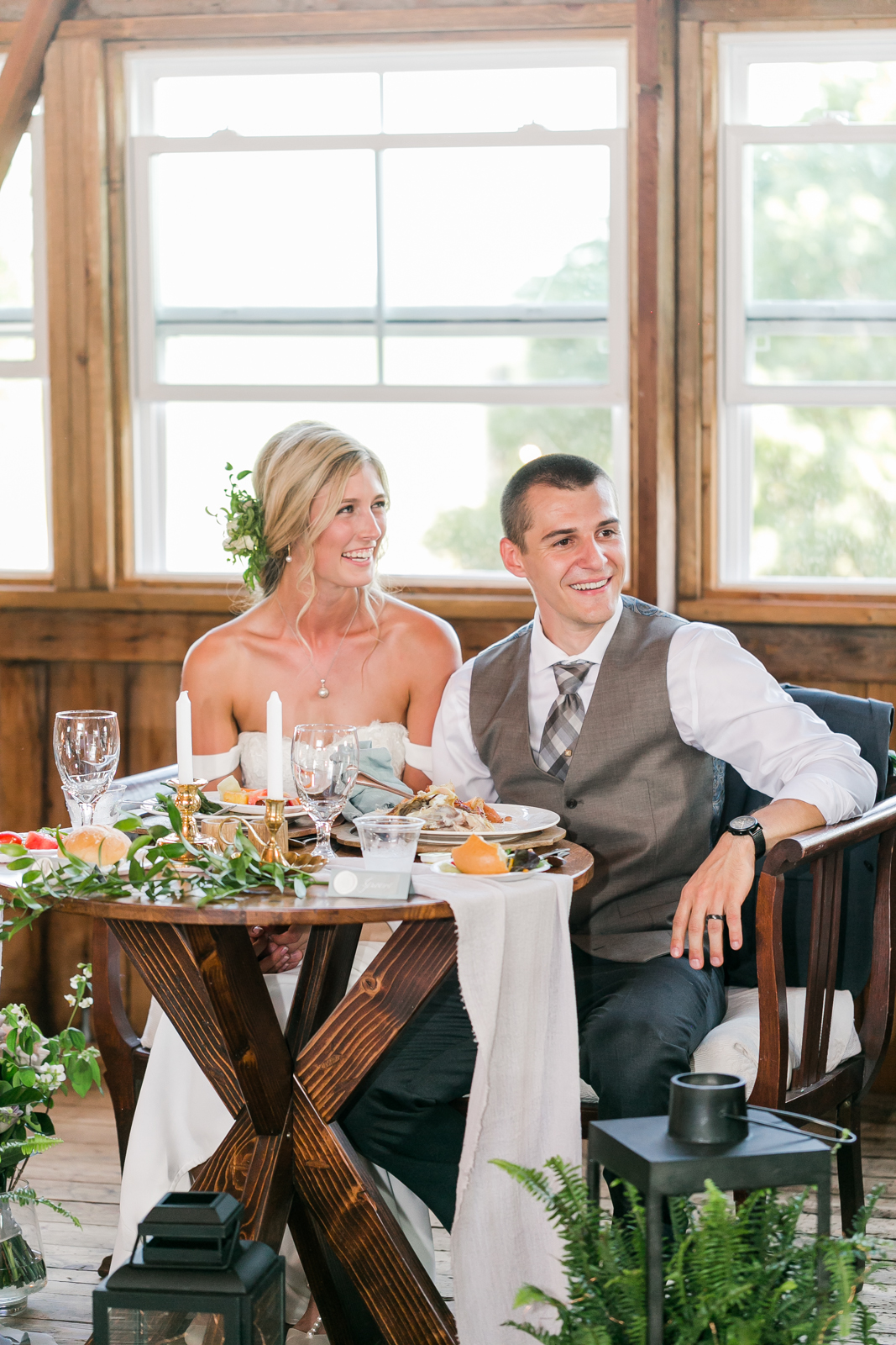 DID YOU USE ANY SPECIALTY CHAIRS, LINENS, CHARGERS, GLASSWARE OR DINNERWARE? Instead of sitting on a long banquet table with our bridal party, Chad and I sat at our own sweetheart table. This table and its decorations were beautifully pulled together by a sweetheart settee that we rented from Velvet Rental. It was so comfortable and allowed us to snuggle in close together during supper.