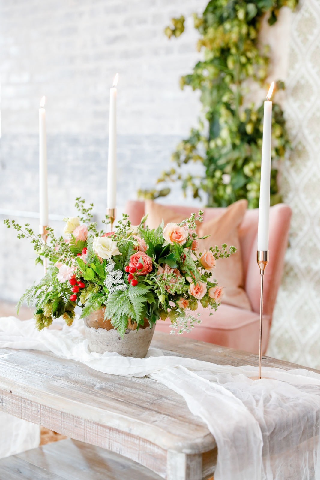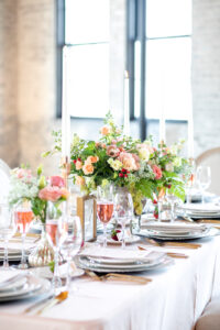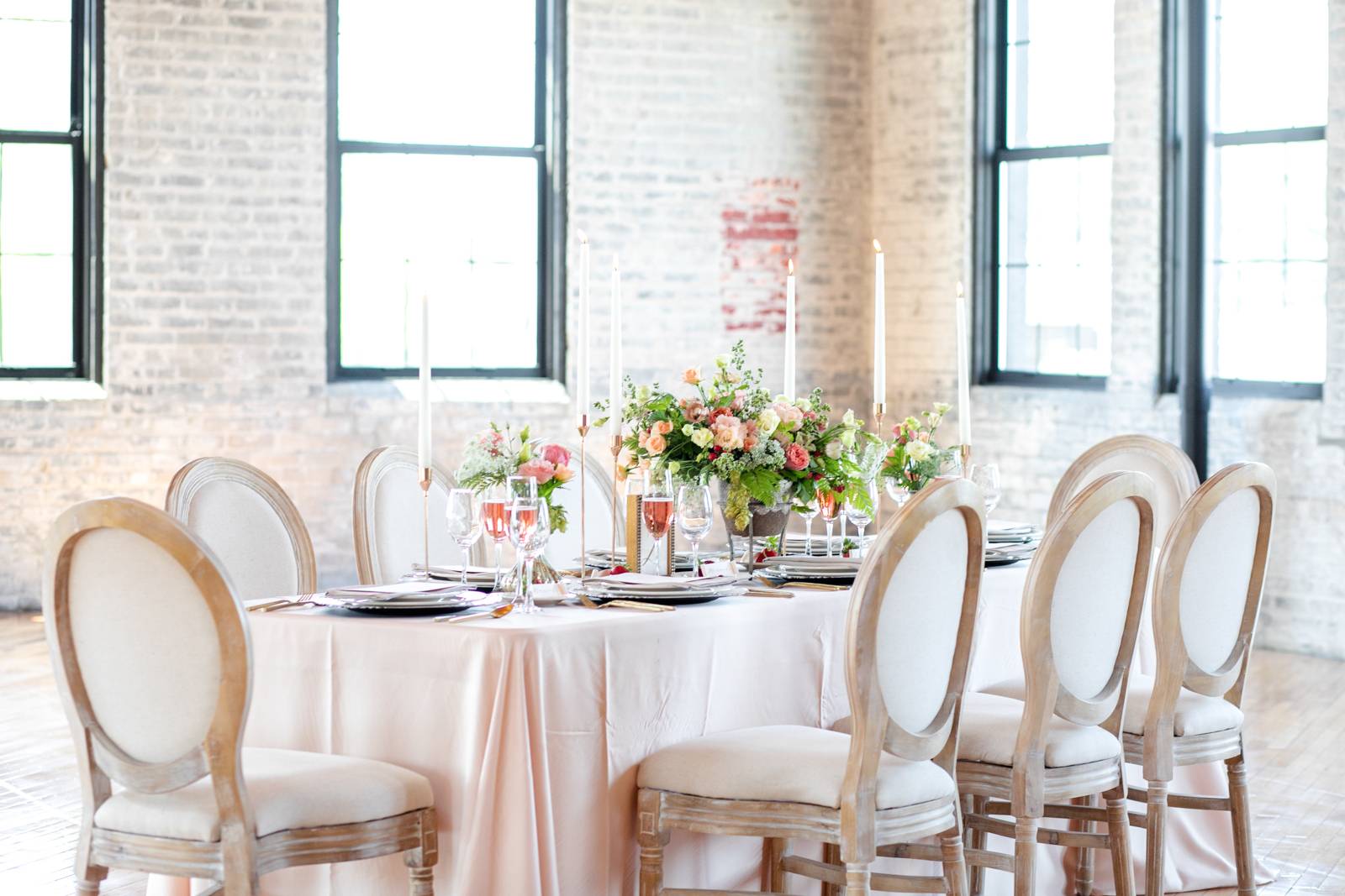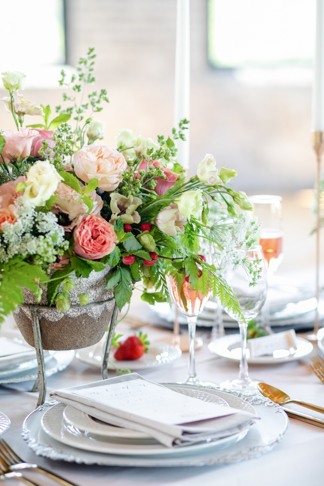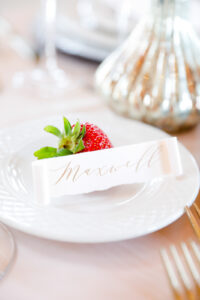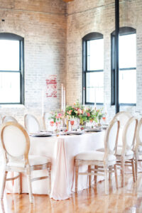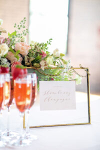 Featured on the cover of our 2020 Wedding Planner & Guide magazine, this stunning shoot designed and coordinated by LK Bridal Studio is one to impress. Held at the beautiful Willow & Oak Event Center, the goal of this design was to incorporate many textures with a soft and romantic color palette and strawberry accents. Captured by Temerity Photography, this gorgeous shoot includes gold-foiled paper goods from LK Bridal Studio, sweets by Curtis & Cake, extraordinary arrangements designed by Evoke Chancy Floral, and unique decor elements from both Event Essentials and A La Crate Vintage Rentals. Keep reading for some sweet, summery wedding inspiration!
