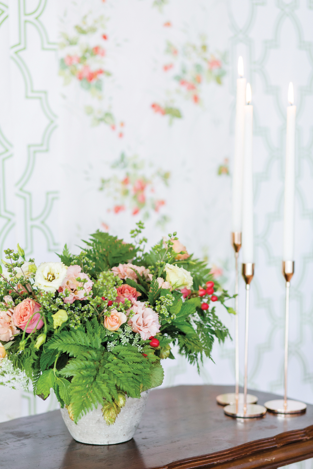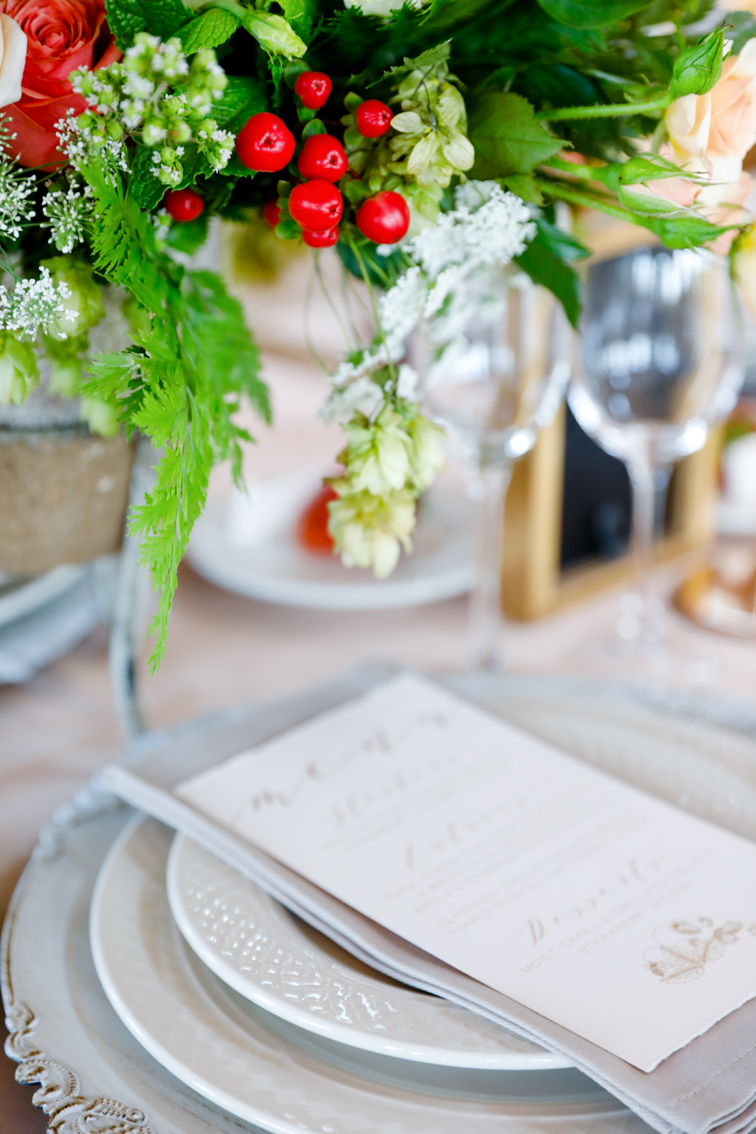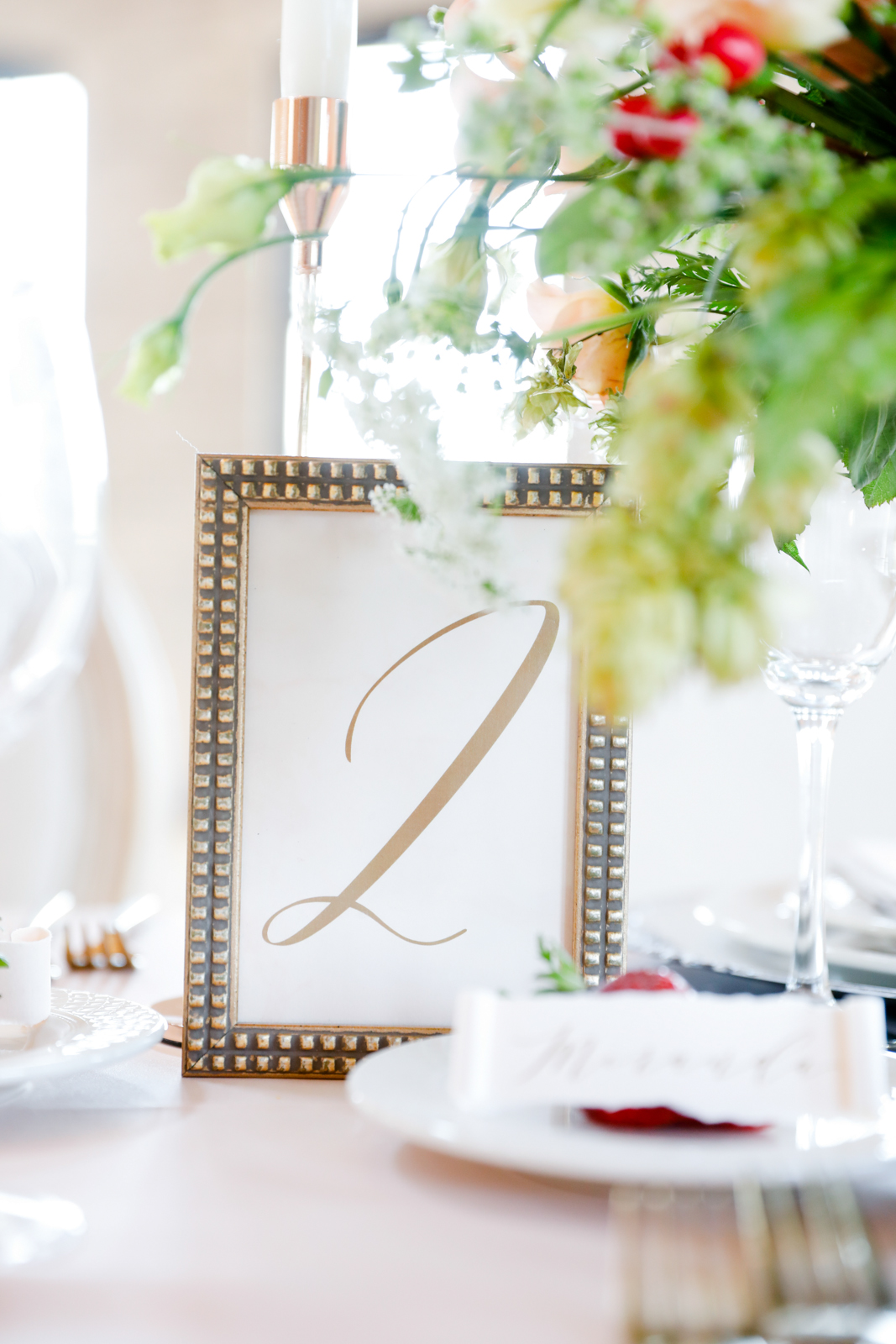Featured on the cover of our 2020 Wedding Planner & Guide magazine, this stunning shoot designed and coordinated by LK Bridal Studio is one to impress. Held at the beautiful Willow & Oak Event Center, the goal of this design was to incorporate many textures with a soft and romantic color palette and strawberry accents. Captured by Temerity Photography, this gorgeous shoot includes gold-foiled paper goods from LK Bridal Studio, sweets by Curtis & Cake, extraordinary arrangements designed by Evoke Chancy Floral, and unique decor elements from both Event Essentials and A La Crate Vintage Rentals. Keep reading for some sweet, summery wedding inspiration!