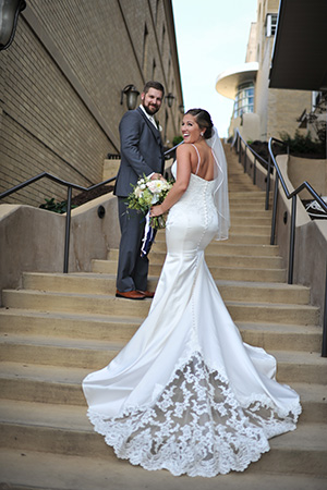 TELL US ABOUT YOUR DRESS: It was almost instantly the one when I tried it on. It was a satin and lace fit-and-flare, with oyster satin and ivory lace overlay on the bodice and a lace cutout/detail at the end of the train. Can I put photos in here?! I loved it so much.