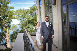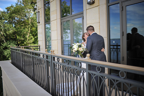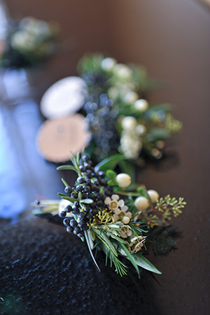 DID YOU USE ANY SPECIALTY CHAIRS, LINENS, CHARGERS, GLASSWARE OR DINNERWARE?  The chairs at the Edgewater were beautiful–gold cushion seats. We used a textured almond dupioni linens on the head table with a Moroccan runner, navy napkins atop glass and gold beaded chargers with a little sprig of rosemary on top!