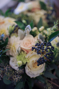 DESCRIBE YOUR WEDDING FLOWERS: Garden roses, ranunculus, spray roses and dahlia in neutral shades like white, ivory, and dusty rose, with whimsical greens like eucalyptus and juniper berries.