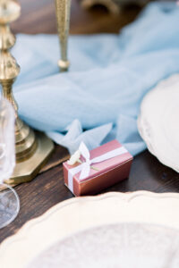 A gorgeous, 2-tiered cake from Hailey’s Sweets And Treats incorporated a naked cake top and sweater wrapped bottom. Various fresh fruit and florals styled throughout add vibrant pops of color. The collection of beautiful loose-leaf tea mixes from Telsaan Tea, along with a tea set, add a bit of romantic warmth to the display.