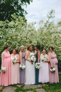 WHAT WAS YOUR WEDDING COLOR PALETTE? Each bridesmaid had a different shade that offset the lush greenery around our venue.
