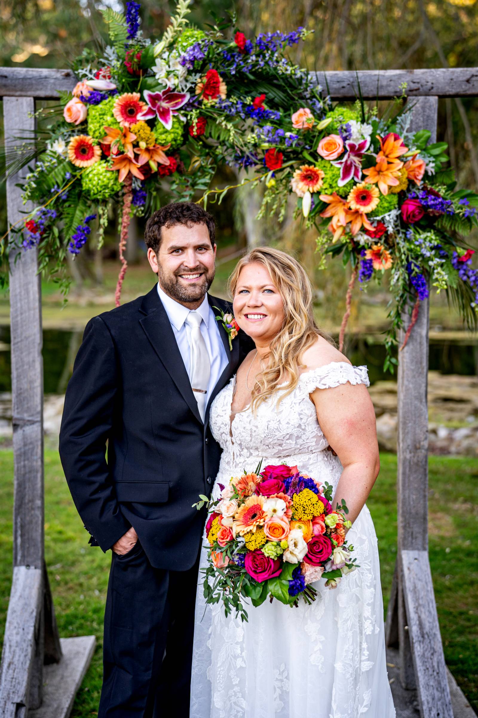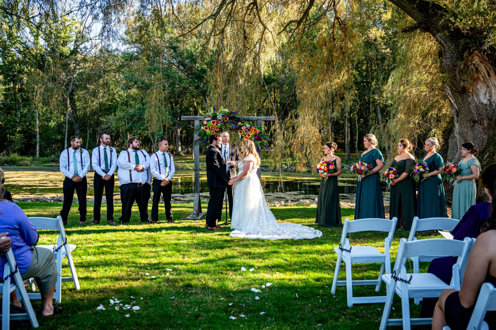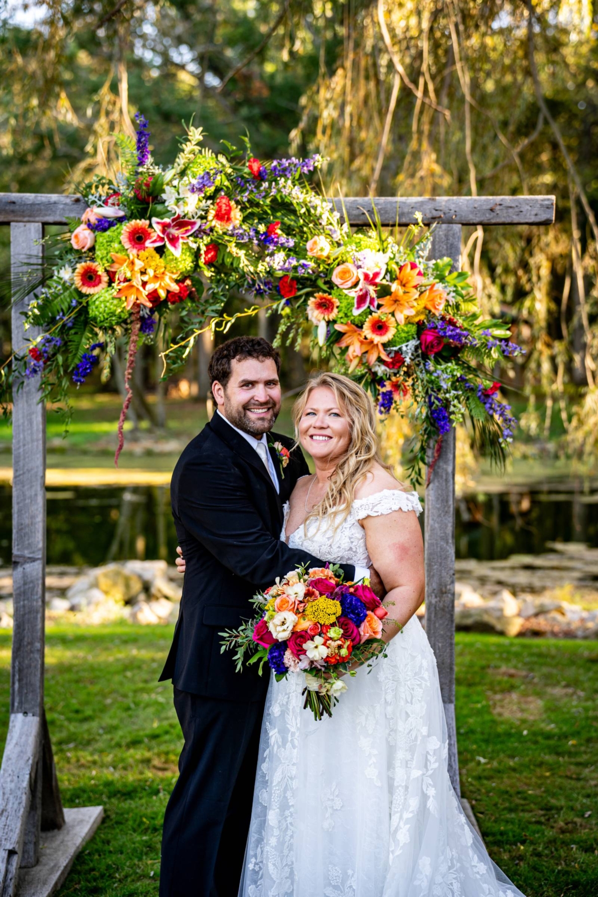 The couple exchanged vows beneath two willow trees, in front of a pond with swans swimming in it. Florist Diana Dreger Designs added bright, bold pops of color to the celebration with bouquets, floral boutonnieres, and installation pieces on the wooden ceremony backdrop.