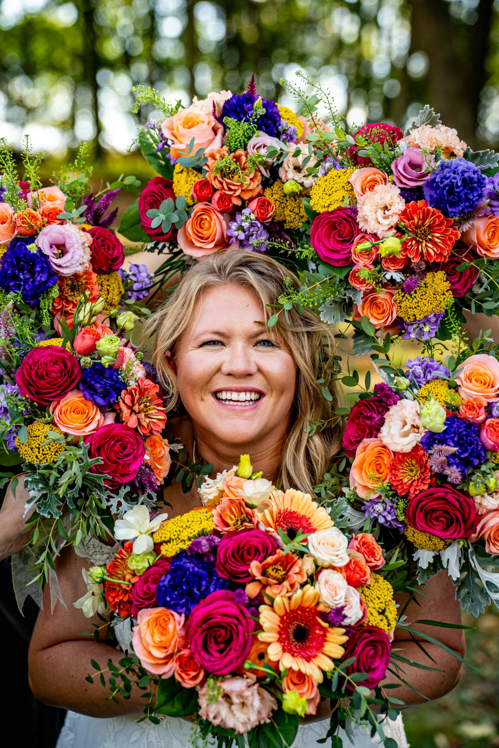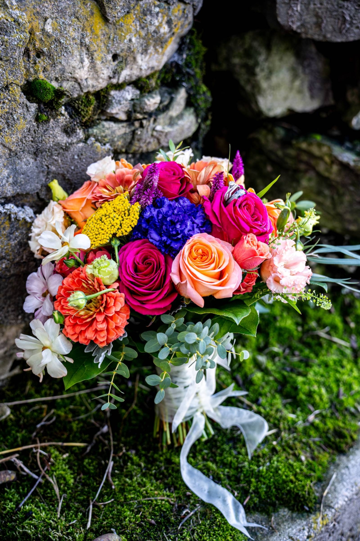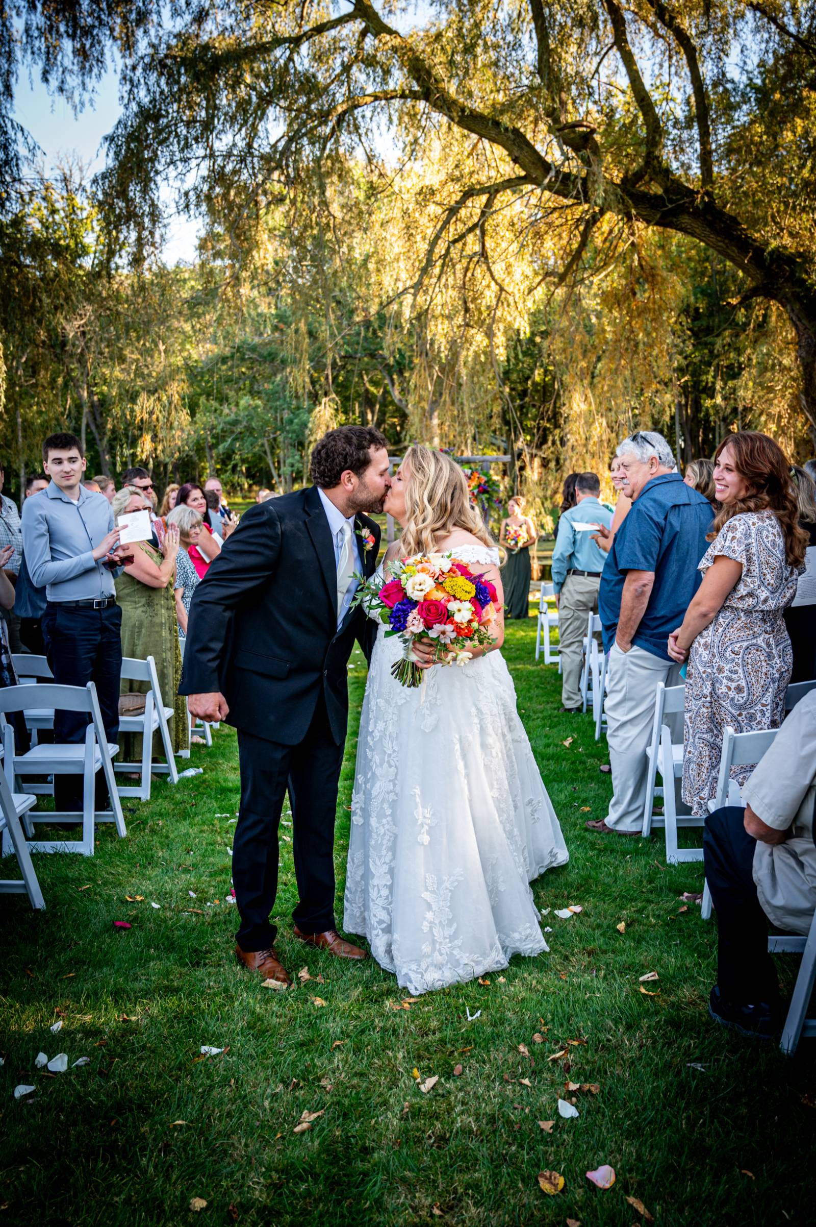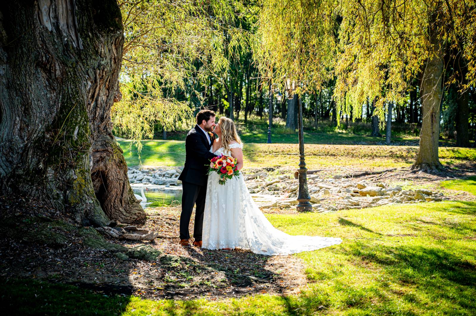 The couple exchanged vows beneath two willow trees, in front of a pond with swans swimming in it. Florist Diana Dreger Designs added bright, bold pops of color to the celebration with bouquets, floral boutonnieres, and installation pieces on the wooden ceremony backdrop.