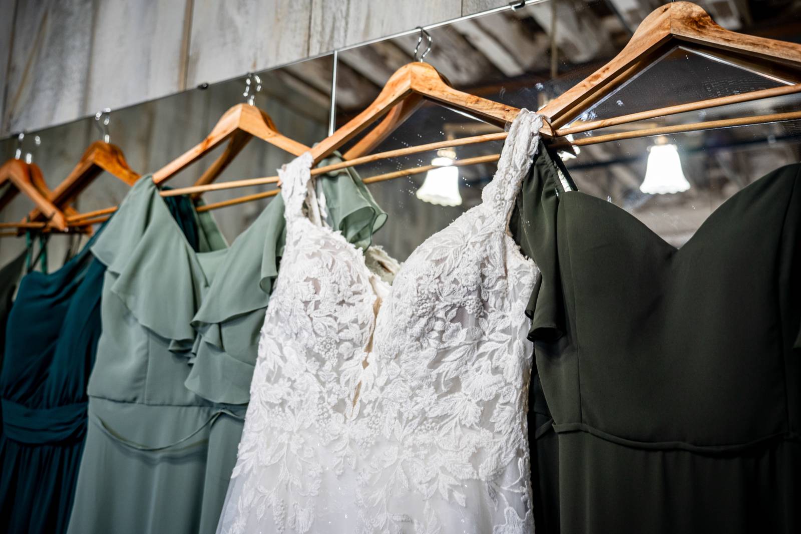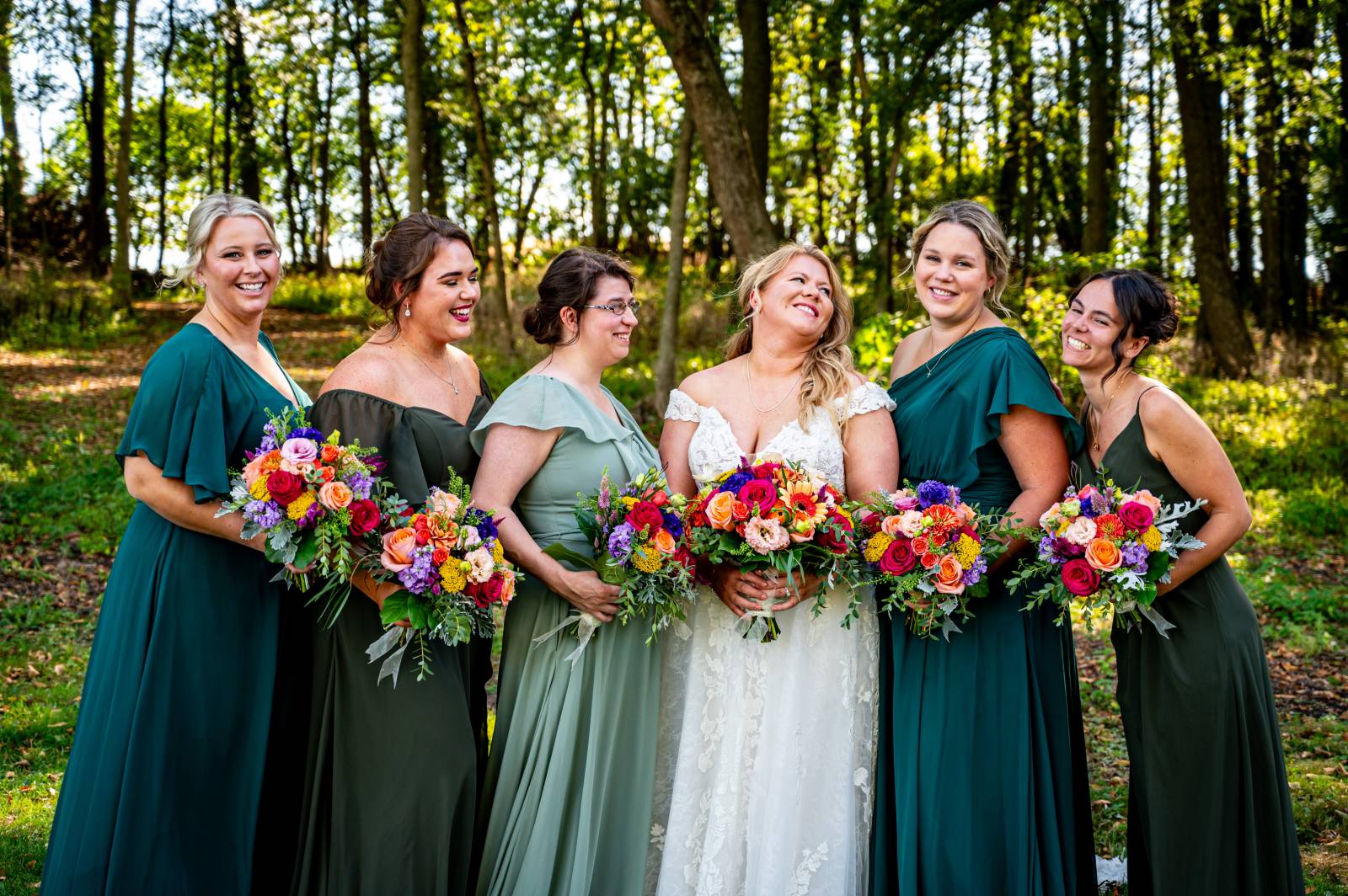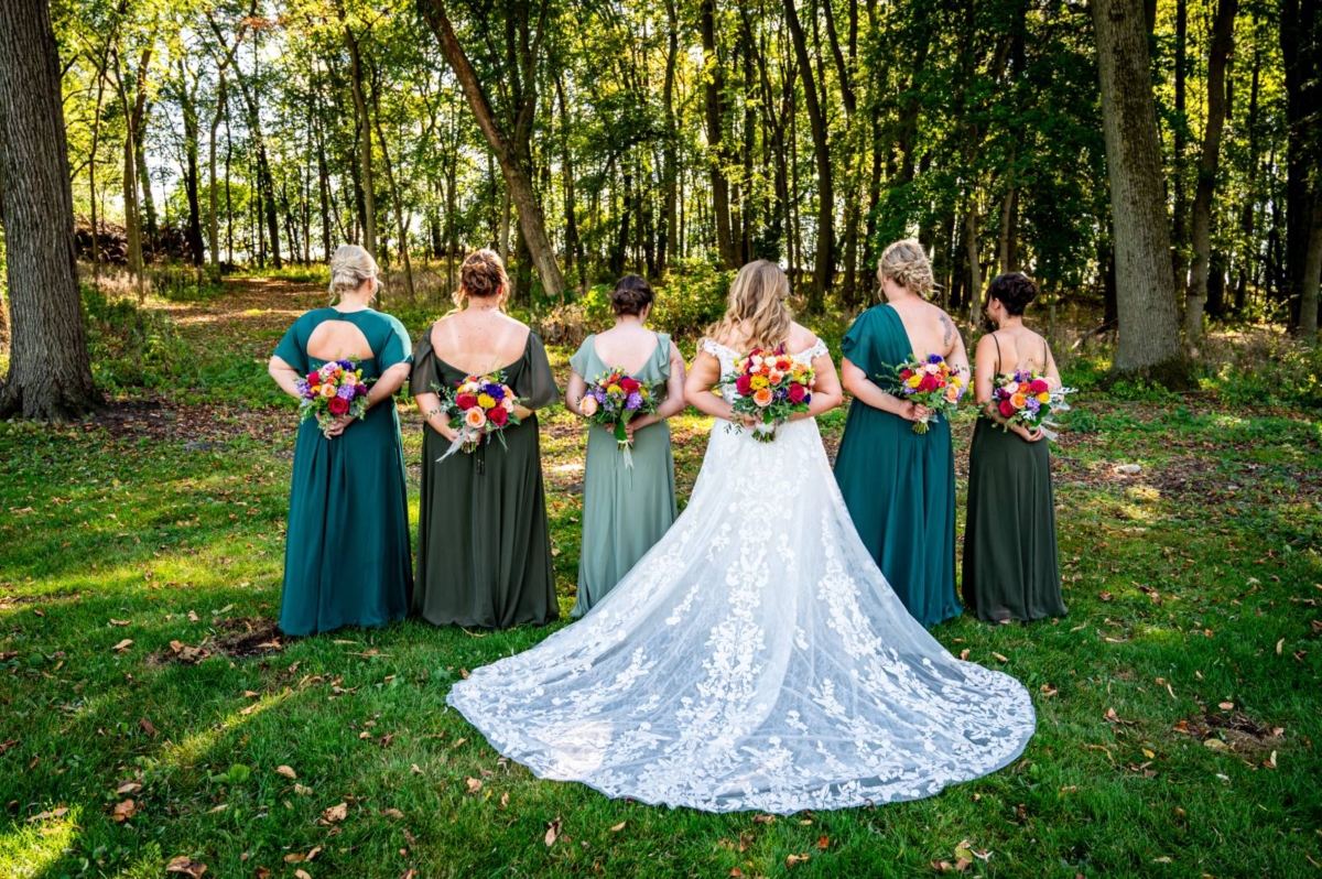 The base color palette for the wedding consisted of black, white, and various shades of green. Sydie’s bridesmaids wore unique yet coordinating gowns in green shades, ranging from forest green to sage and teal.