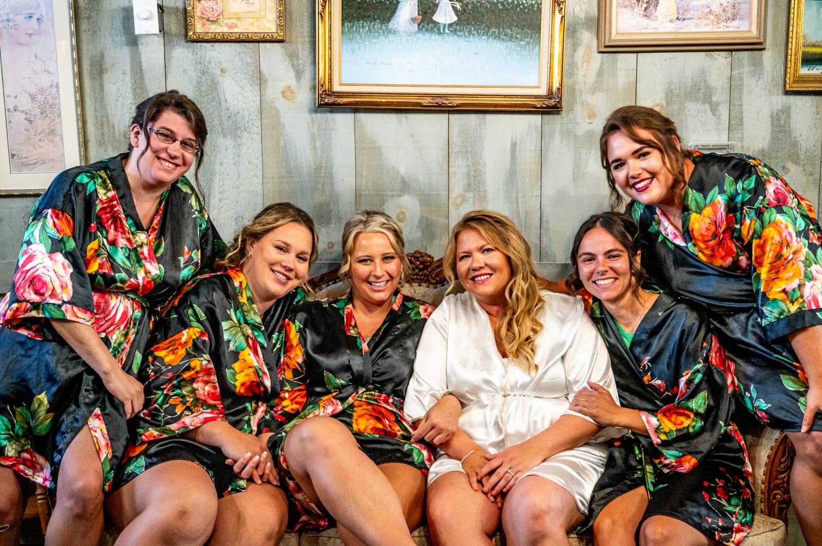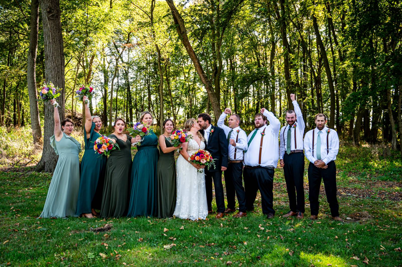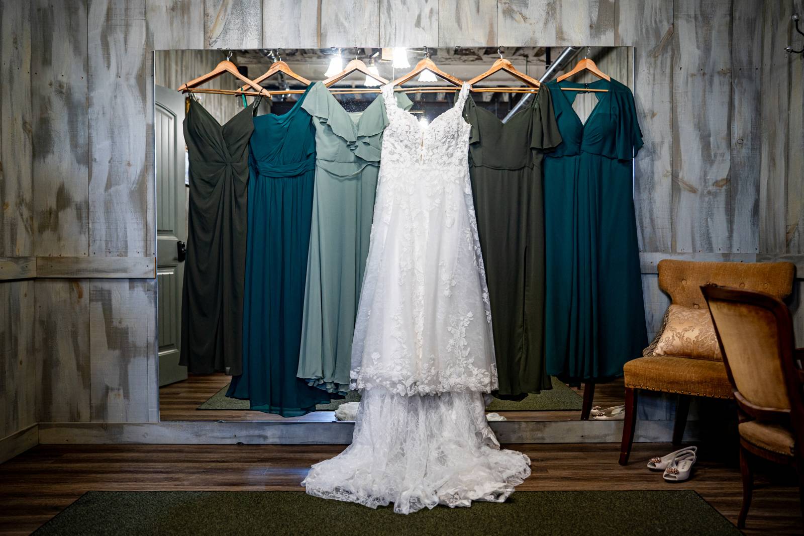 The base color palette for the wedding consisted of black, white, and various shades of green. Sydie’s bridesmaids wore unique yet coordinating gowns in green shades, ranging from forest green to sage and teal.