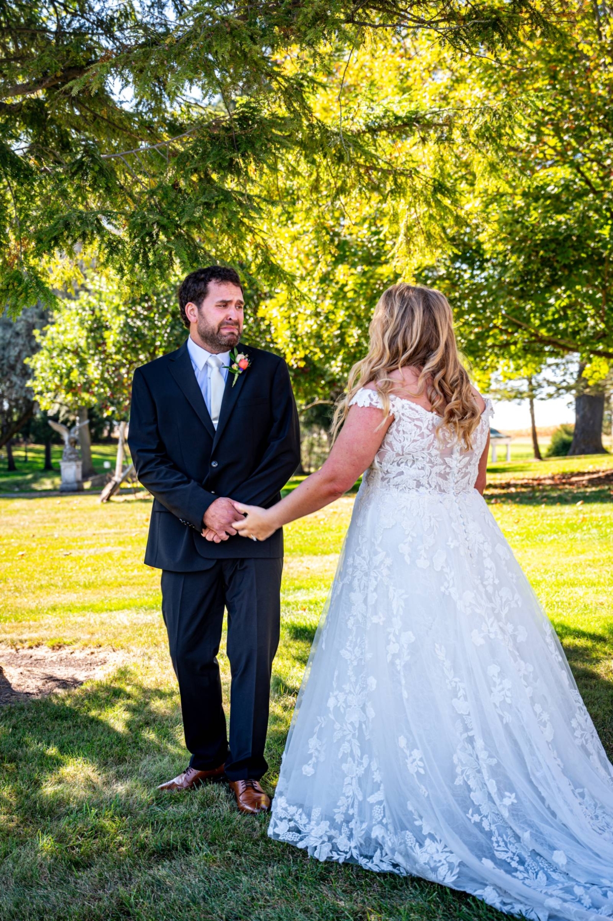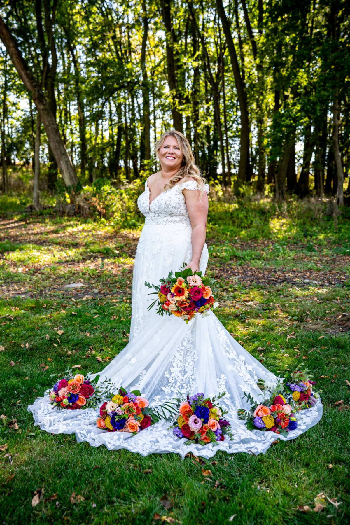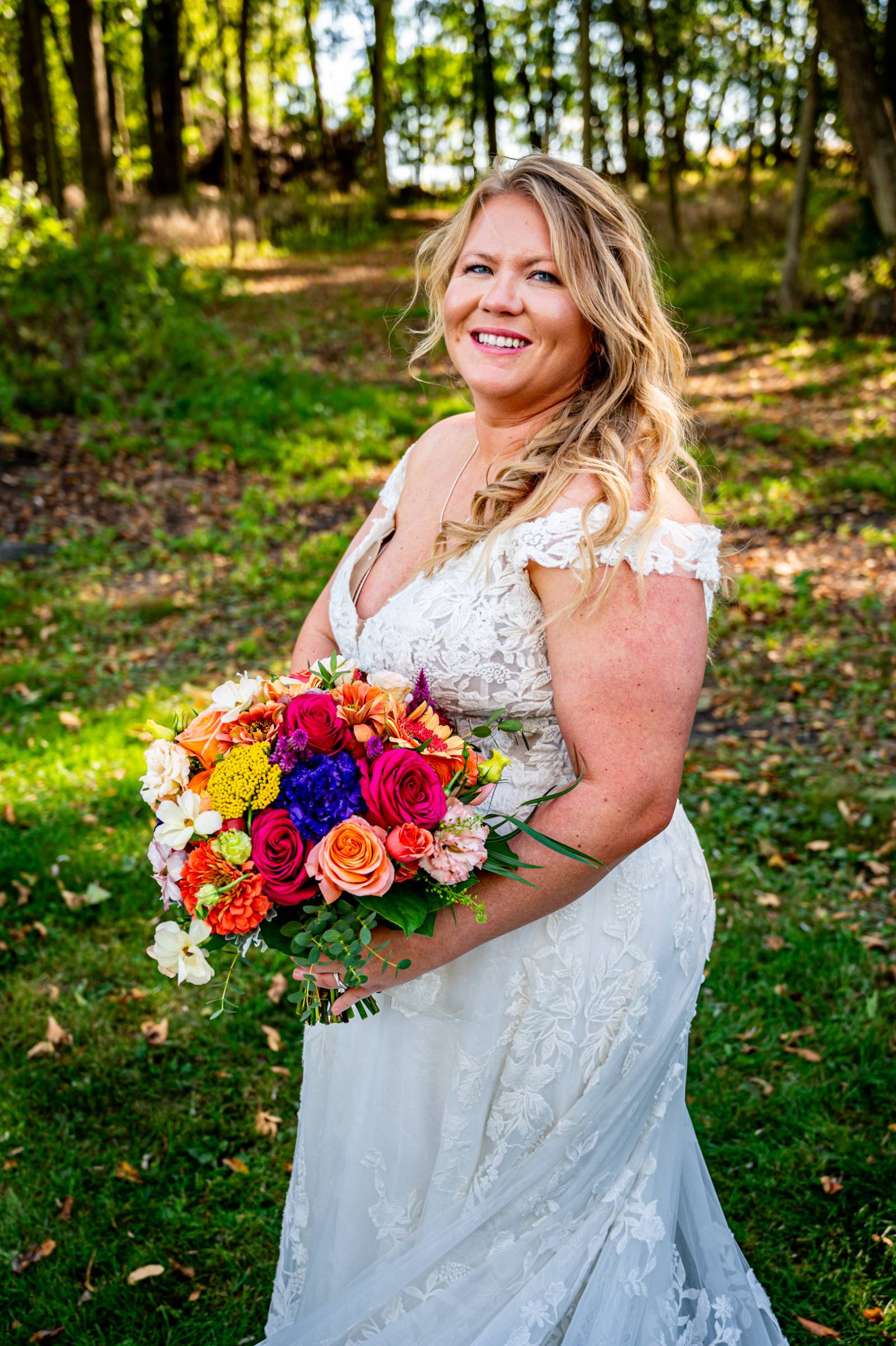 Sydnie’s dream dress from Amelishan Bridal was romantic and ethereal, featuring off-the-shoulder sleeves, a v-neck bodice, and sweeping tulle and lace detailing.